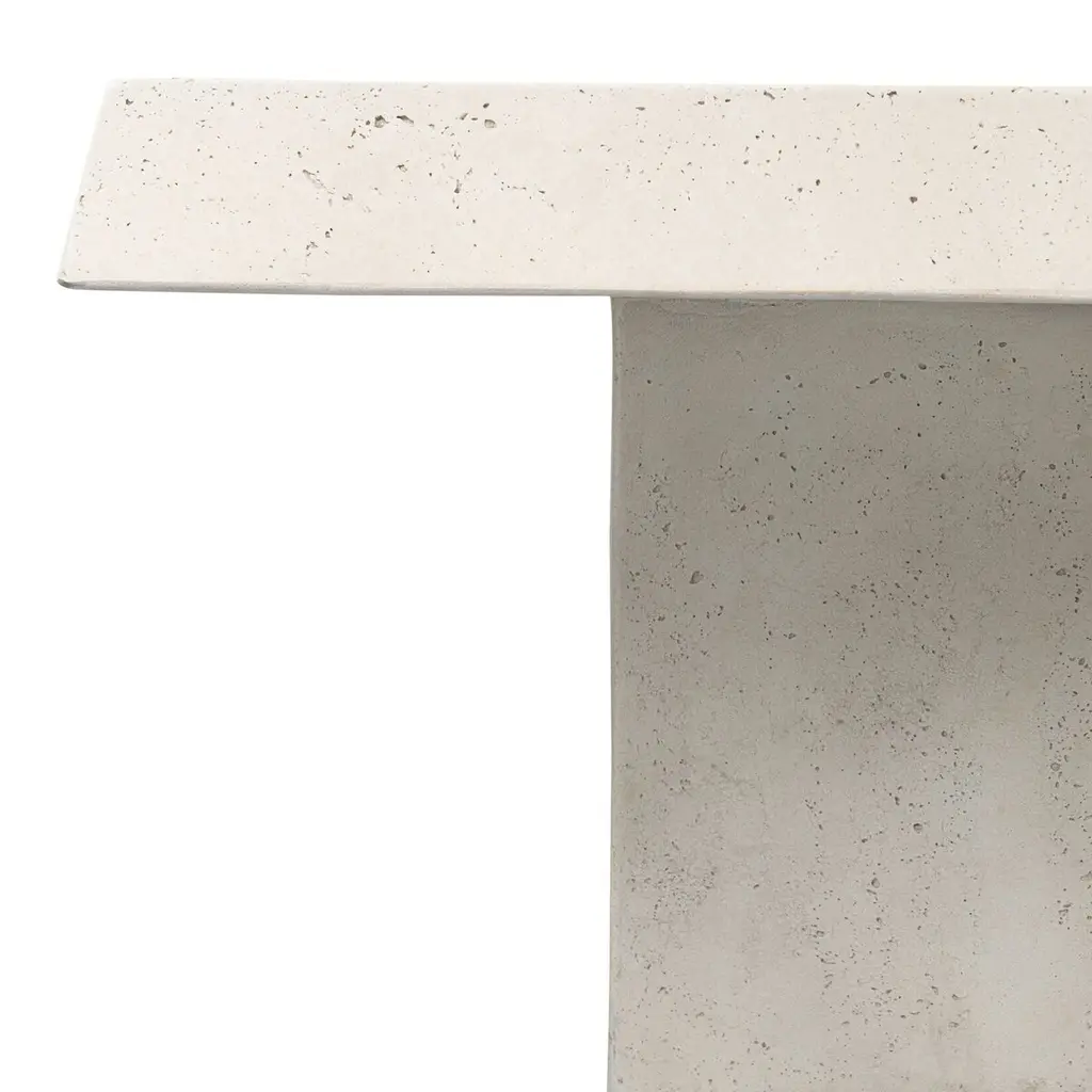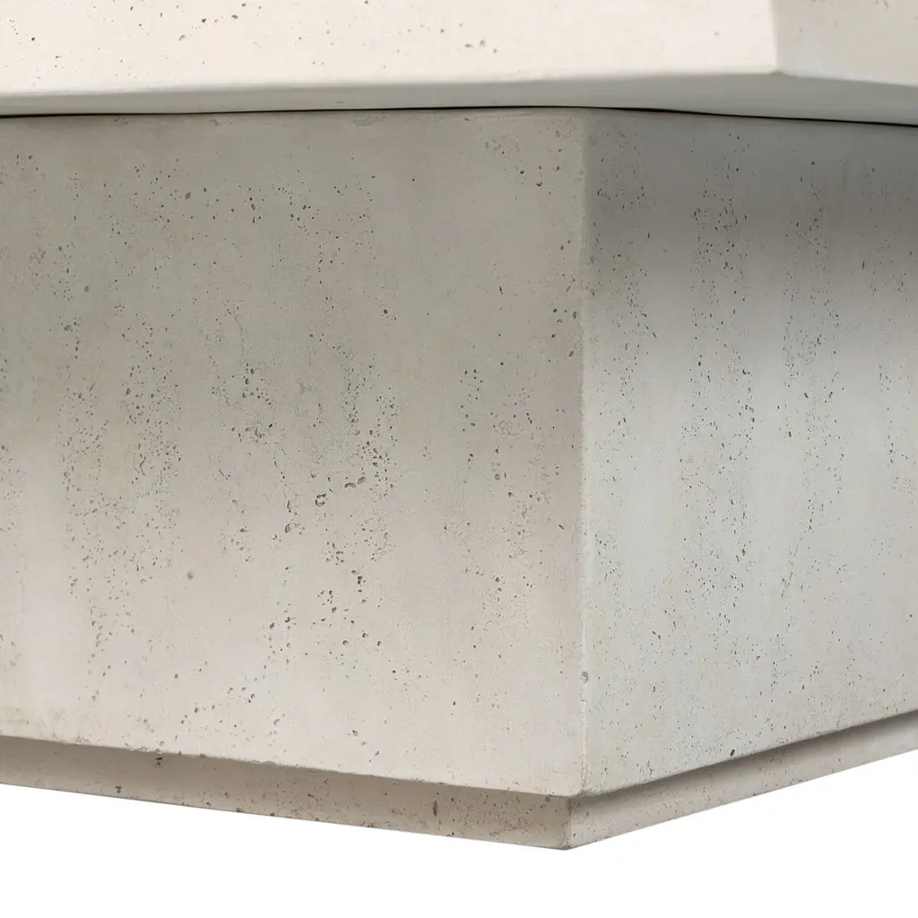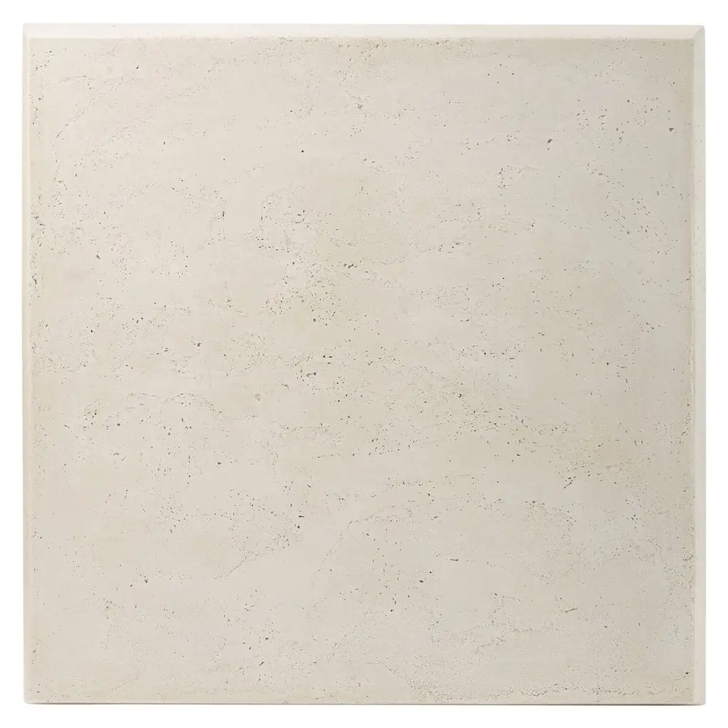 Simply shaped with a square pillar and subtle plinth base, this outdoor coffee table features a soft, parchment feel, complemented by a reverse bevel edge for visual intrigue. Cover or store indoors during inclement weather and when not in use.