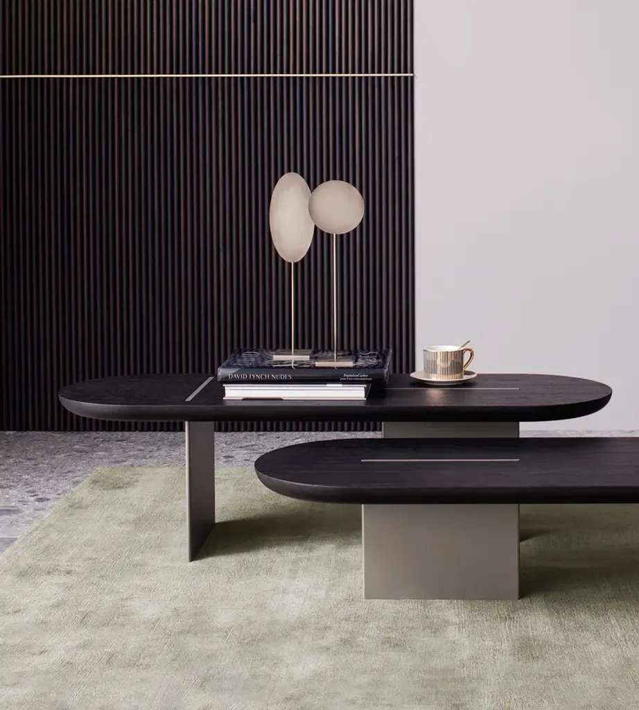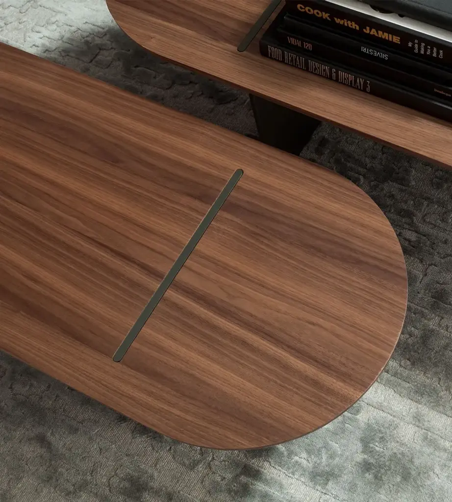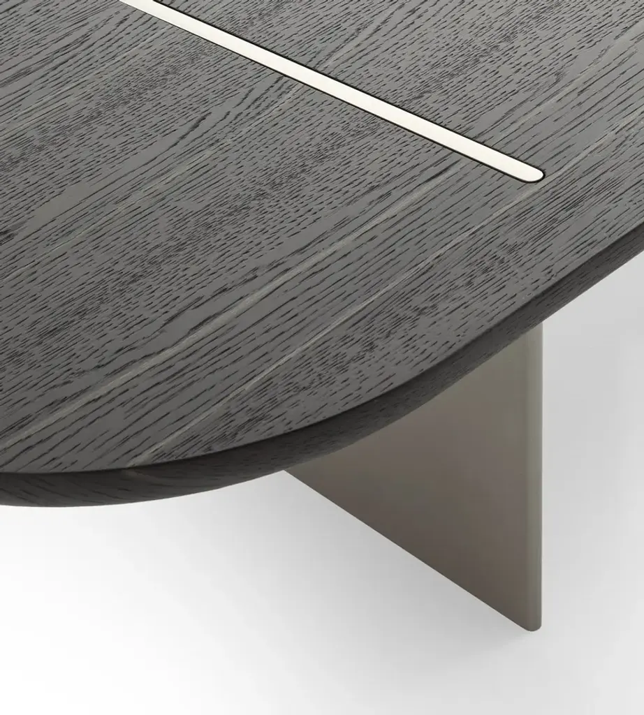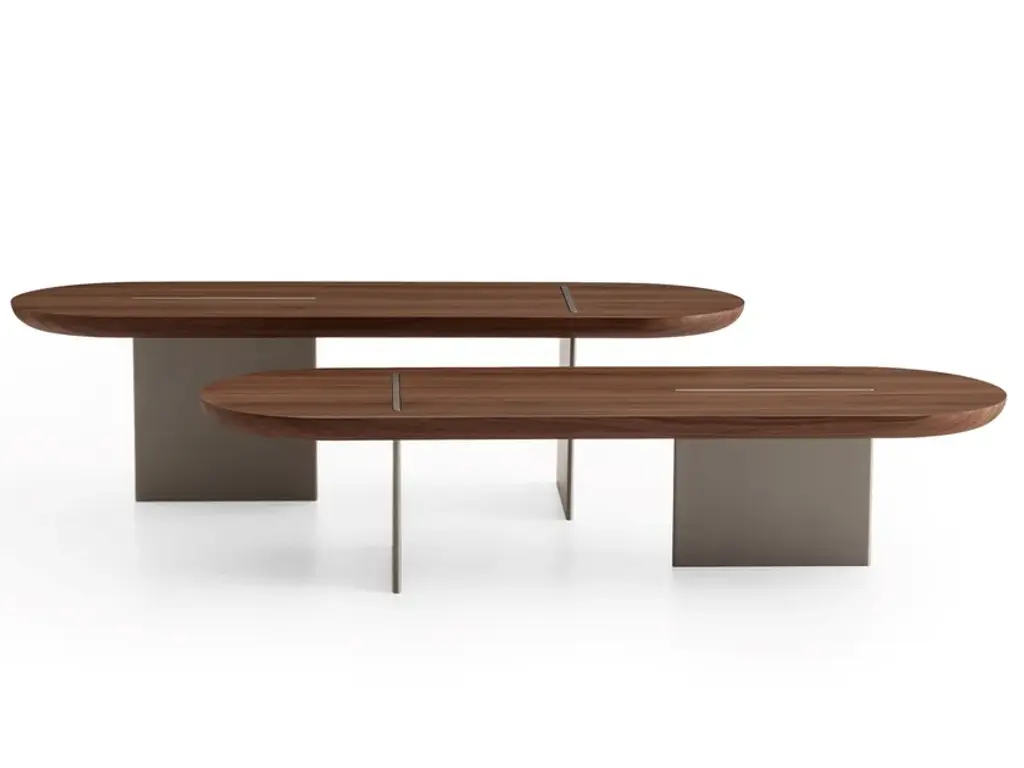 BAGUETTE is a coffee table with base in rounded, epoxy powder-coated metal and champagne finish. Top in shaped and rounded 40 mm MDF with Laguna sessile oak veneer, finished using low environmental impact varnishes. Available in two sizes.Available in finishes:Lagoon oak: code HM.BAG.DP.RL.MC / cod. HM.BAG.DM.RL.MCCanaletto walnut: cod. HM.BAG.DM.NC.MC / cod. HM.BAG.DM.NC.MCHaute Couture gets its inspiration from high fashion, where stitching, workmanship and materials are at the core of the design. Dressers are outfitted using hand-crafted leather, the furniture is embellished using precious marble, and the wood is selected on the basis of its grain. The synthesis of this collection is a modern line with a contemporary slant that is embodied in a luxury that is not overly flashy but grounded in sophistication. Timeless products made with high quality materials and handcrafted in Italy.