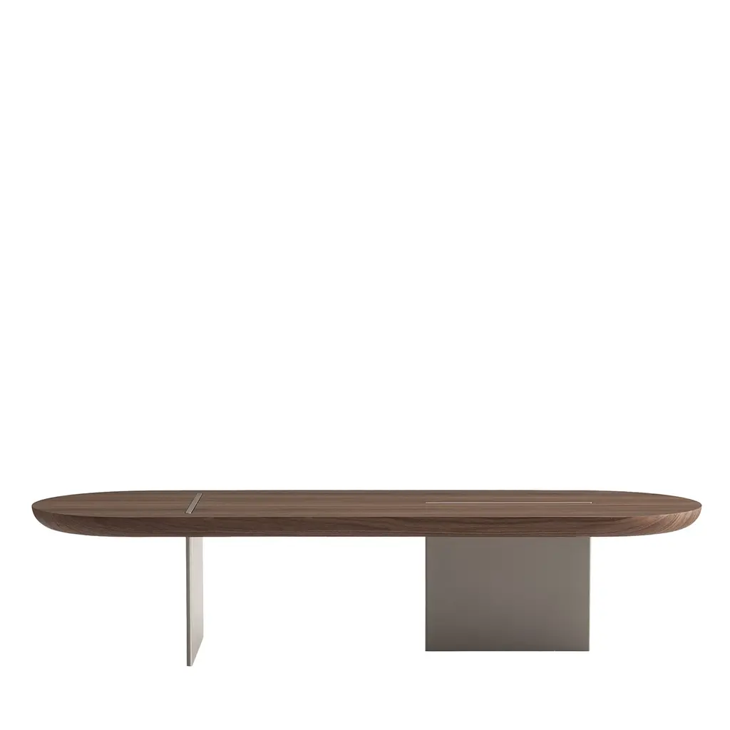 An elongated MDF top with rounded extremities, veneered in precious Canaletto walnut, and featuring a blunted profile is the element explaining the reason this design is named after the typical French baguette. It includes a sculptural and airy base consisting of a couple of orthogonal champagne-hued metal sheets varnished with epoxy powders.