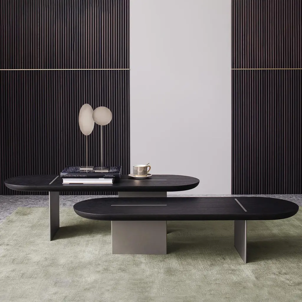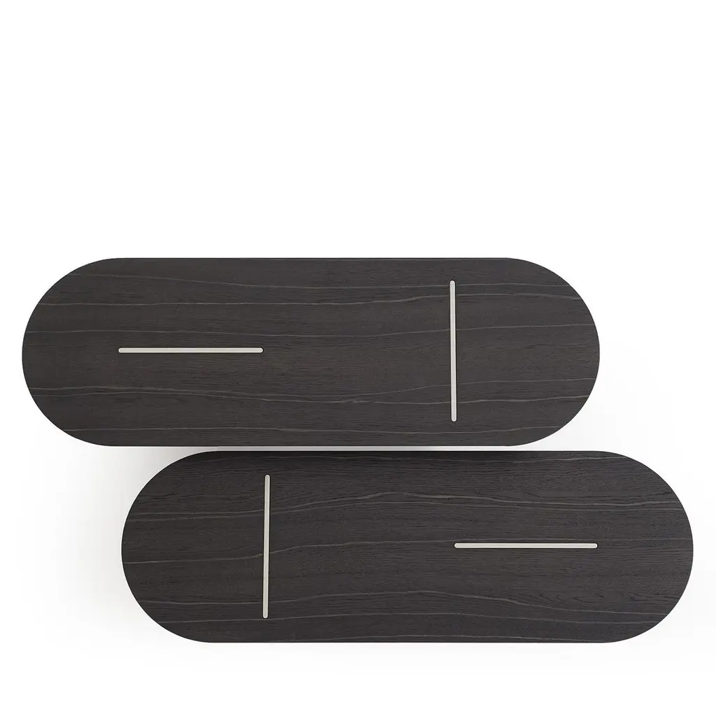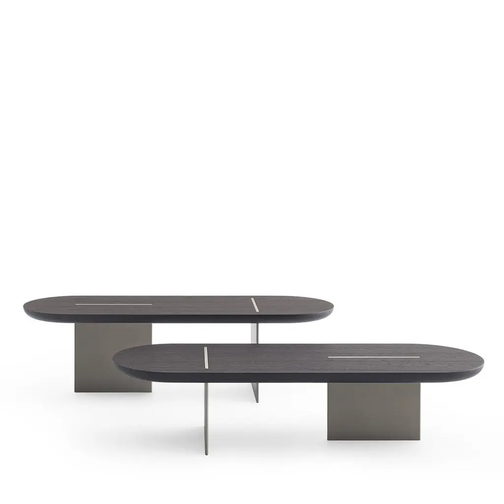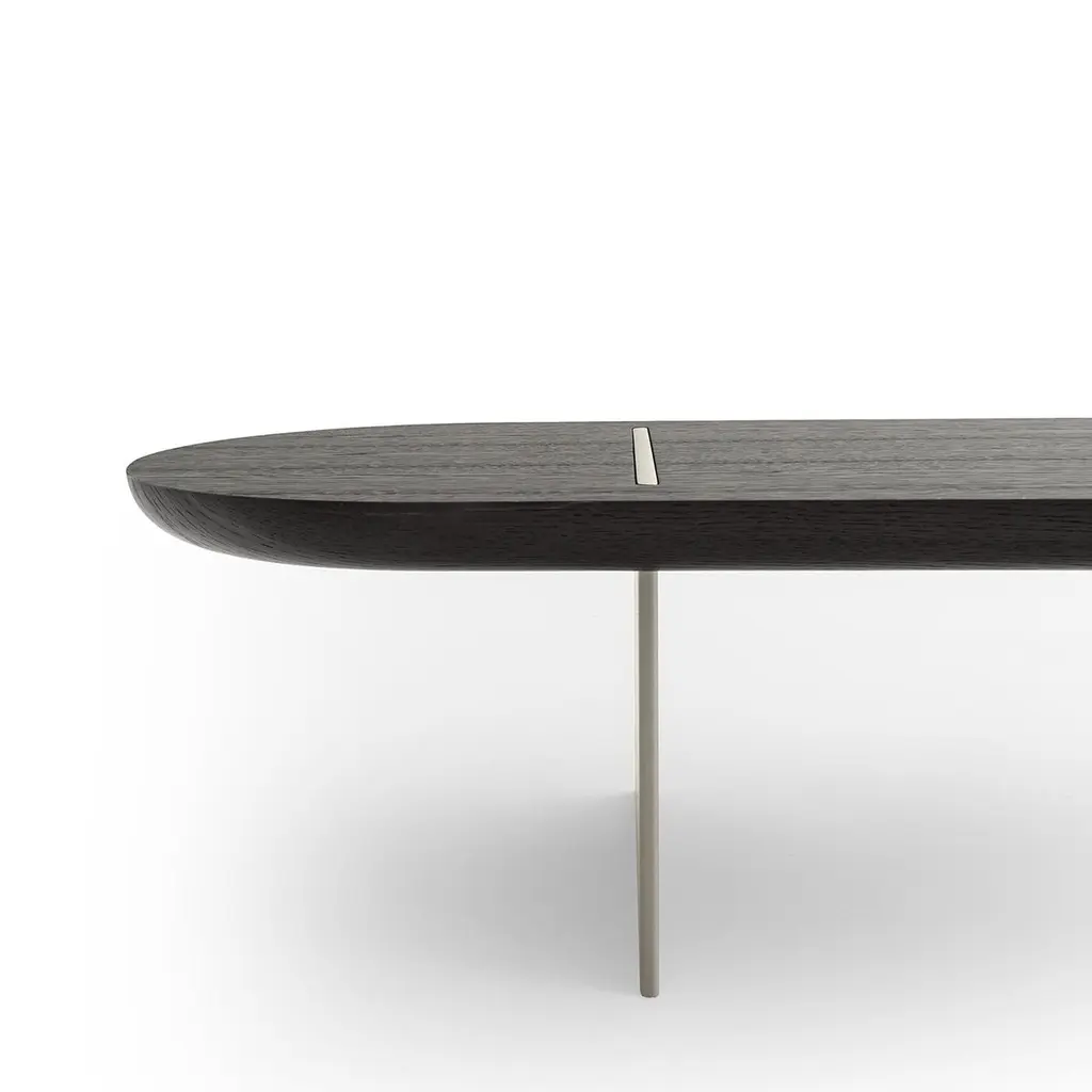 An elongated, rounded MDF top with blunted borders and veneered with Laguna oak reveals the French baguette inspiration behind this coffee table. Raised on orthogonal metal sheets - epoxy-powder-varnished in champagne - for a graceful sculptural base, the top is finally finished with low environmental-impact varnishes. A lower version is available in the Artemest catalog.