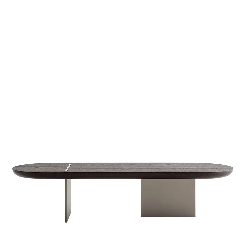 150An elongated, rounded MDF top with blunted borders and veneered with Laguna oak reveals the French baguette inspiration behind this coffee table. Raised on orthogonal metal sheets - epoxy-powder-varnished in champagne - for a graceful sculptural base, the top is finally finished with low environmental-impact varnishes. A lower version is available in the Artemest catalog.