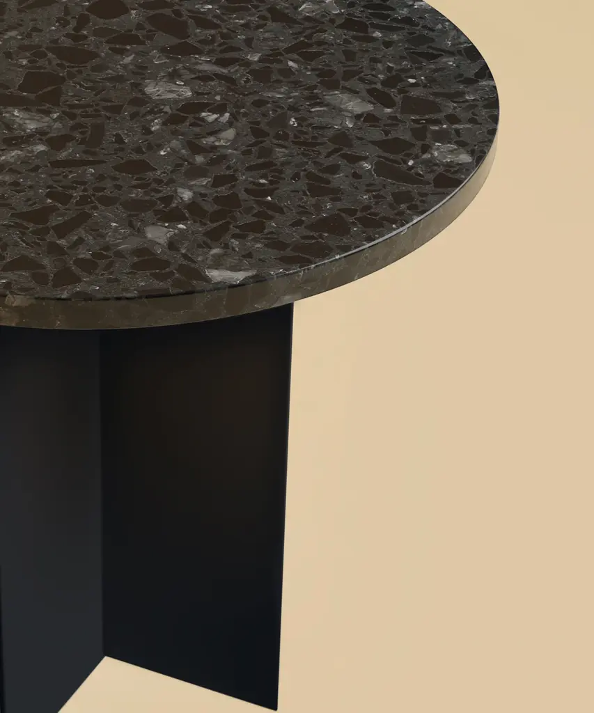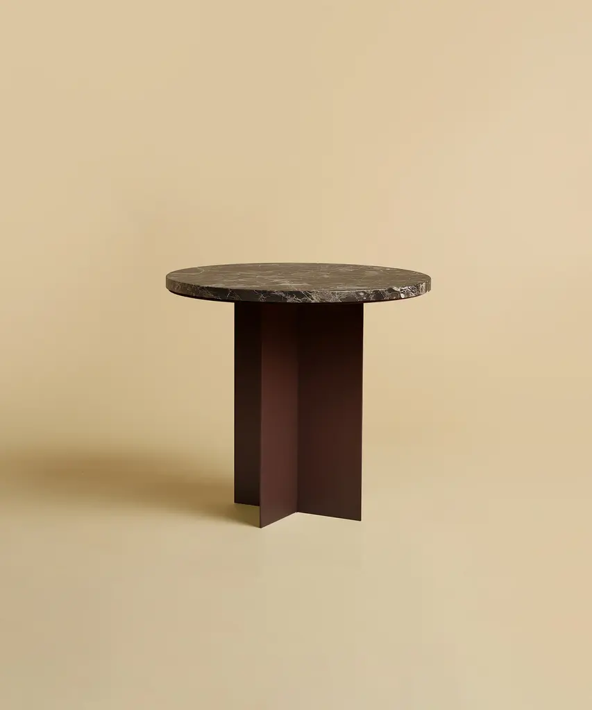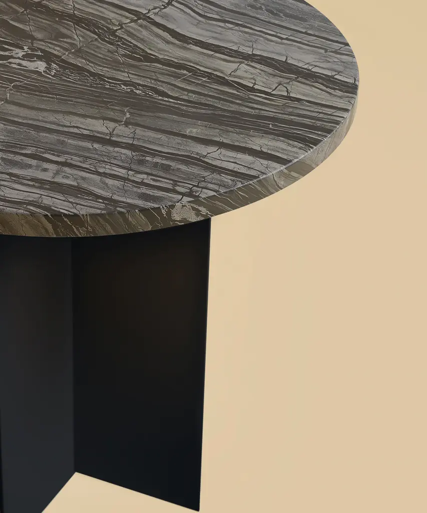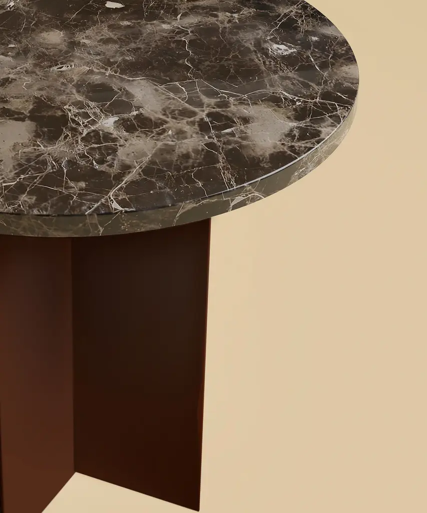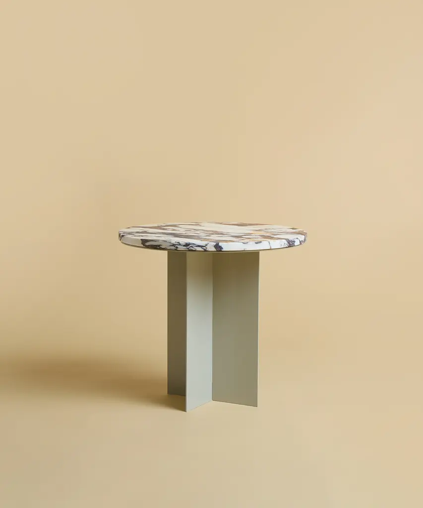 The Baker coffee table is produced with a powder-coated metal base and a top in Calacatta Violet marble. The top is circular and has a diameter of 17,7 inches, while the base is obtained by manually welding metal plates perpendicular to each other.Founded by Emanuela Terraneo and Alessandro Pozzi, Lebanto designs and produces modern and refined furniture in Cantù, Italy.