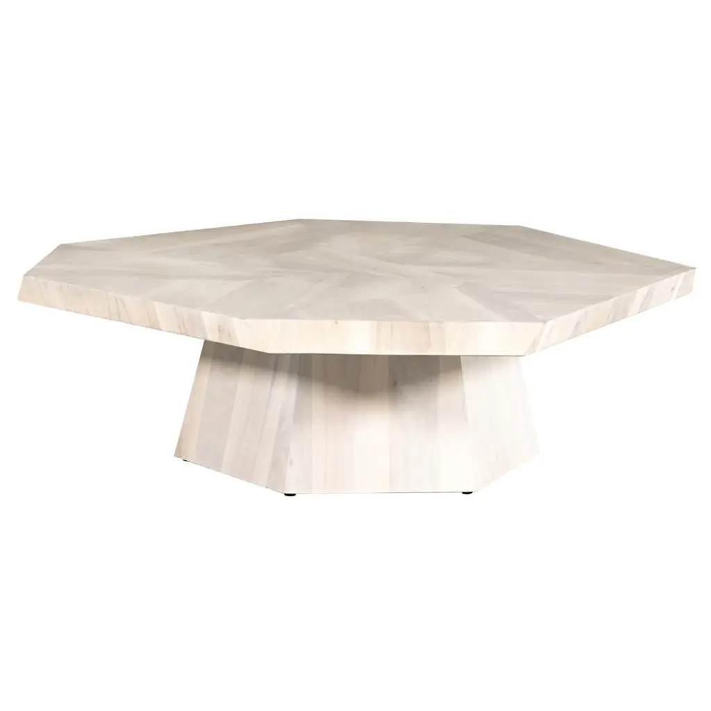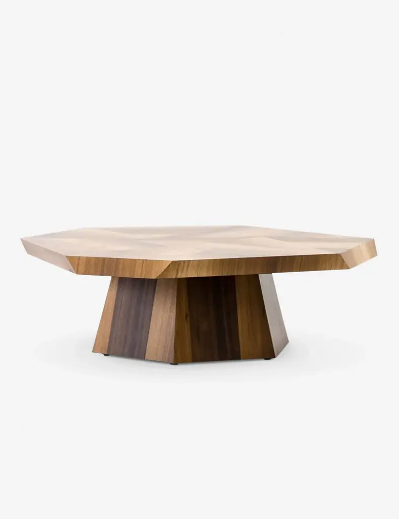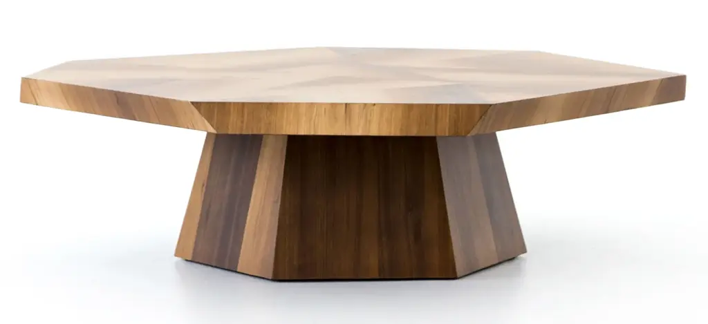 Bring the beauty of geometry (with a natural touch) into your modern living room. This unique coffee table features an octagon-shaped top and base with a faceted design in solid wood.