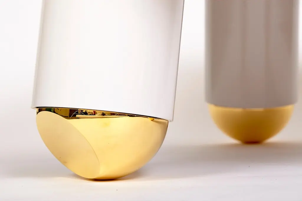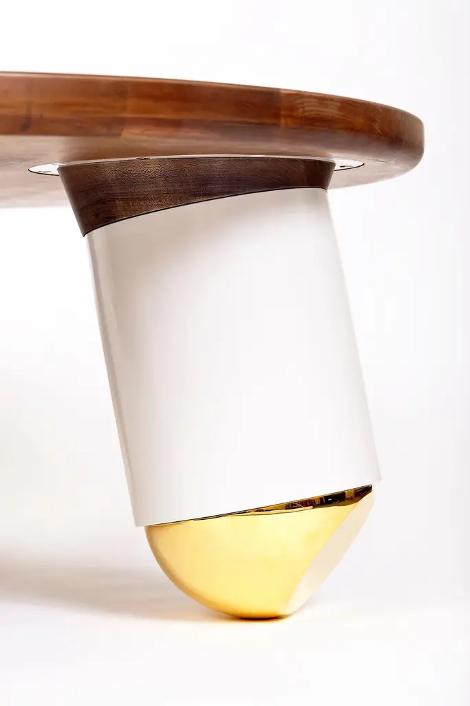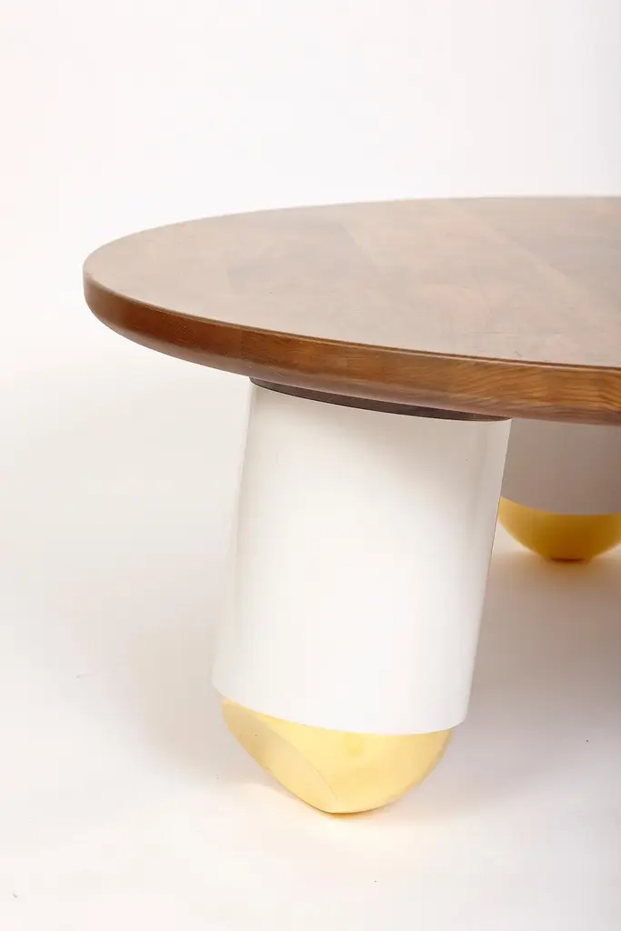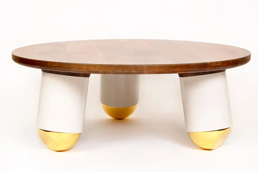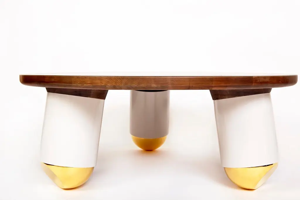 The ball nose coffee table was completely inspired by the geometry in Evan's surroundings. In this case a children's playground was the genesis of the idea. Evan goes on to describe his process, " I suppose watching after a kid on the playground forces you to be hyper aware of your surroundings. Without a doubt, being engaged in play with a child makes you see things differently than normal." The simple geometric shapes of the municipal play equipment influenced him because of their focus on functionality rather than conceptual design. Unexpected beauty inspires Crane above all else. Continuing the whimsical theme with his choice of materials, the unexpected combination of solid oxidized maple and gold plated feet play exuberantly together, like best friends on the playground that inspired this unique piece.