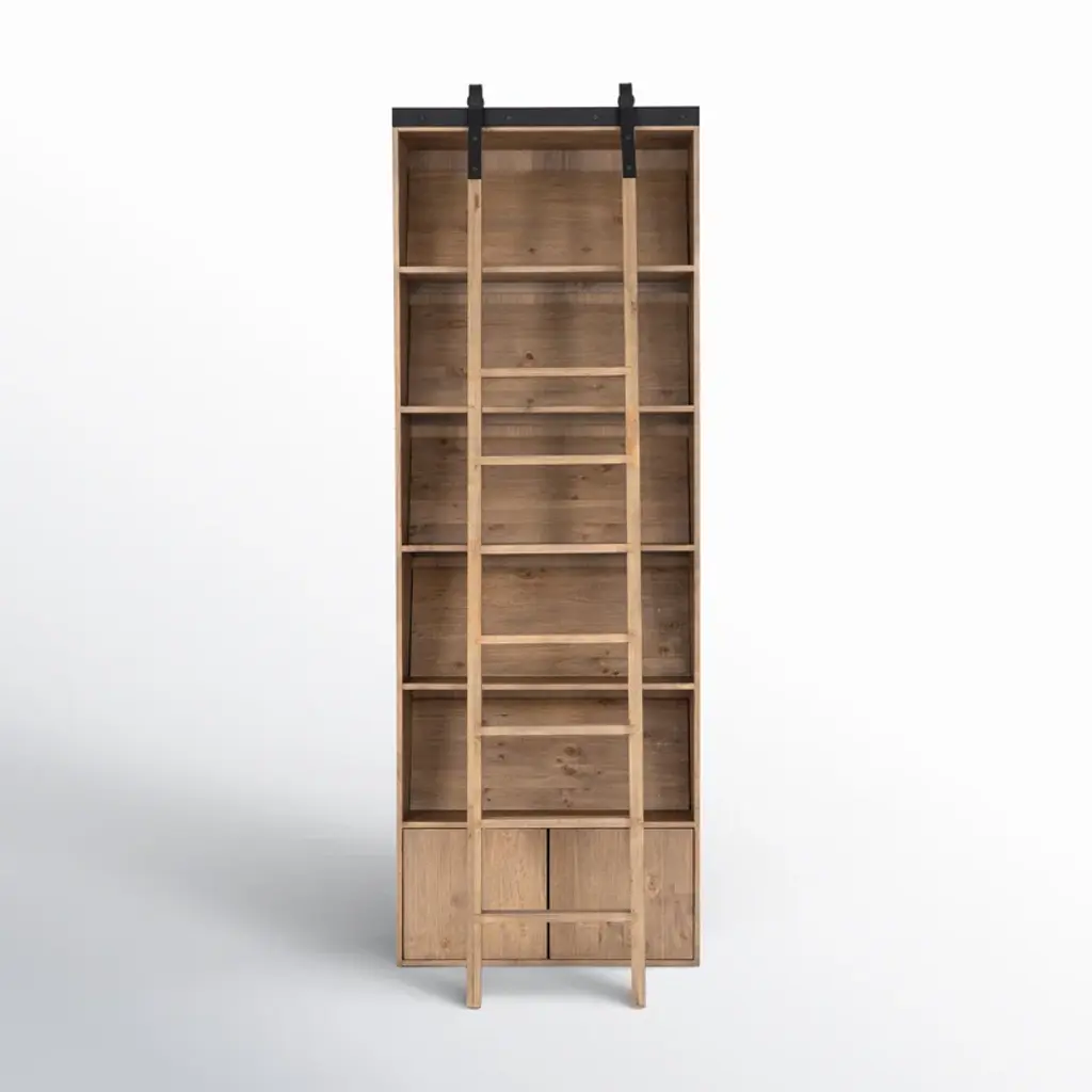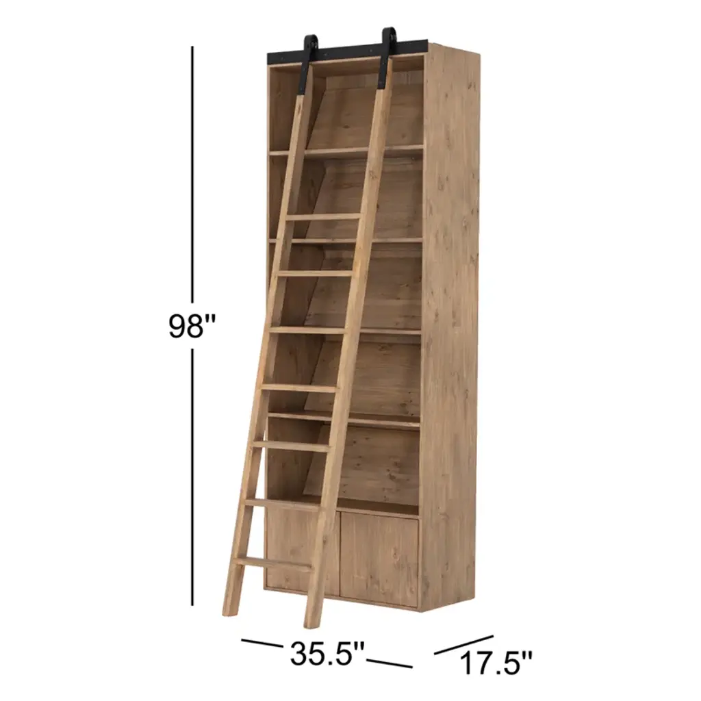 Made from smoked solid pine, five spacious shelves are ready to store favorite books and treasures. Removable ledges slant at an angle on each shelf, for an even better display of art- and coffee table-size books, plus a decorative-only slide ladder.