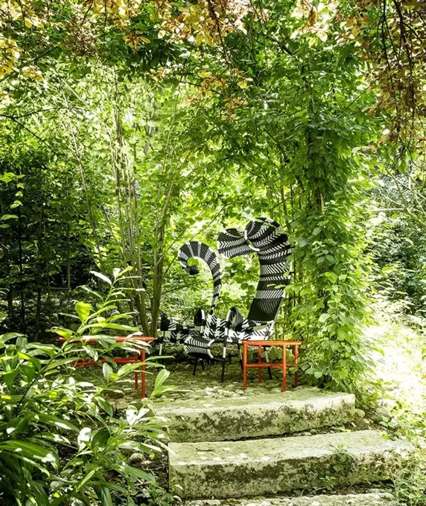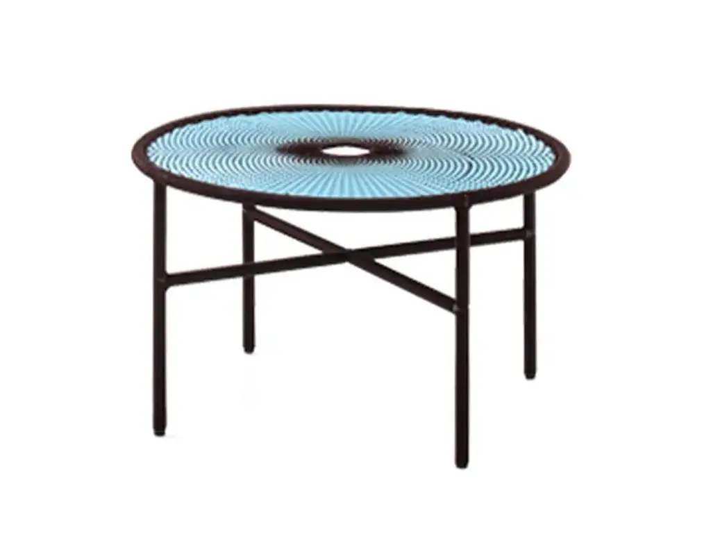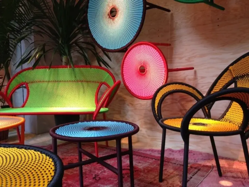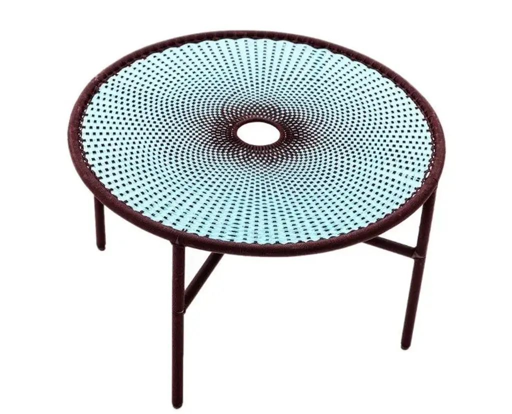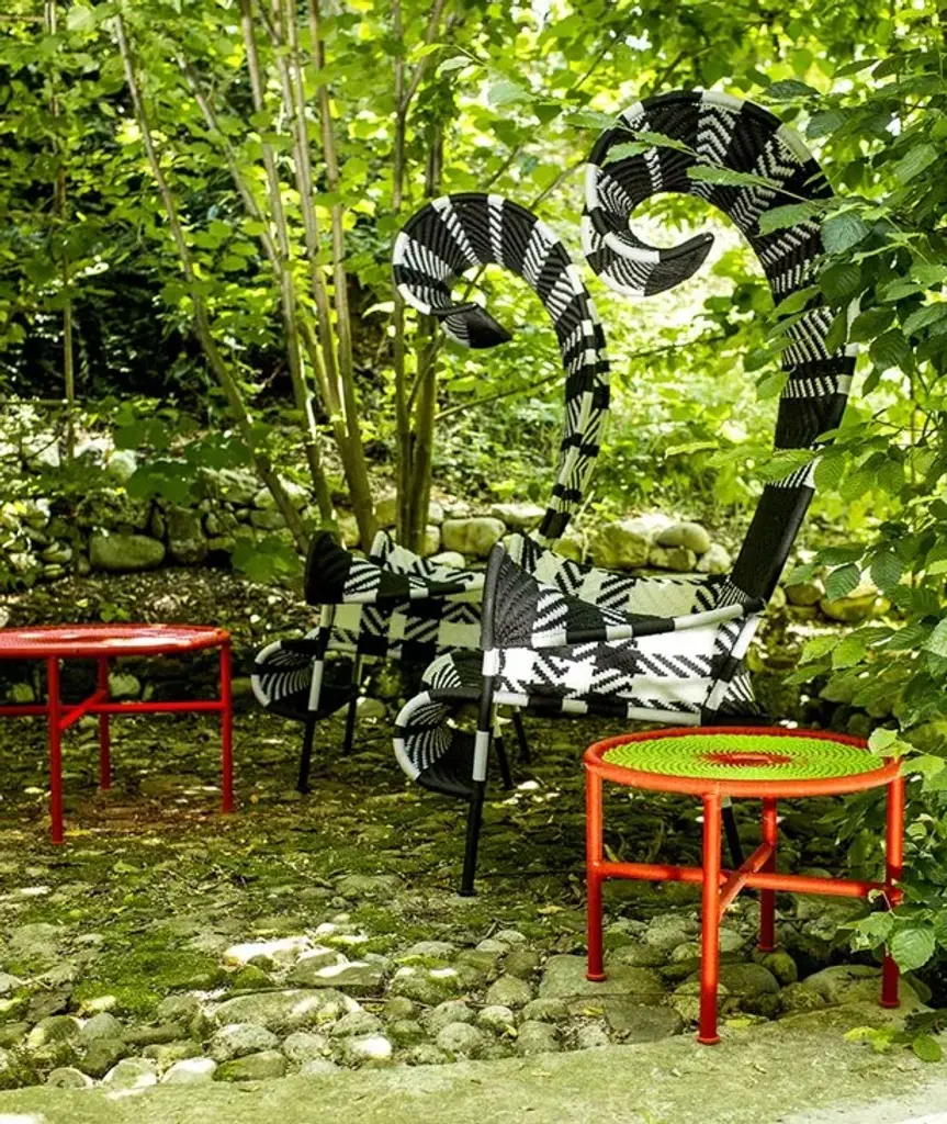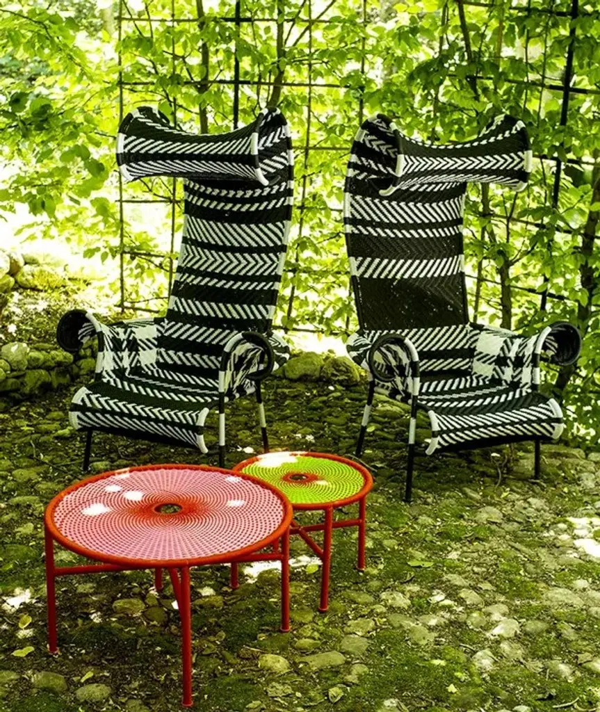 Banjooli is part of M’Afrique, a range of chairs conceived by the designer and produced by African craft weavers using the yarn of fishing nets. The designs are all different and original, like their names. Hand-woven, they are human in their perfections and flaw.Low table with painted steel base and colored polyethylene threads handwoven; on PVC glides.