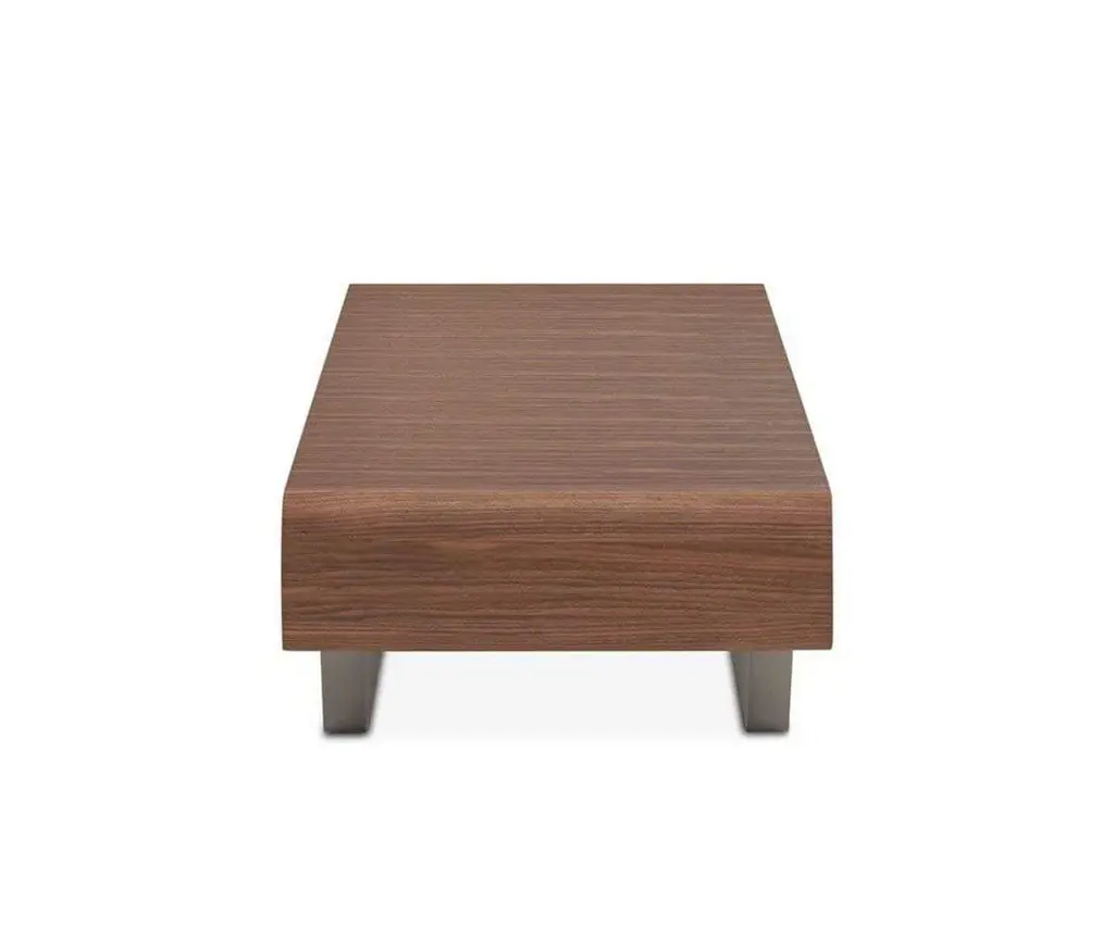 Wood and metal complement each other handsomely in the Baptisia Coffee Table. Truly contemporary, it provides storage and display space while resembling a work of modern art. Together, the beautiful wood grain finish, distinctive shape and stainless steel legs make this accent table a true conversation piece. *The cherry finish will be lighter in color when new, and may enrich with age.
