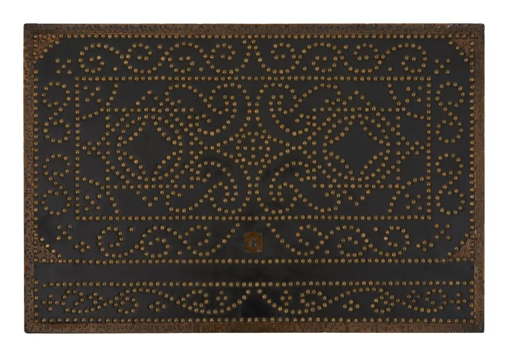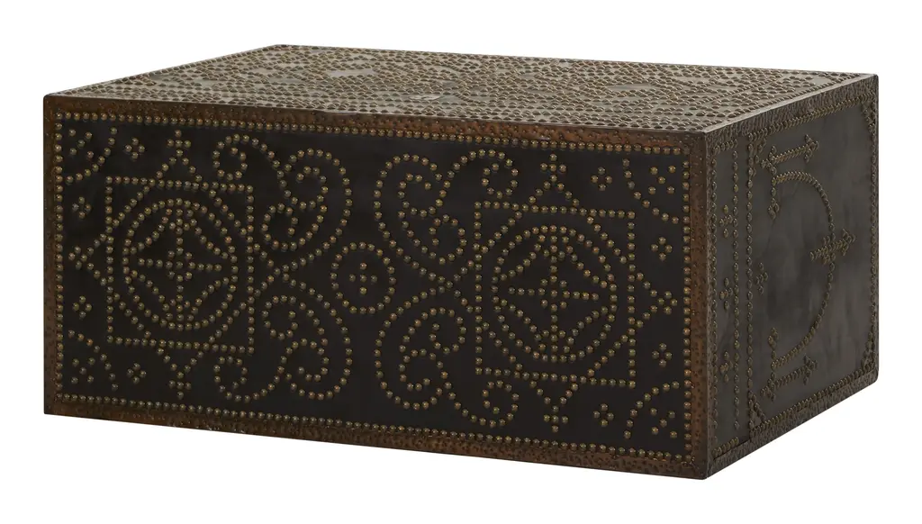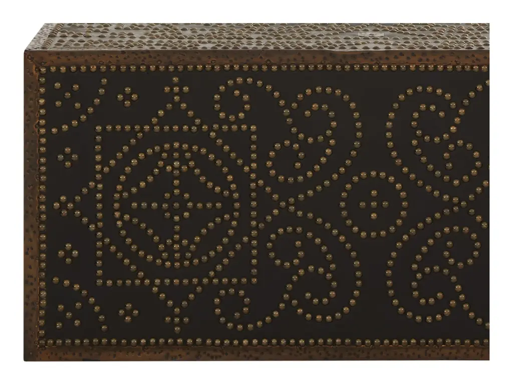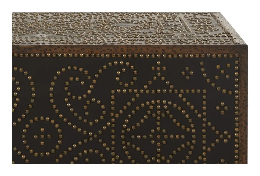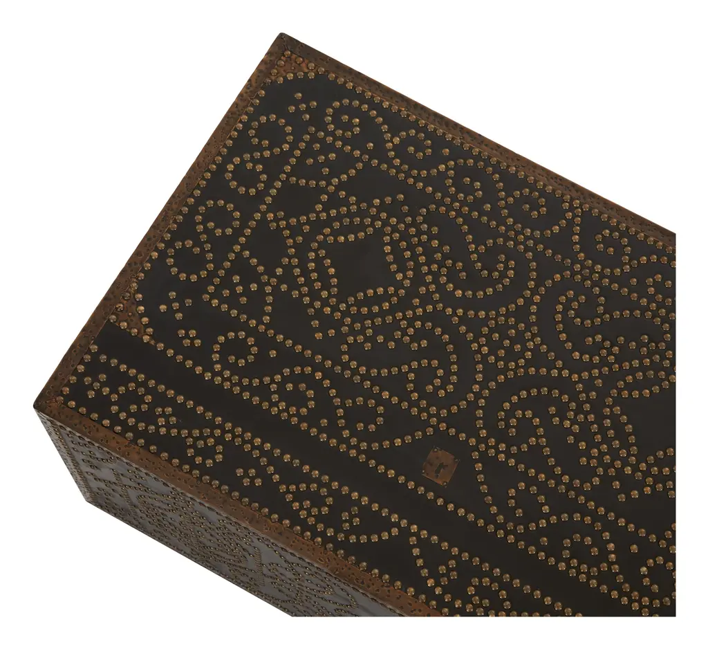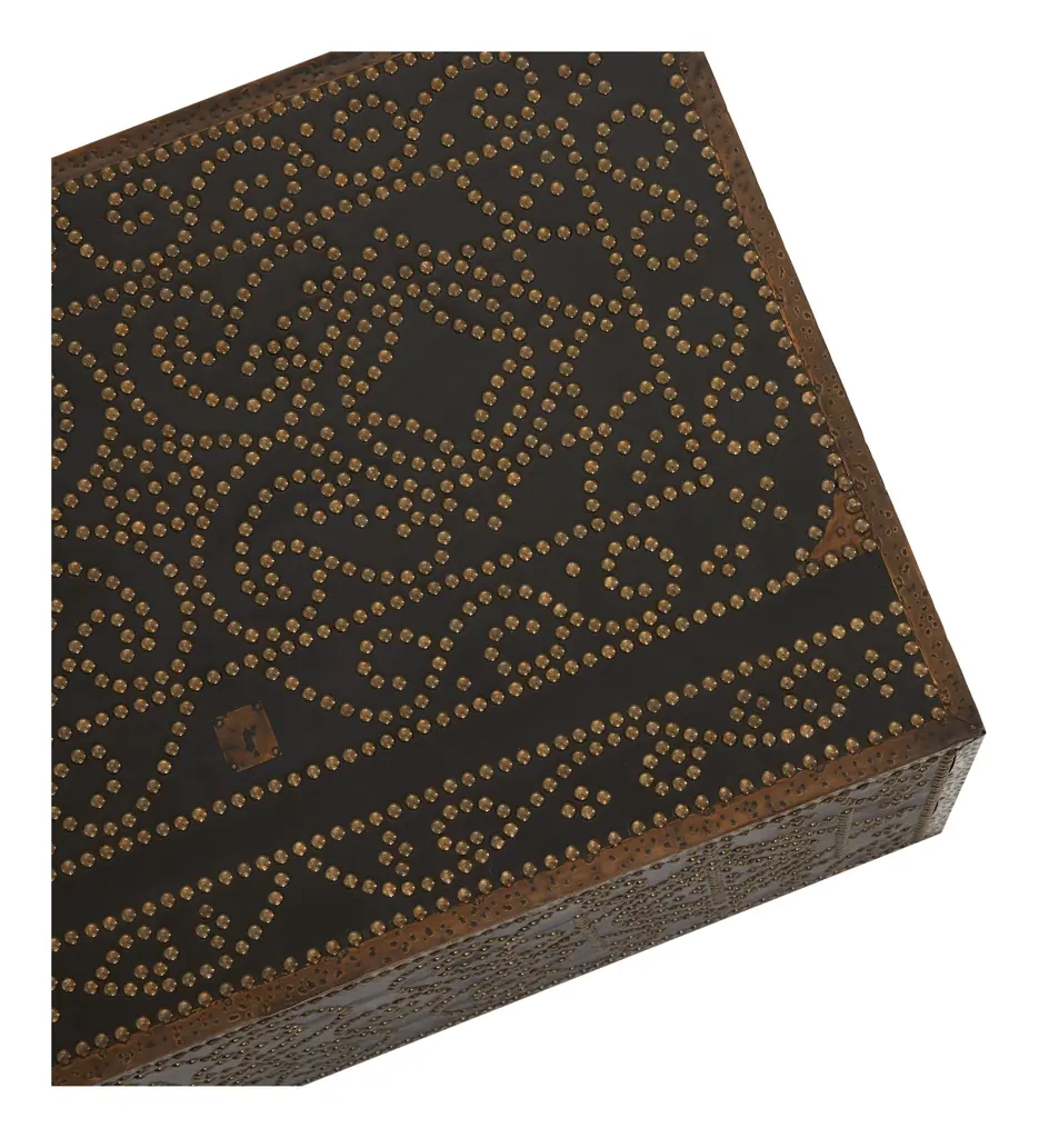Add a well-traveled layer to your living room seating area with our Barclay Coffee Table. Modeled after the vintage steamer trunks of yesteryear, this simple, blocky piece is completely clad in handsome dark brown leather and features hammered antiqued brass trim, as well as beautiful ornamental designs created by hundreds of antiqued brass nailheads. It hardly matters that it’s only a faux trunk with no hidden storage — Barclay’s luggage-esque looks still make it perfect for adding a bit of globetrotter style to a timeless, collected home. •leather •antiqued brass nailheads Description•35.75"W x 24"D x 16"H
