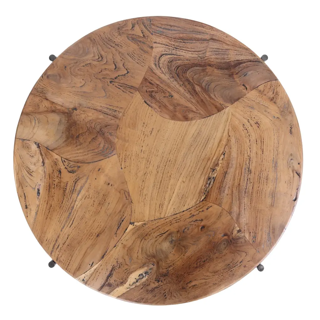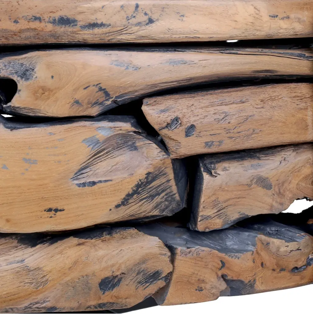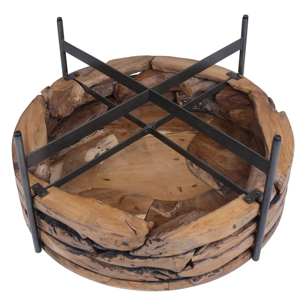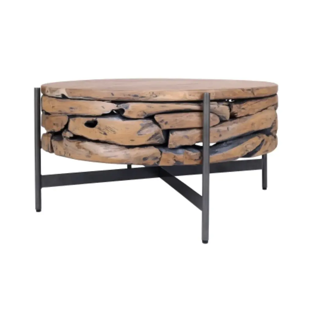 Careful craftsmanship results in an eye-catching, multi-layered live-edge coffee table made from stacked reclaimed teak roots. The gunmetal-coated steel legs perfectly complement the rustic modern design. Plastic glides are provided for added safety and stability.