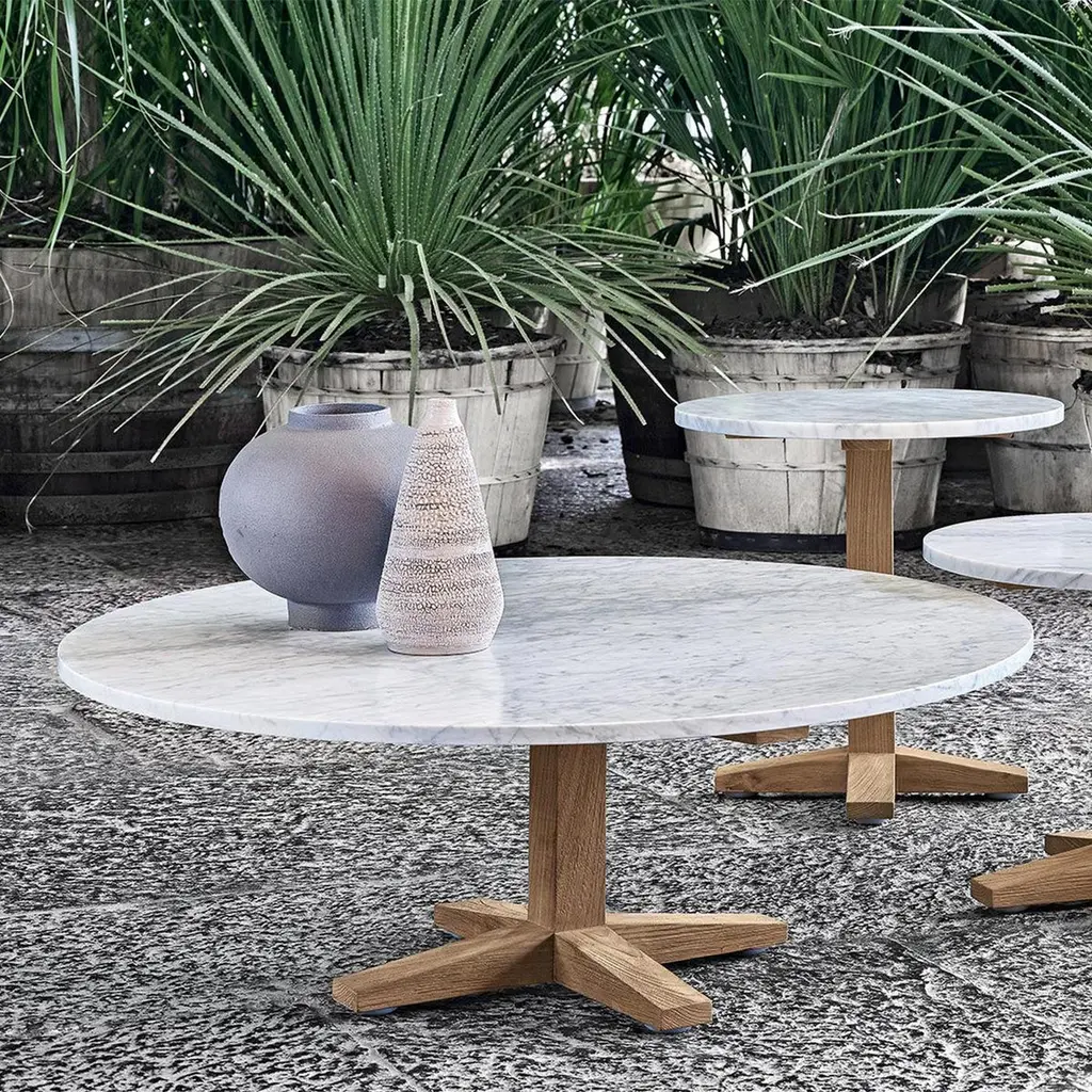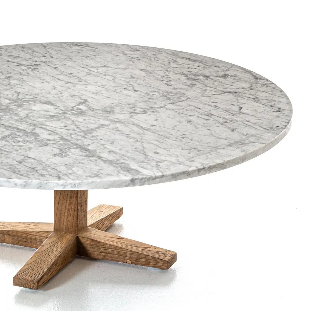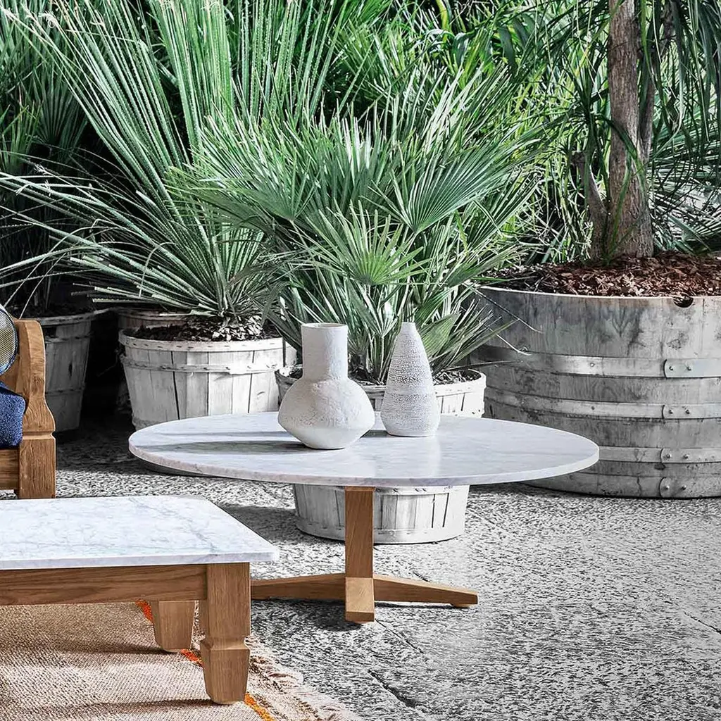 Coffee table Barletta with structure in solid teakWood and with polished carrare white marble top.