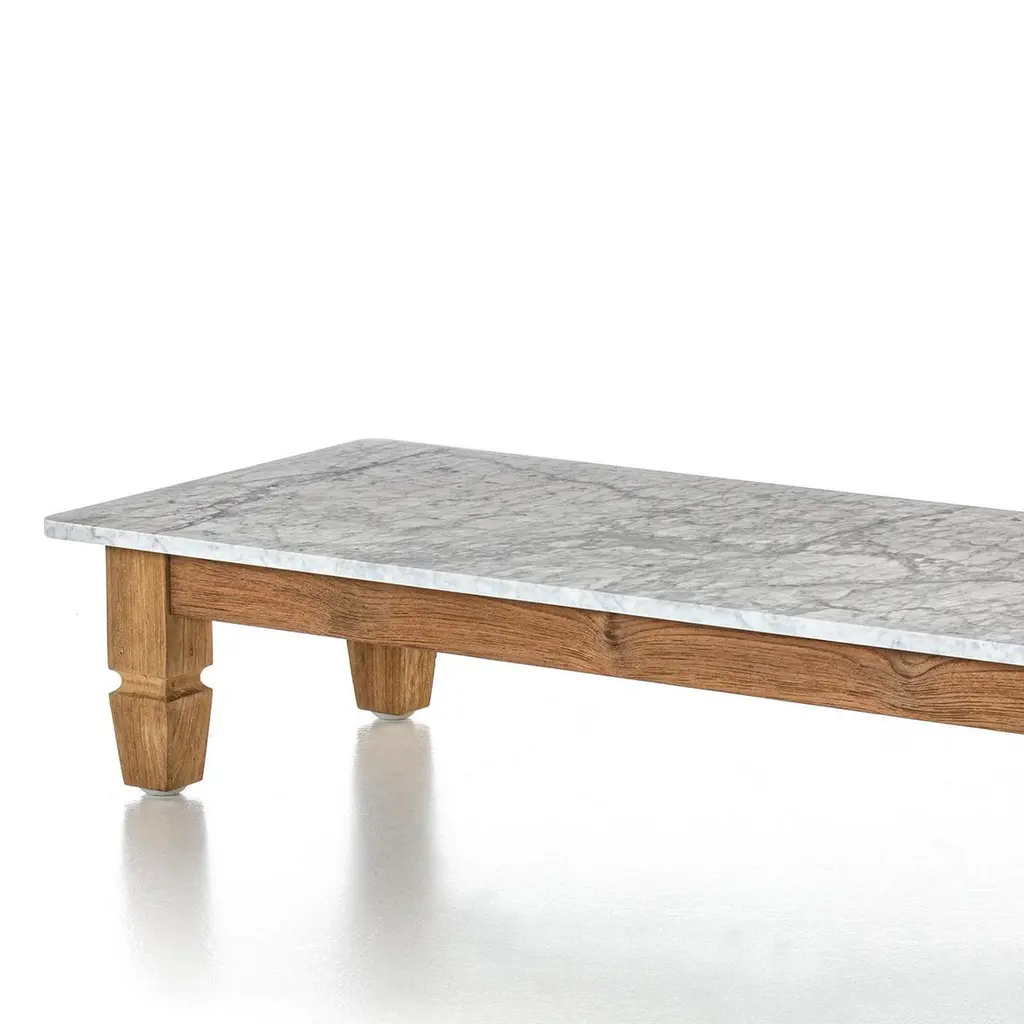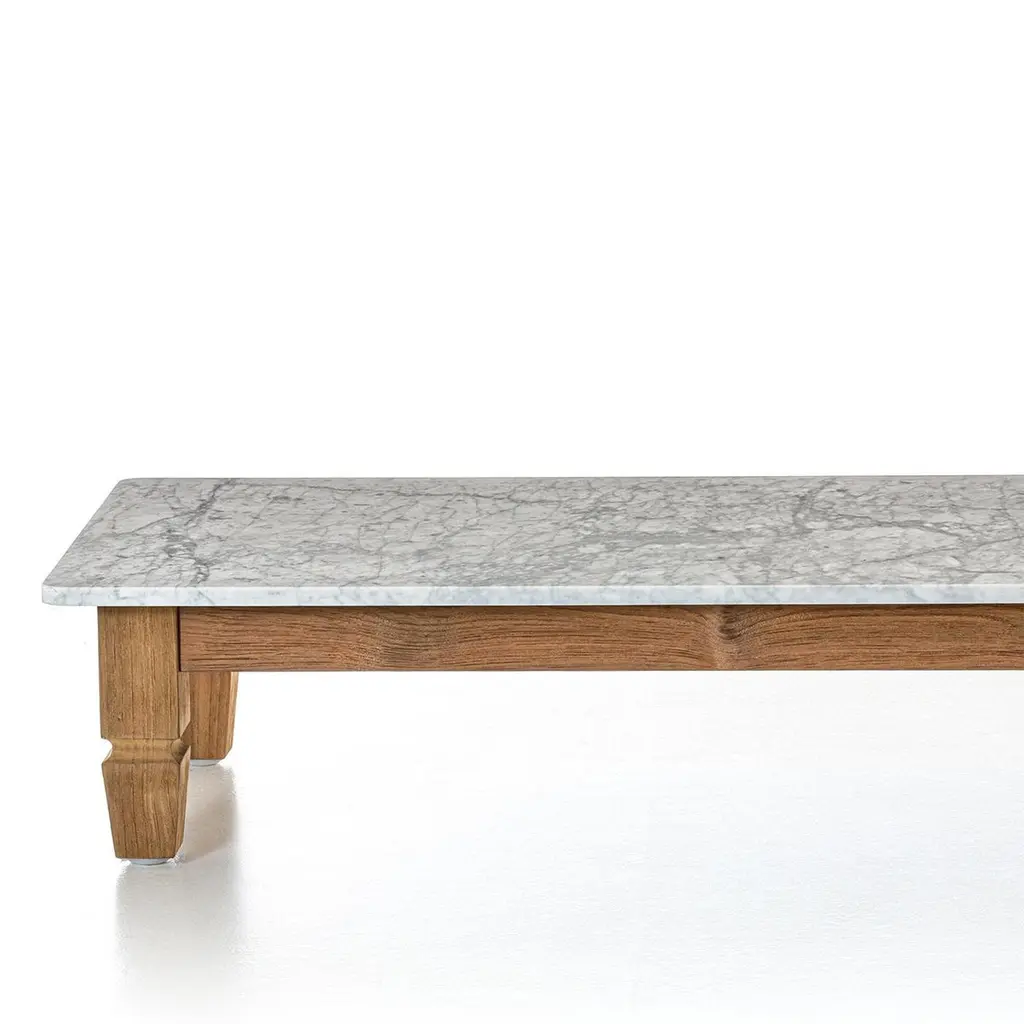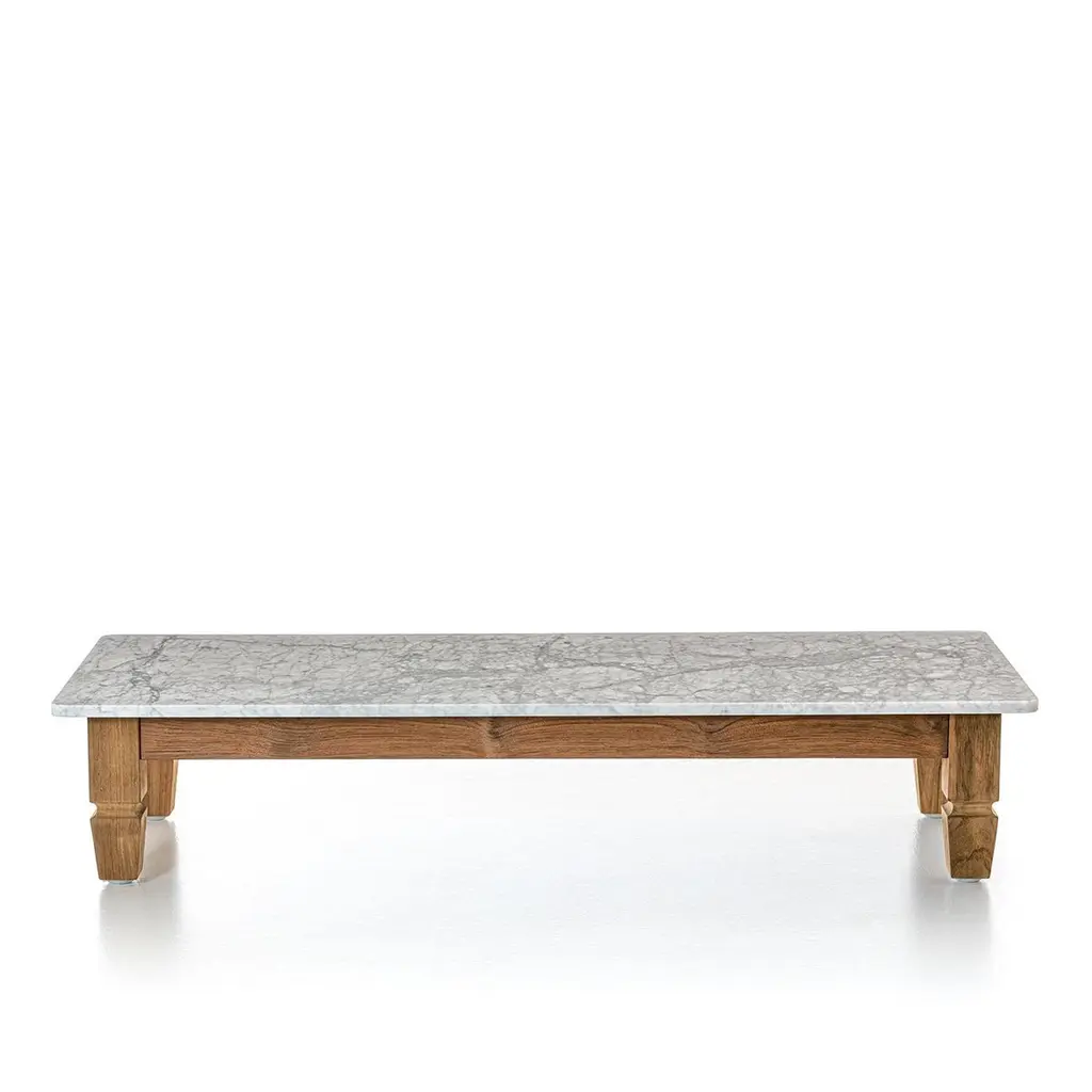 Coffee table Barletta rectangular structure in solid teak.wood and with polished carrare white marble top.