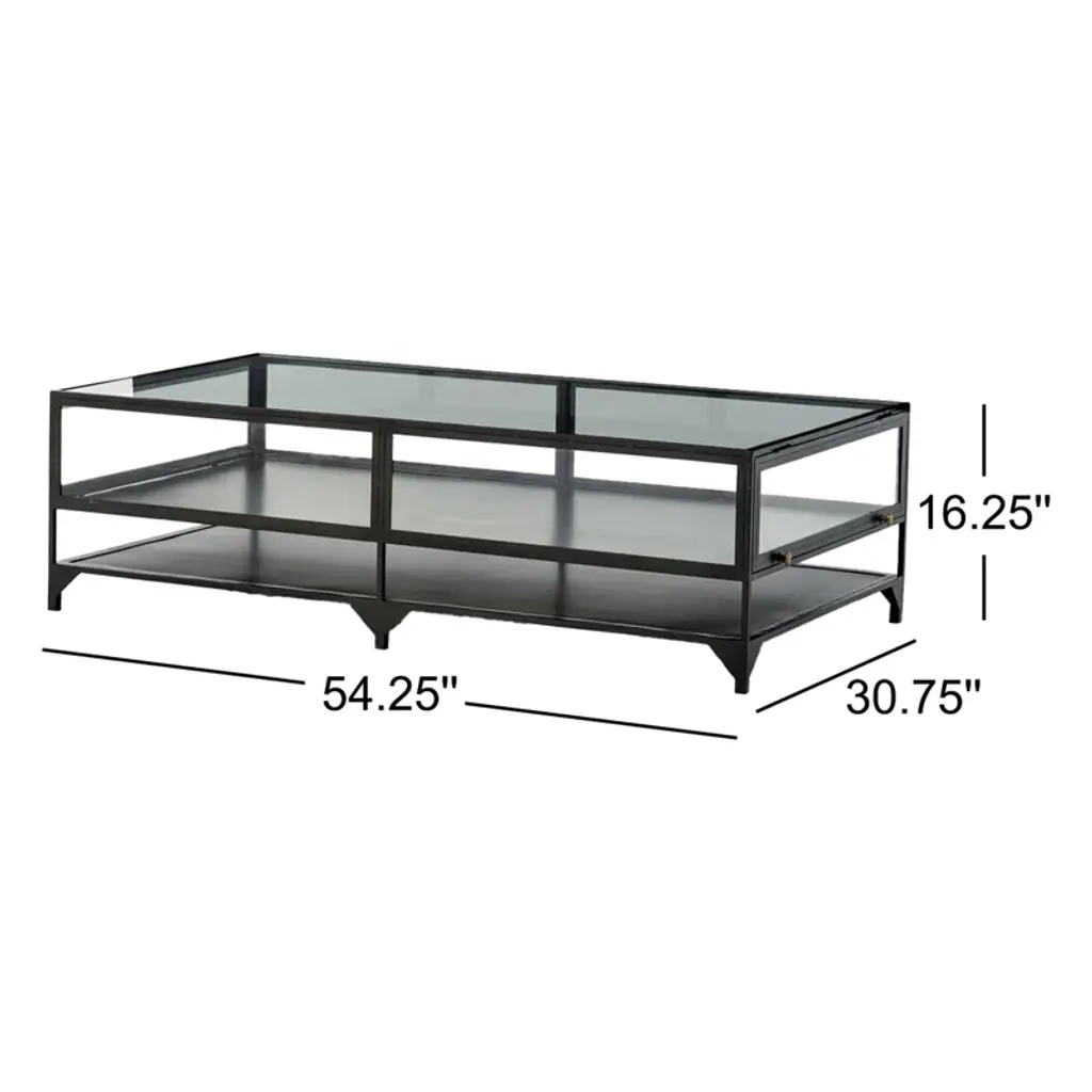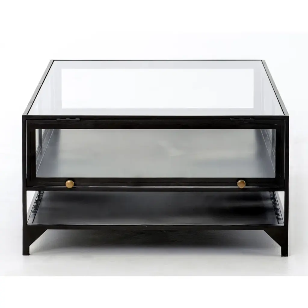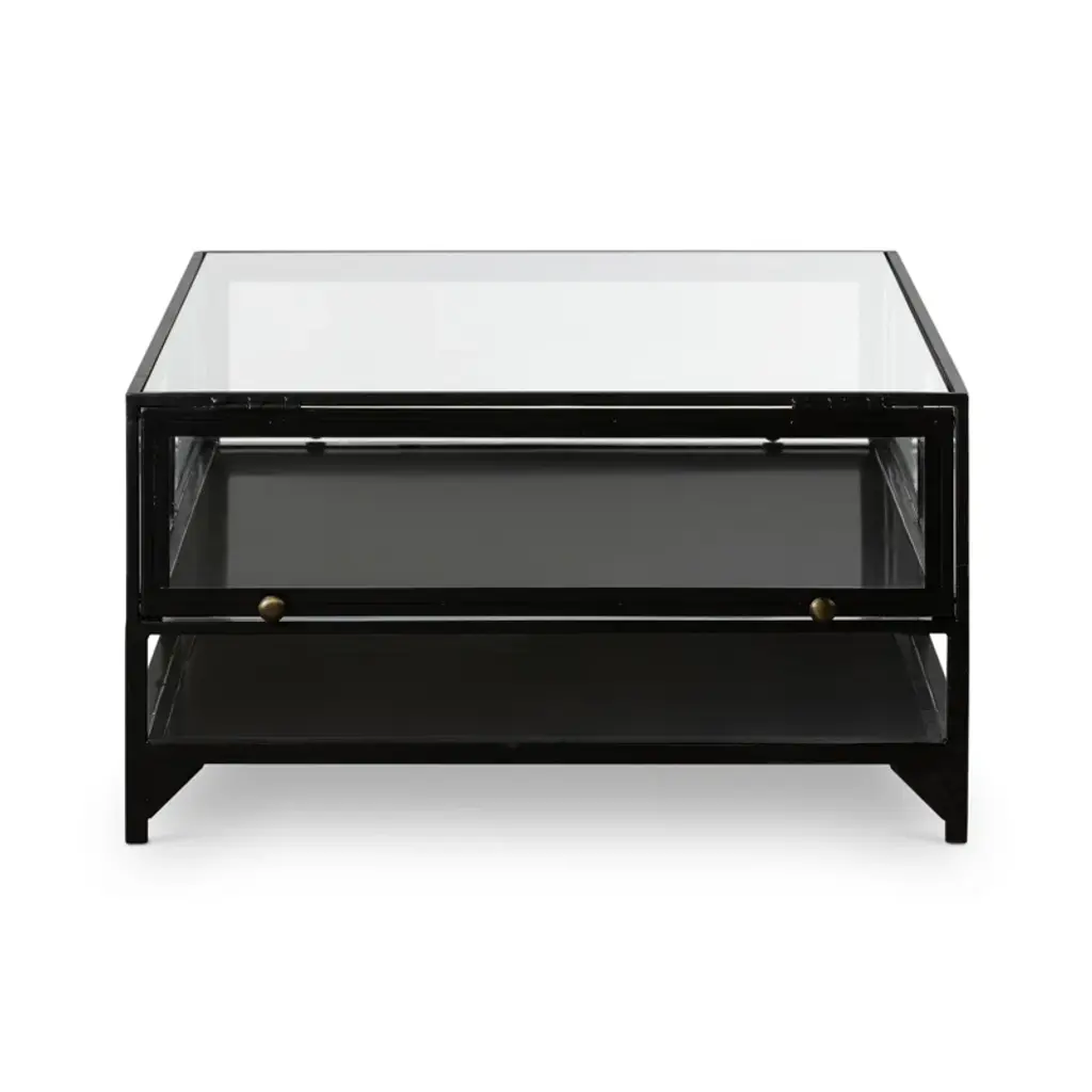 A shadowbox-inspired coffee table gives your inner collector a place to play. Frame prized possessions in a glass enclosure with matte-black metal and brass knobs.
