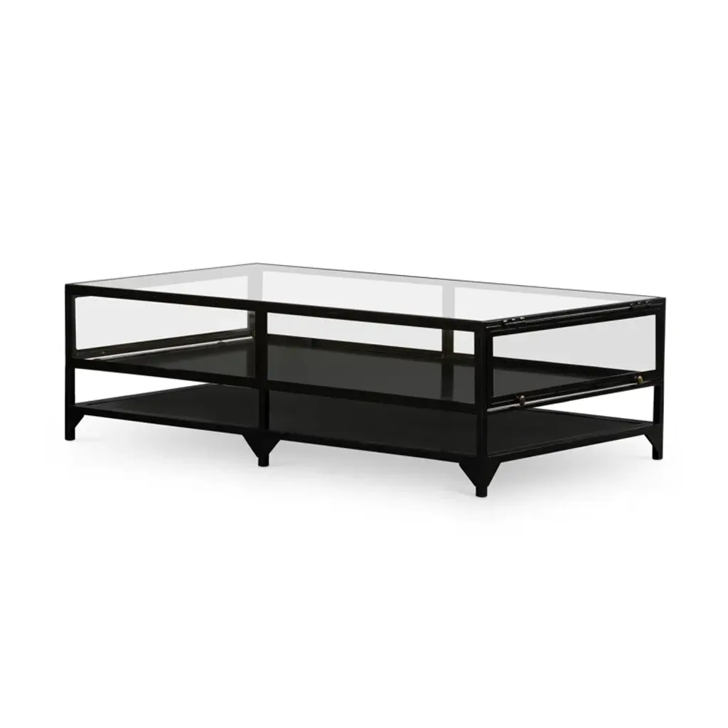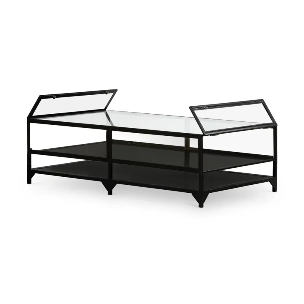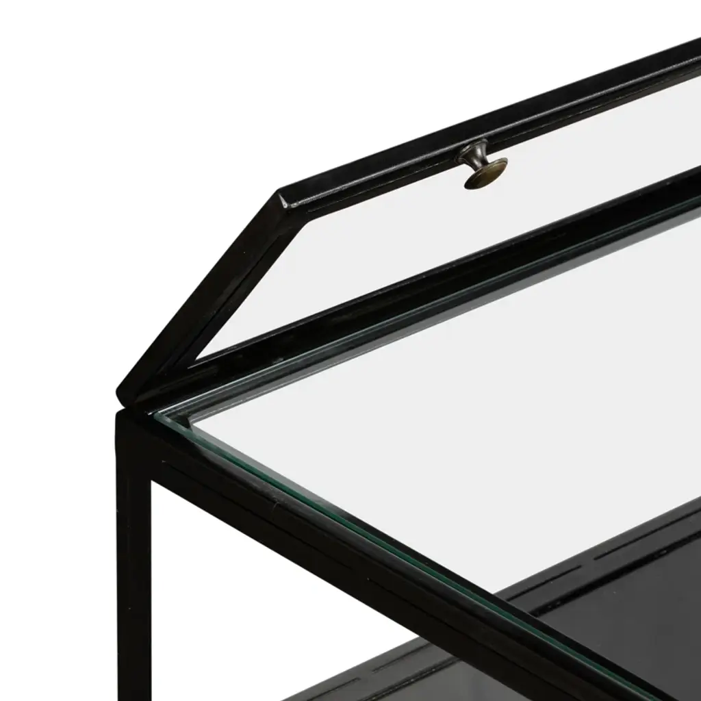 A shadowbox-inspired coffee table gives your inner collector a place to play. Frame prized possessions in a glass enclosure with matte-black metal and brass knobs.