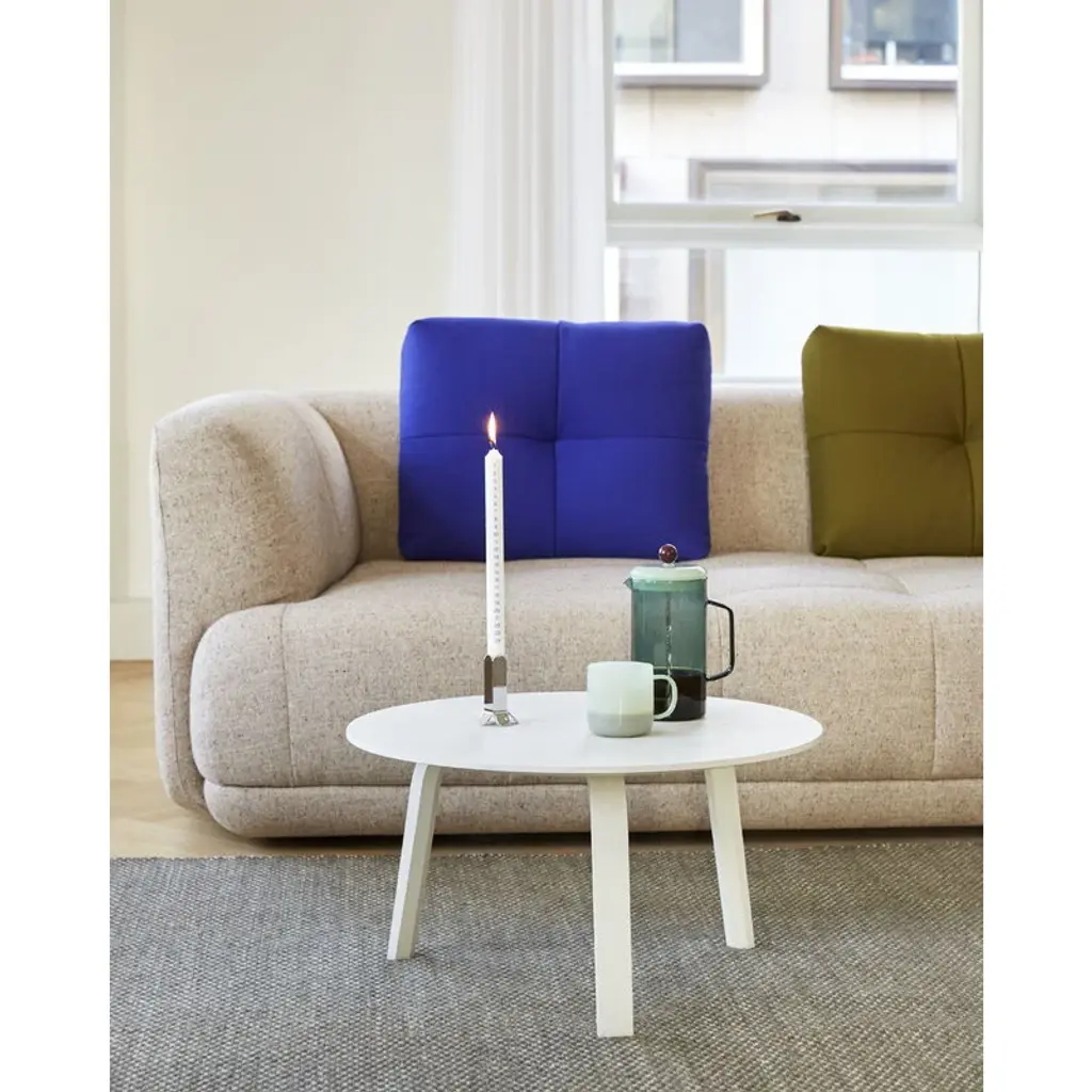 The Bella coffee table was designed by HAY originally for the Bella Sky Hotel in Copenhagen. After a few adjustments, the simple and beautiful table became part of the Danish brand's own furniture collection. Bella has an oak veneer base and a solid oak top, and it comes in a wide selection of colors and sizes. In 2021, HAY renewed the surface treatments of its wood furniture by replacing their lacquers with more environmentally friendly, water-based alternatives. This table is of newer production and has been finished with a water-based lacquer.