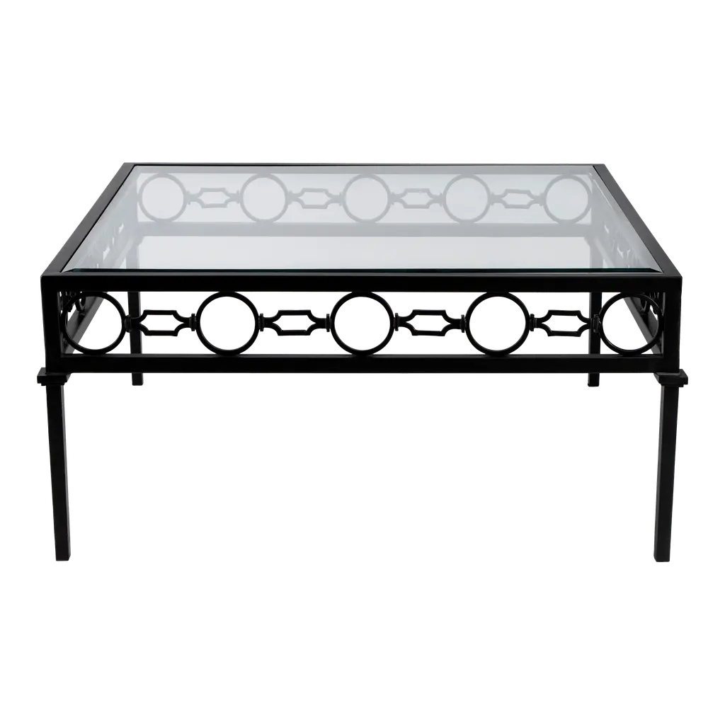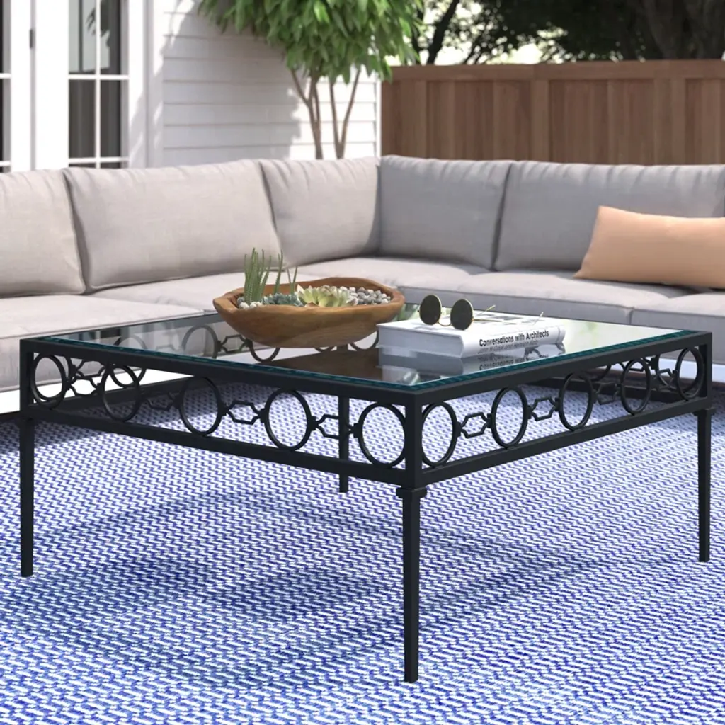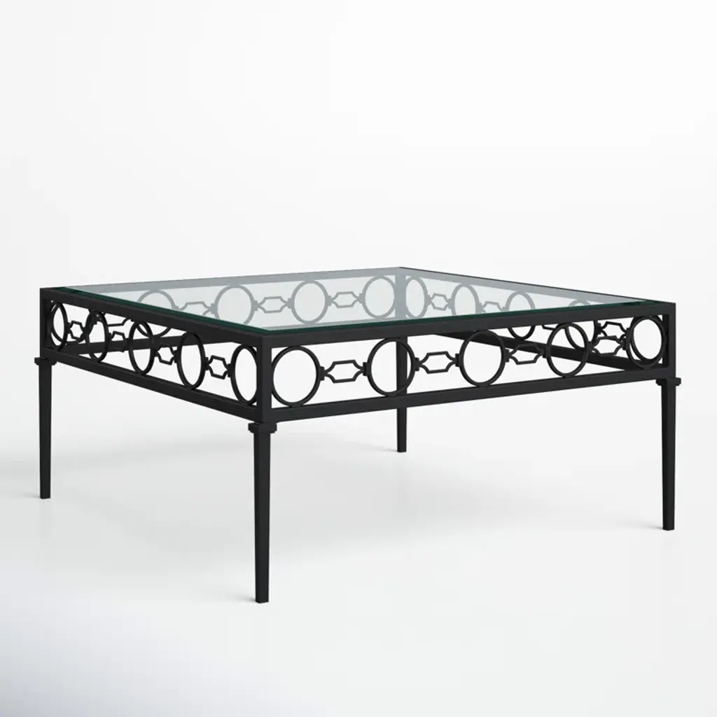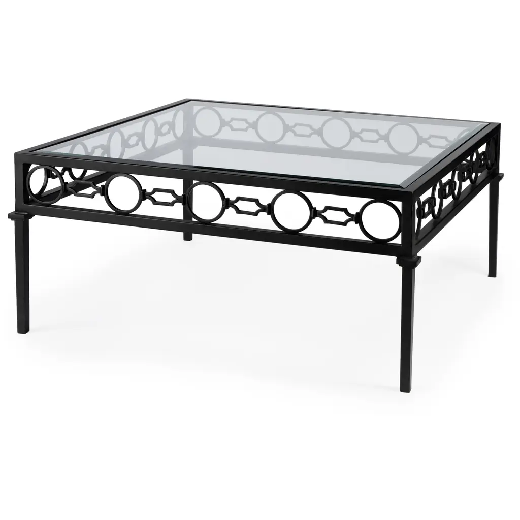 It's 5 o'clock somewhere! Grab a drink and cozy up around the Bellmore coffee table. Made of a black iron frame and clear glass top, this coffee table is substantial in size measuring 38.5"W x 38.5D x18"H. It's a forged geometric pattern. Best of all, the coffee table comes fully assembled ready for use!