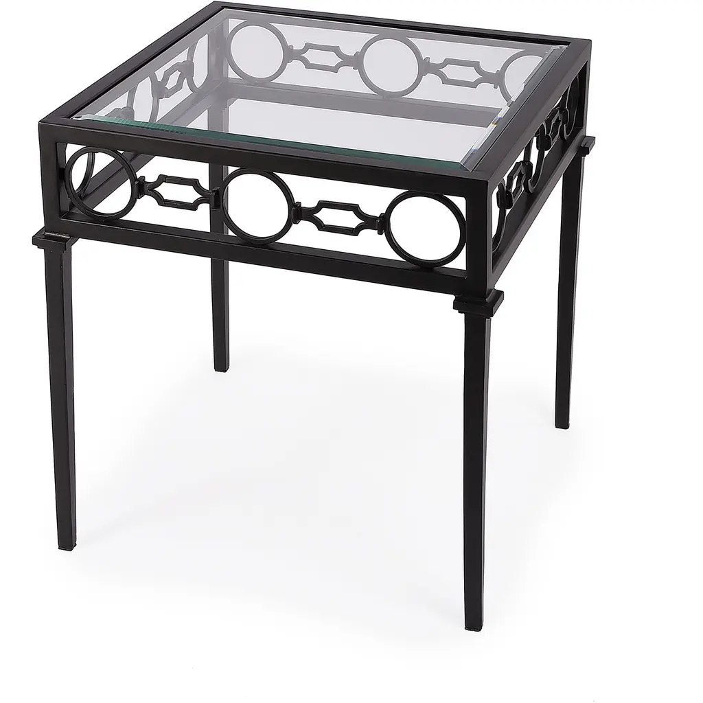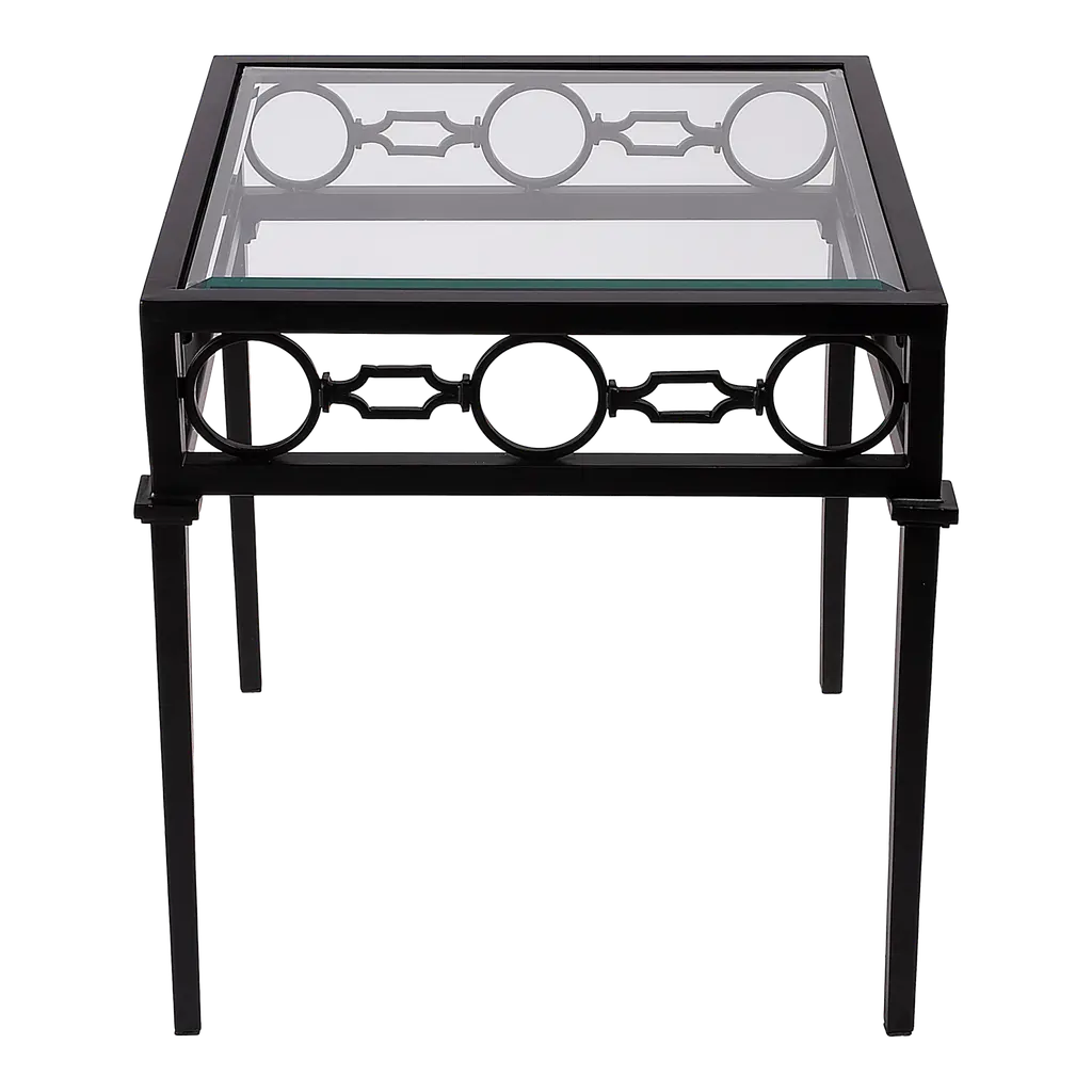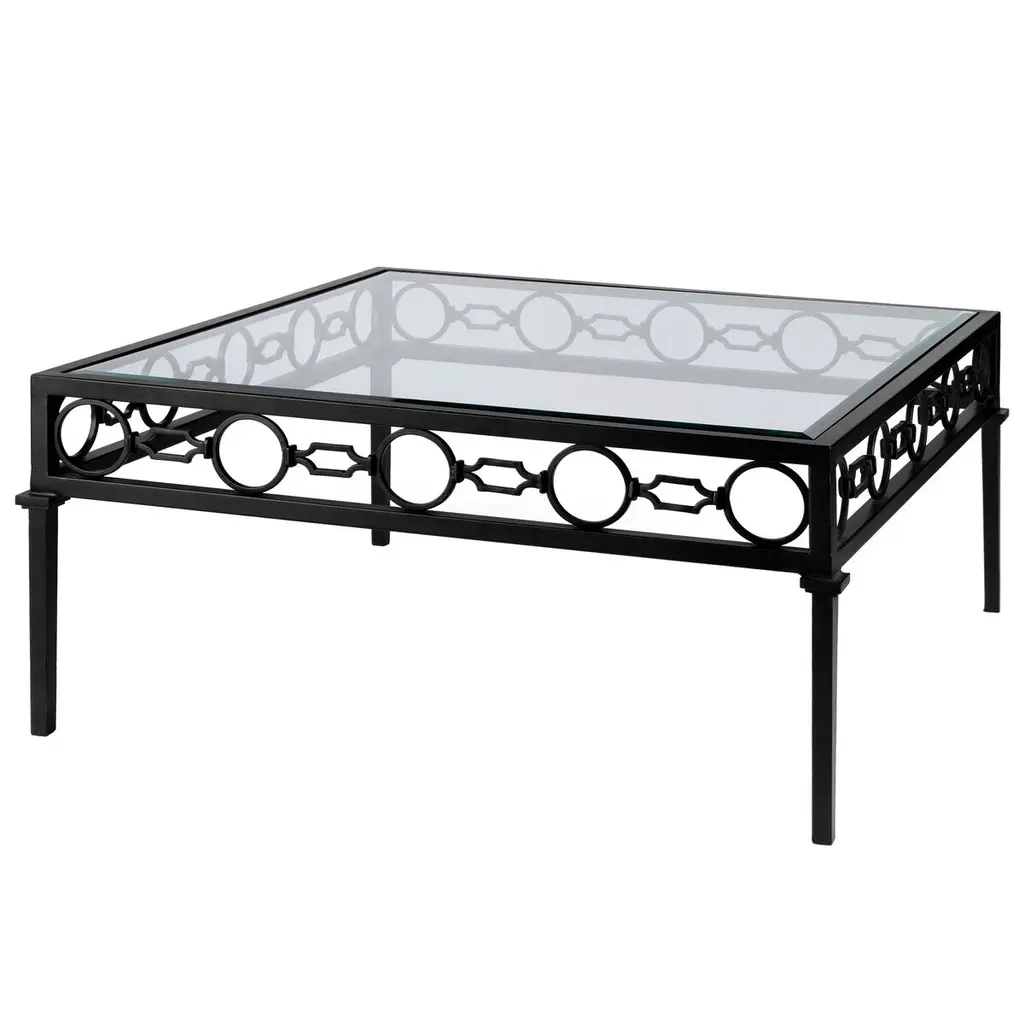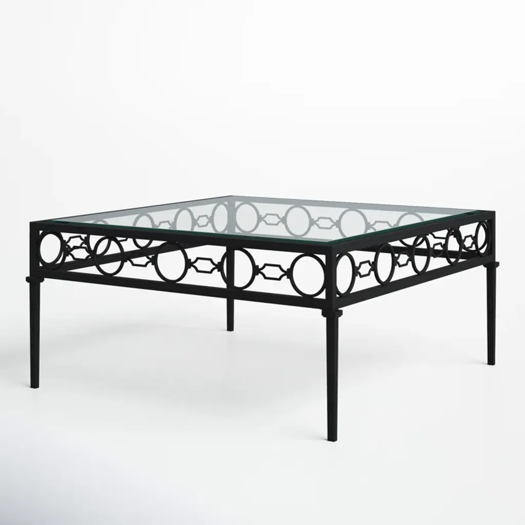 It's 5 o'clock somewhere! Grab a drink and cozy up around the Bellmore coffee table. Made of a black iron frame and clear glass top, this coffee table is substantial in size measuring 38.5"W x 38.5D x18"H. It's a forged geometric pattern. Best of all, the coffee table comes fully assembled ready for use!