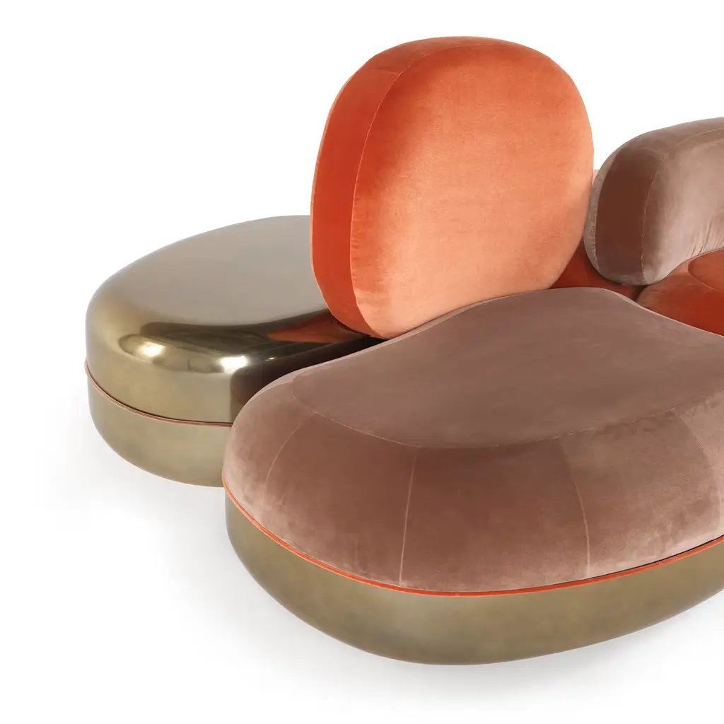 "Between sculpture and design, Belmer is a shiny wonder-object with sinuous shapes, appearing as an alien organism, coming from a galaxy where everything is yet to be discovered." Central table with structure in CNC machine-shaped solid wood with glossy patinated gold finishing. Piping in Pink velvet. Variation Details: Central table with structure in CNC machine-shaped solid wood with glossy patinated gold finishing. Piping in velvet.
