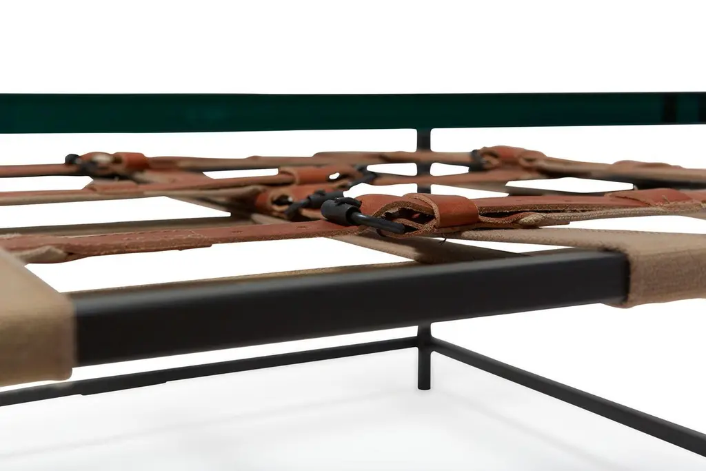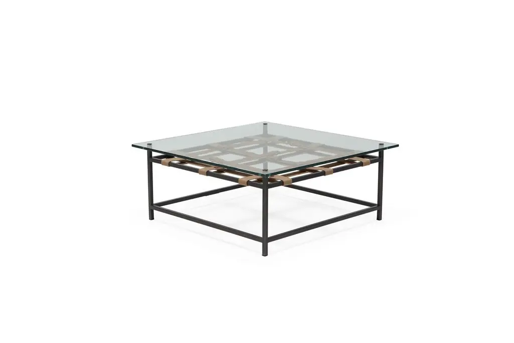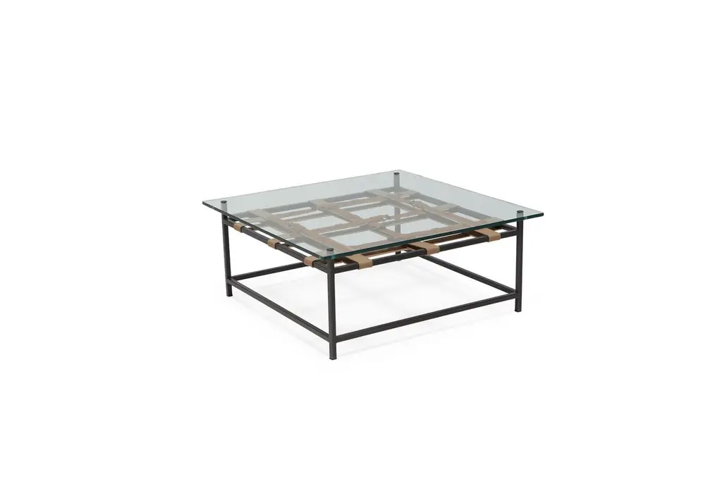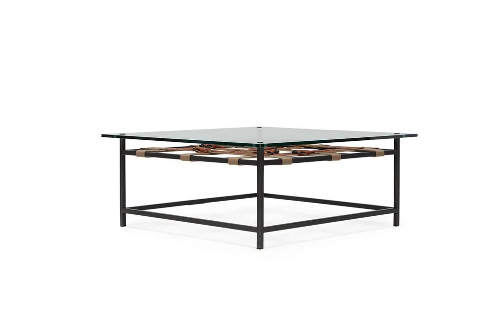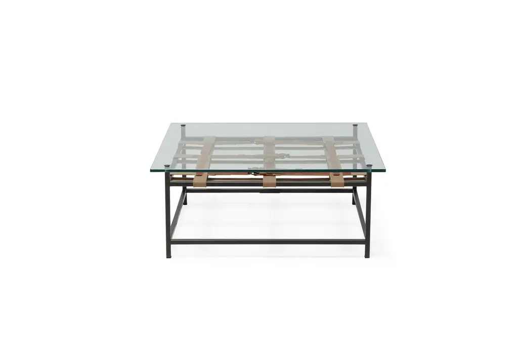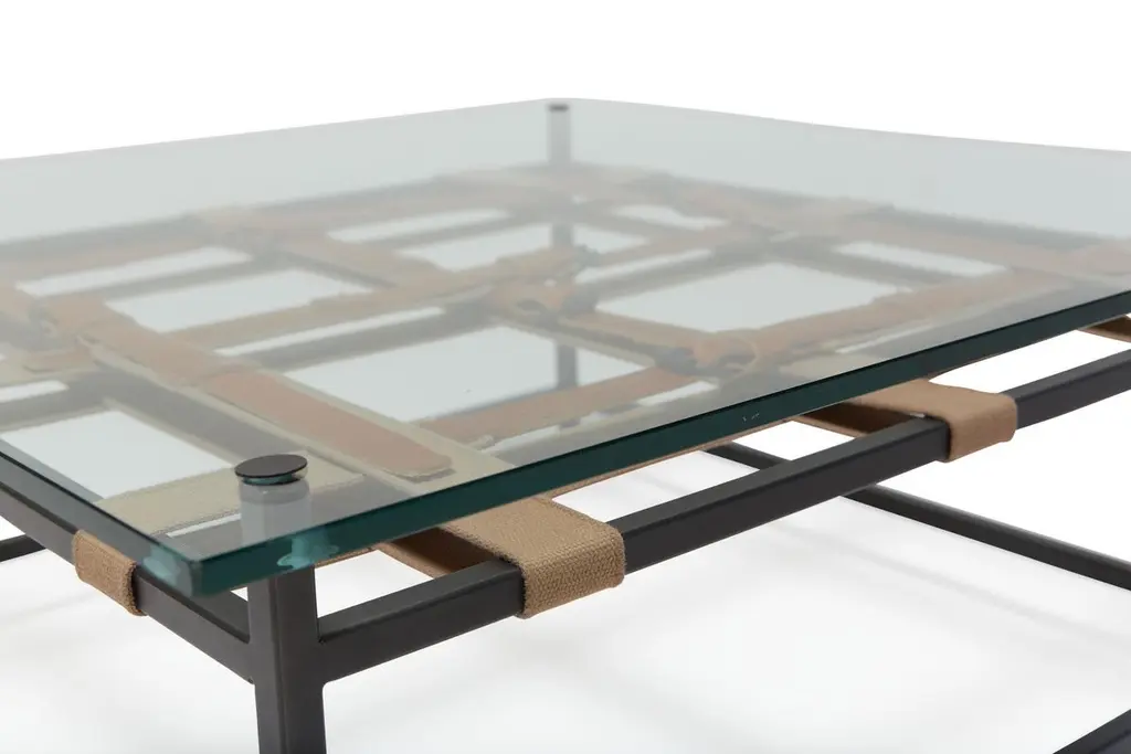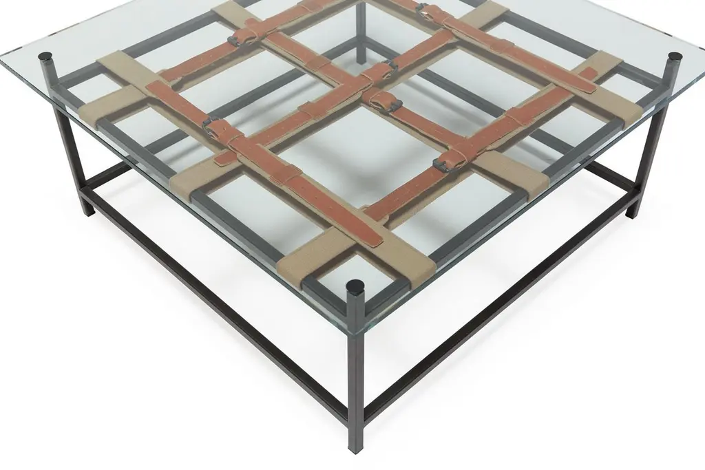 A glass topped coffee table that utilizes the signature Inheritance collection belts. The steel frame has a blackened steel finish and taupe cotton webbing belts with cognac leather and blackened steel buckles.Every Stephen Kenn piece is made to order through our Los Angeles studio. We create these pieces utilizing a number of small businesses and fabricators in the LA area.