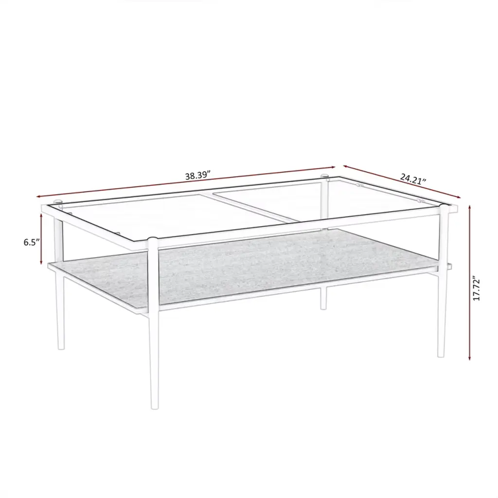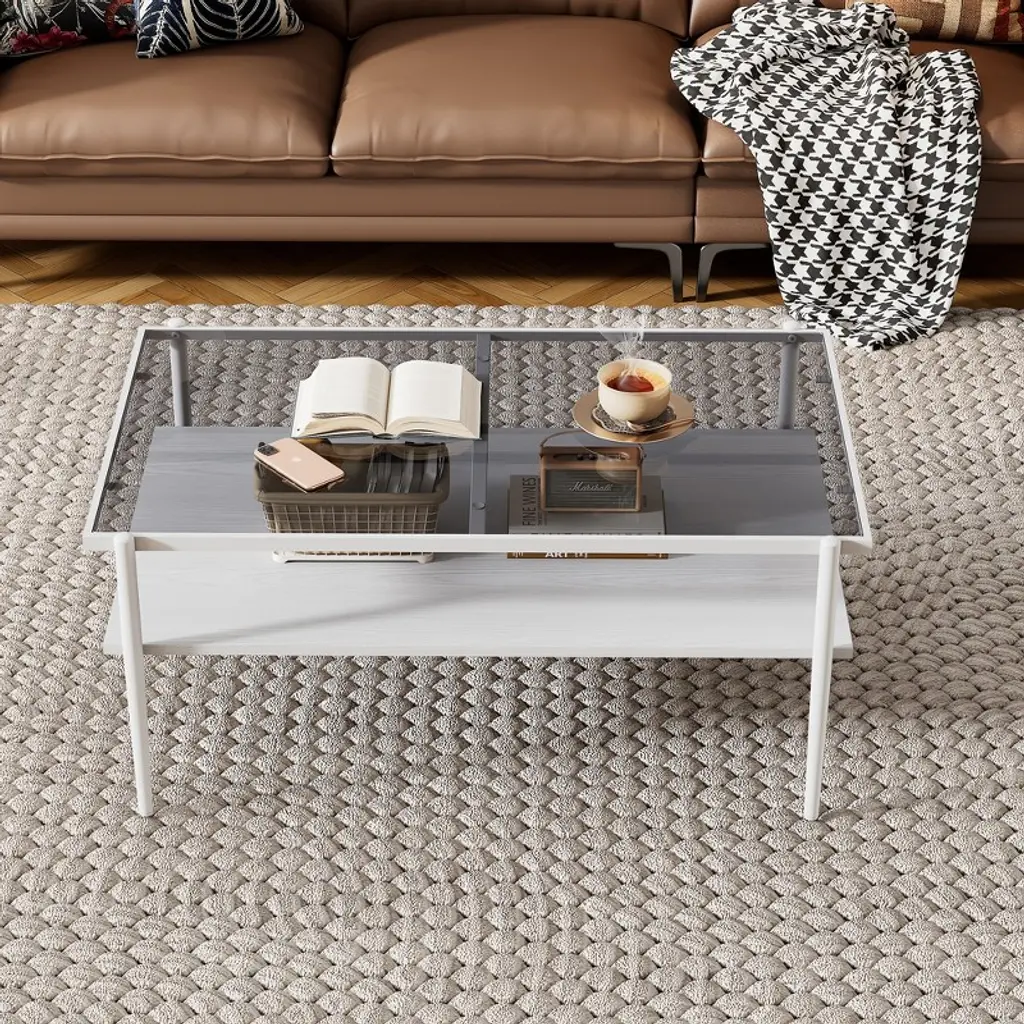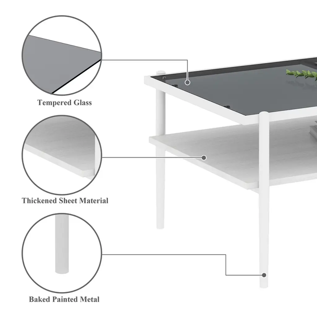 The coffee table's top is crafted from tempered glass, lending a sophisticated and modern air to your living space. The foundation of the table is made from MDF, a material known for its strength and reliability, ensuring the table remains stable and durable for daily use. Supported by metal legs, the table offers robust support, designed to maintain balance and handle weight with ease.