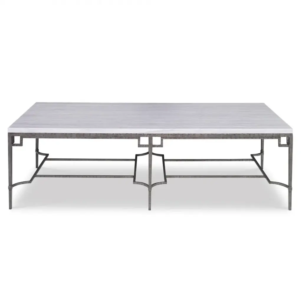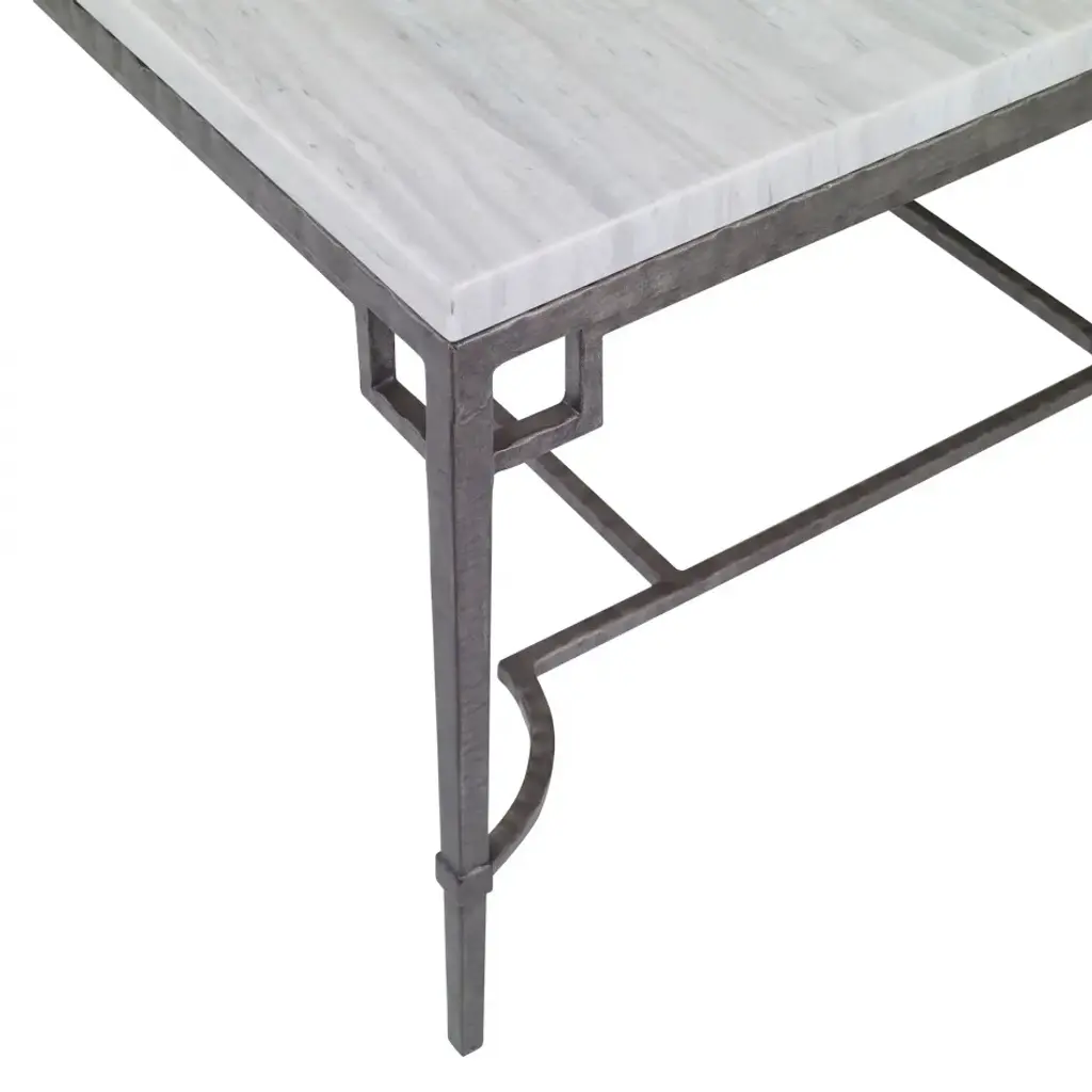A hand forged metal frame with a hammered texture supports a polished Nestos marble top. Decorative brackets and arching stretchers coomplete the look.