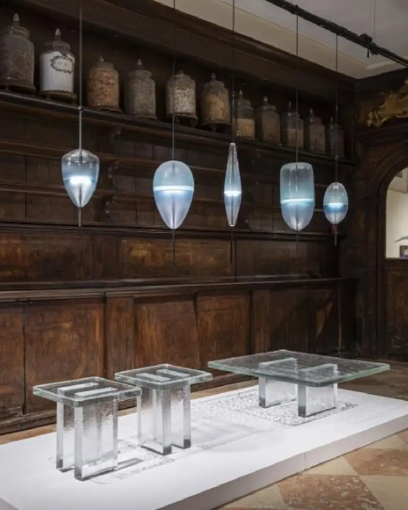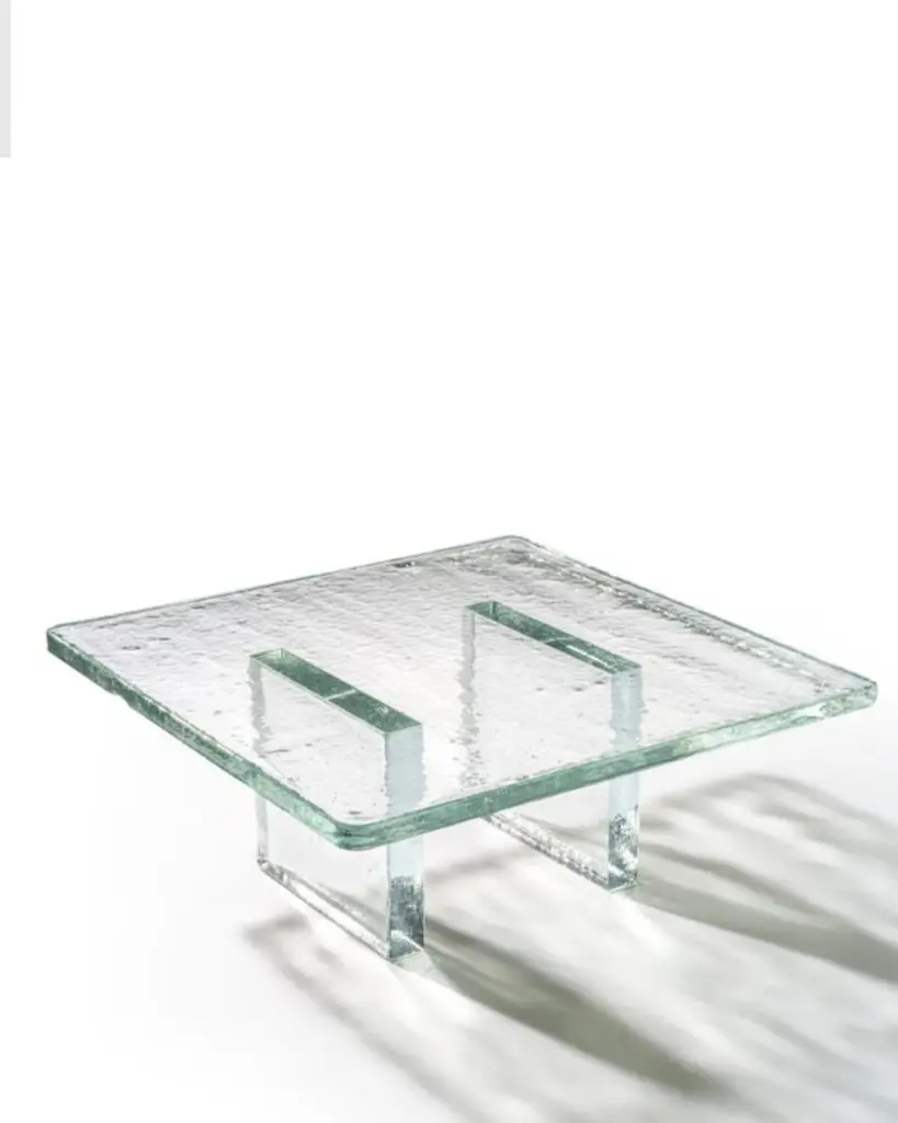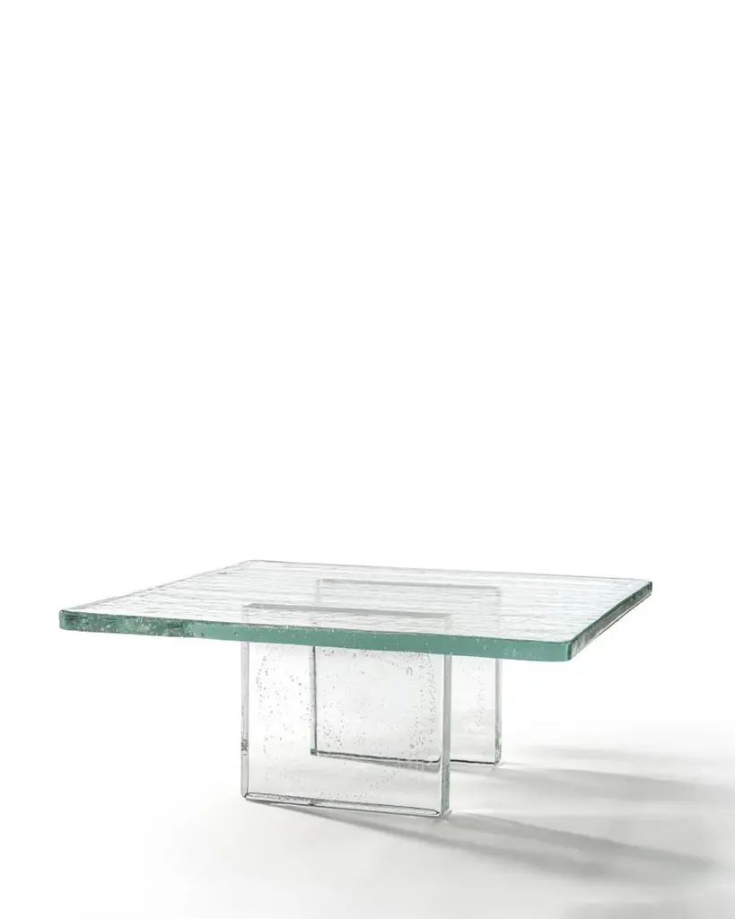 The character of the Berg table is inseparable from its materiality. Every detail of the design derives from the mesmerising visual and tactile qualities of cast glass and from the scope the medium allows for exploring the charged threshold between concreteness and abstraction. The form of the table is kept purposefully simple, to emphasise the beauty of the glass and the skill of the Venetian artisans. A rectangular glass top with rounded corners rests on two rectangular glass blocks. The heights and spacing of the blocks and the proportions of the top are variously combined to create distinct conditions: a side table and a coffee table. Fabricating each piece by hand rather than by industrial processes ensures that every iteration is unique, in terms of its surface texture and the pattern of tiny bubbles suspended within the glass.The character of the Berg table is inseparable from its materiality. Every detail of the design derives from the mesmerising visual and tactile qualities of cast glass, and the scope such medium permits for exploring the charged threshold between the concrete and abstract.Side table version available Materials: Cast GlassFinish: CrystalDIMENSIONS:D 90 x W 90 x H 30 cm