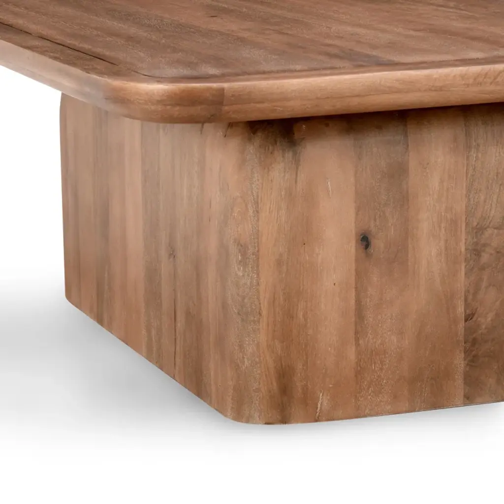Designed with a sculptural appeal, this coffee table uses alluring curves that soften the bold lines and solid, thick legs. Rich, earthy tones and lively grain patterns flow through the mango wood, bringing energy and visual interest to the look.