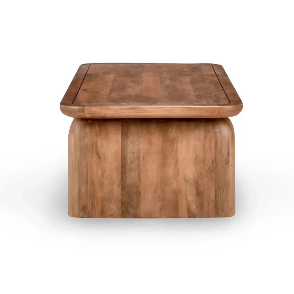 Designed with a sculptural appeal, this coffee table uses alluring curves that soften the bold lines and solid, thick legs. Rich, earthy tones and lively grain patterns flow through the mango wood, bringing energy and visual interest to the look.