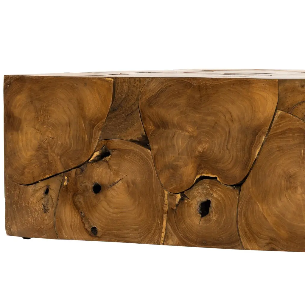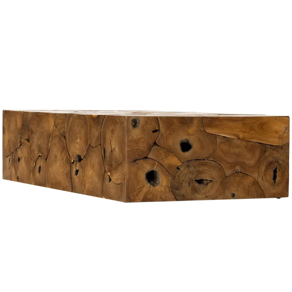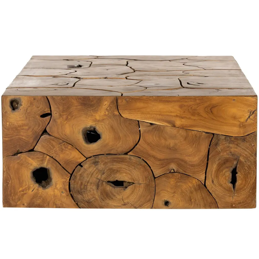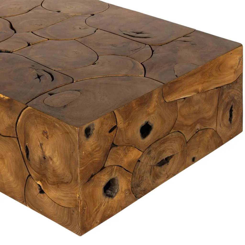 A unique layering piece for indoors or out. Made from laminated teak root with miter joinery, a simply shaped coffee table offers organic vibes and plenty of natural movement. Tables will vary from piece to piece, reflective of natural materials. Joint expansion may grow visible over time. Cover or store indoors during inclement weather and when not in use.