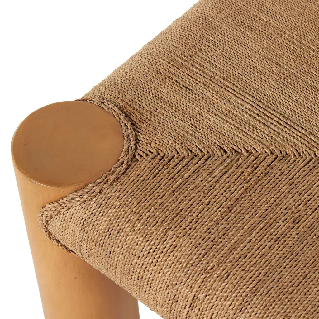 Braided rope crafted from sugar palm leaves is woven to form this cocktail table's taut, durable top. The mahogany column legs offer a bold textural complement.