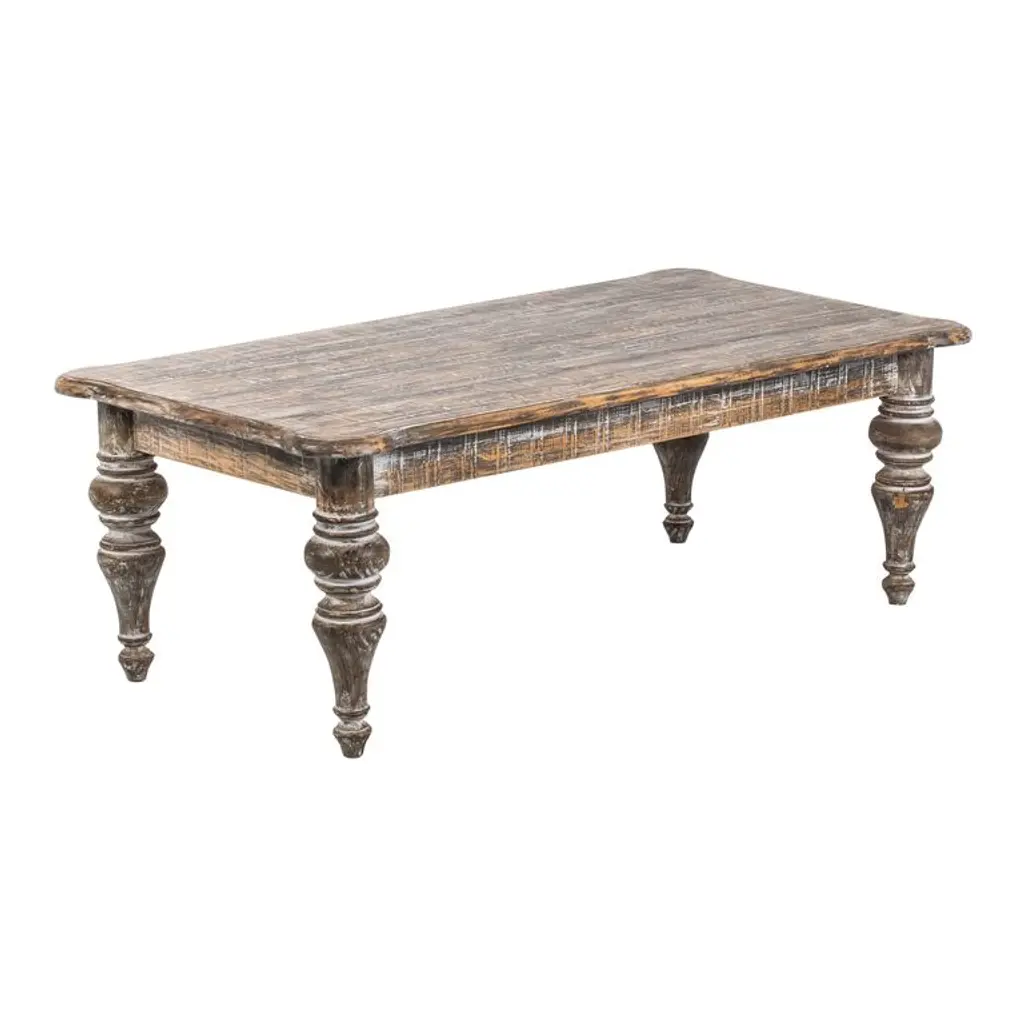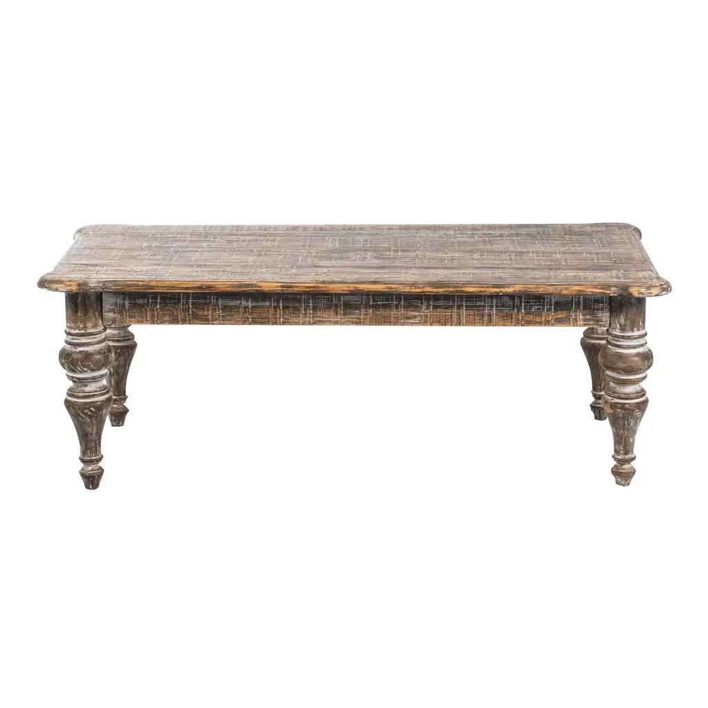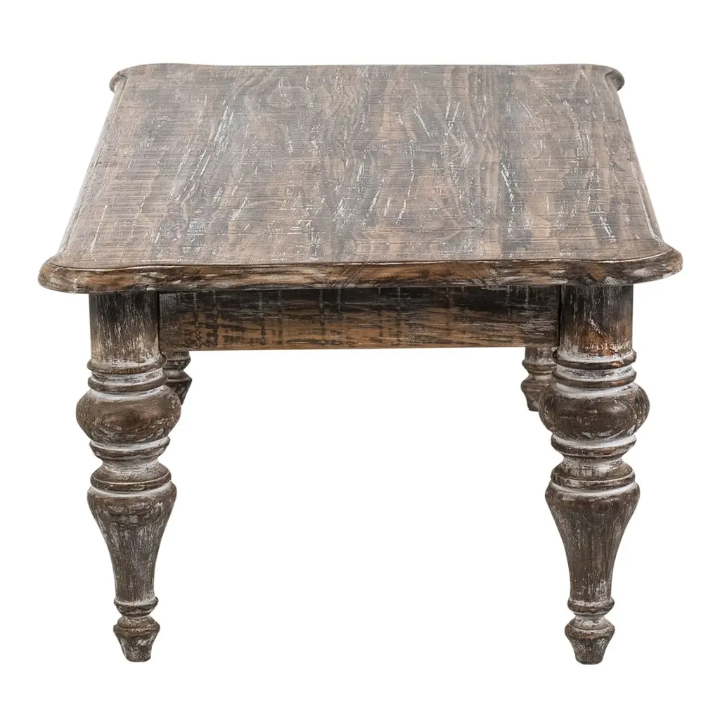The Berne coffee table delivers a wealth of French farmhouse-inspired charm with its scalloped tabletop and shapely spooled legs. This rectangular table is made of hand-painted pine wood with sage and black undertones to add antique texture and dimension to the finish. A one-of-a-kind work of natural art with unique variations in color and grain pattern, its reclaimed-wood construction guarantees that no two pieces are alike.