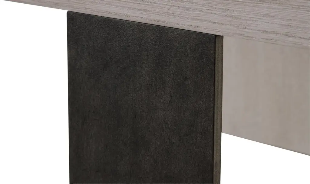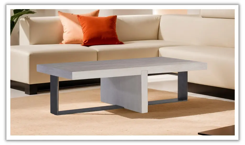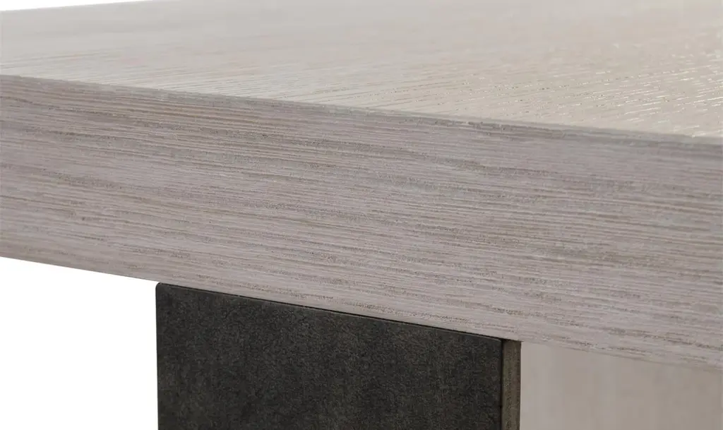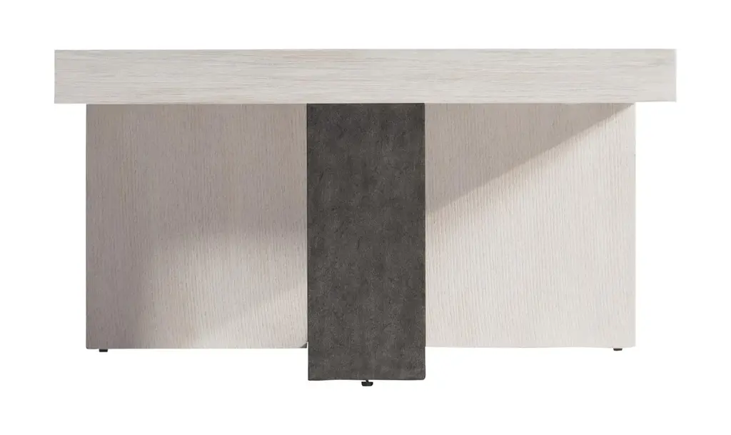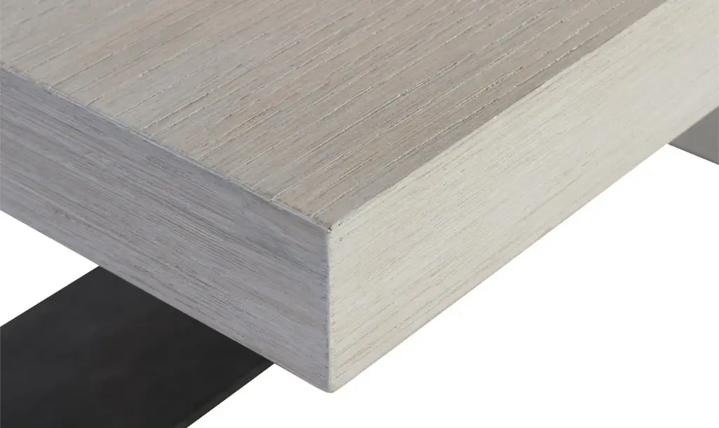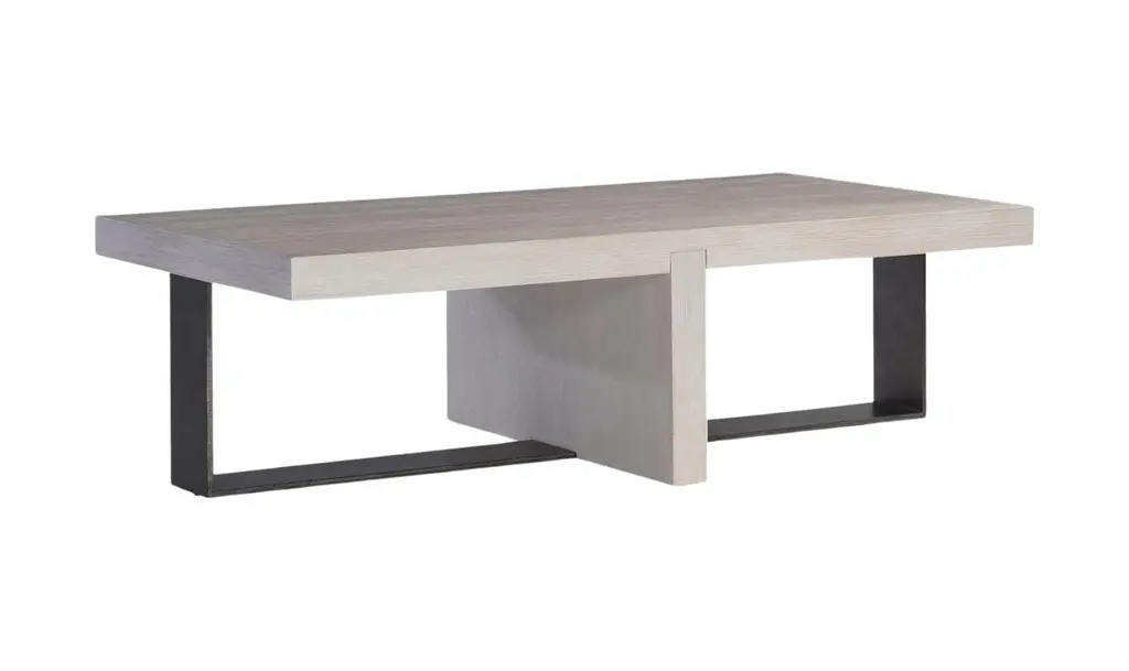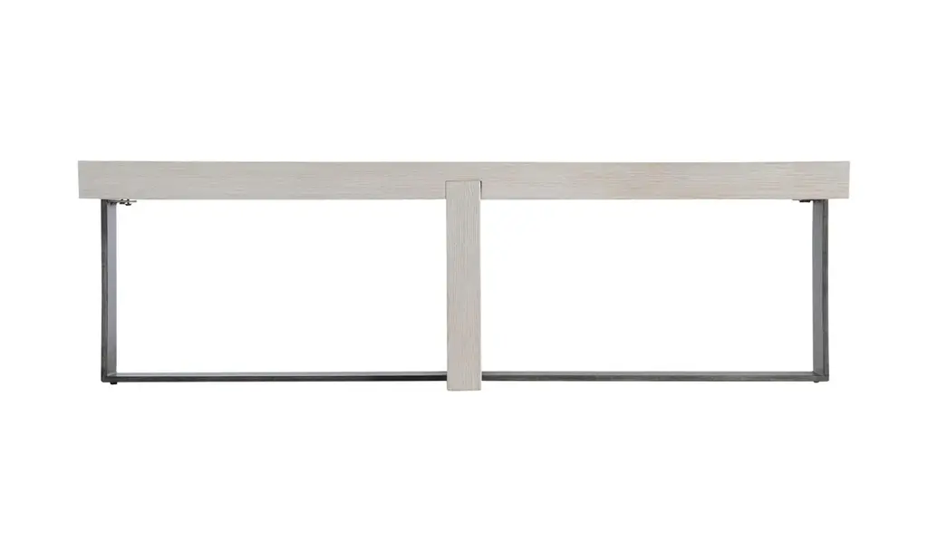 Immerse your living space in architectural elegance with the Hoban Coffee Table in a sleek rectangle shape. Crafted with meticulous attention to detail, this coffee table showcases intersecting panels of wire-brushed, quartered white oak veneer in a captivating Weathered Bone finish. The top and center support panels seamlessly come together, forming a visually striking and harmonious design. The Weathered Bone finish adds a touch of rustic charm, enhancing the natural beauty of the wood. The painted steel legs and stretchers feature a textured metal finish, providing a contemporary contrast to the warm wood tones. The result is a coffee table that effortlessly balances modern aesthetics with timeless appeal. Designed for both form and function, the Hoban Coffee Table is not only a visual centerpiece but also a practical addition to your living room. The adjustable glides ensure stability, adapting to your space's unique requirements. Elevate your home with the intersection of artistry and functionality embodied by the Hoban Coffee Table.