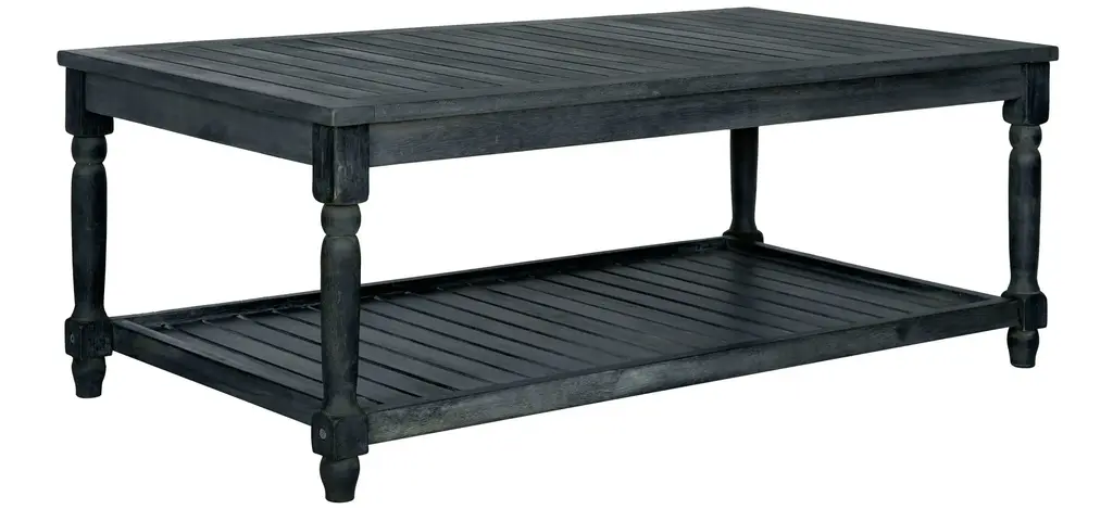 Designed to evoke the charm of coastal cottage style, the Beson outdoor coffee table combines form and function. Crafted of acacia wood in dark slate grey, this piece boasts artfully turned legs, and slats on its tabletop and lower shelf for quick drainage.