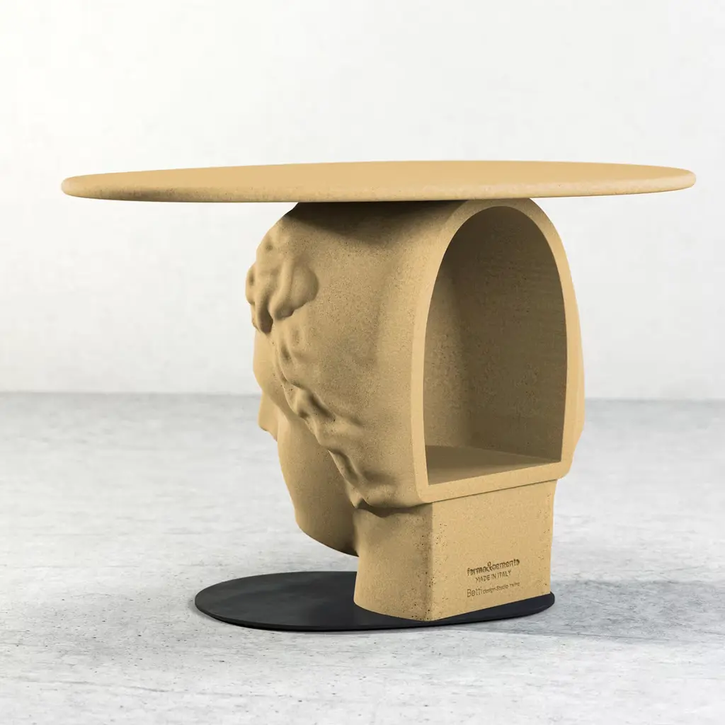 Infusing a contemporary home with classic sophistication, this coffee table is distinguished by a lively cream color that lends it a luminous quality. Fashioned of concrete, which French architect August Perret defined "a stone that is born", it features a splendid base shaped as a gorgeous female bust, delicately softening the hard lines of this innovative material, and supporting a thin oval top.