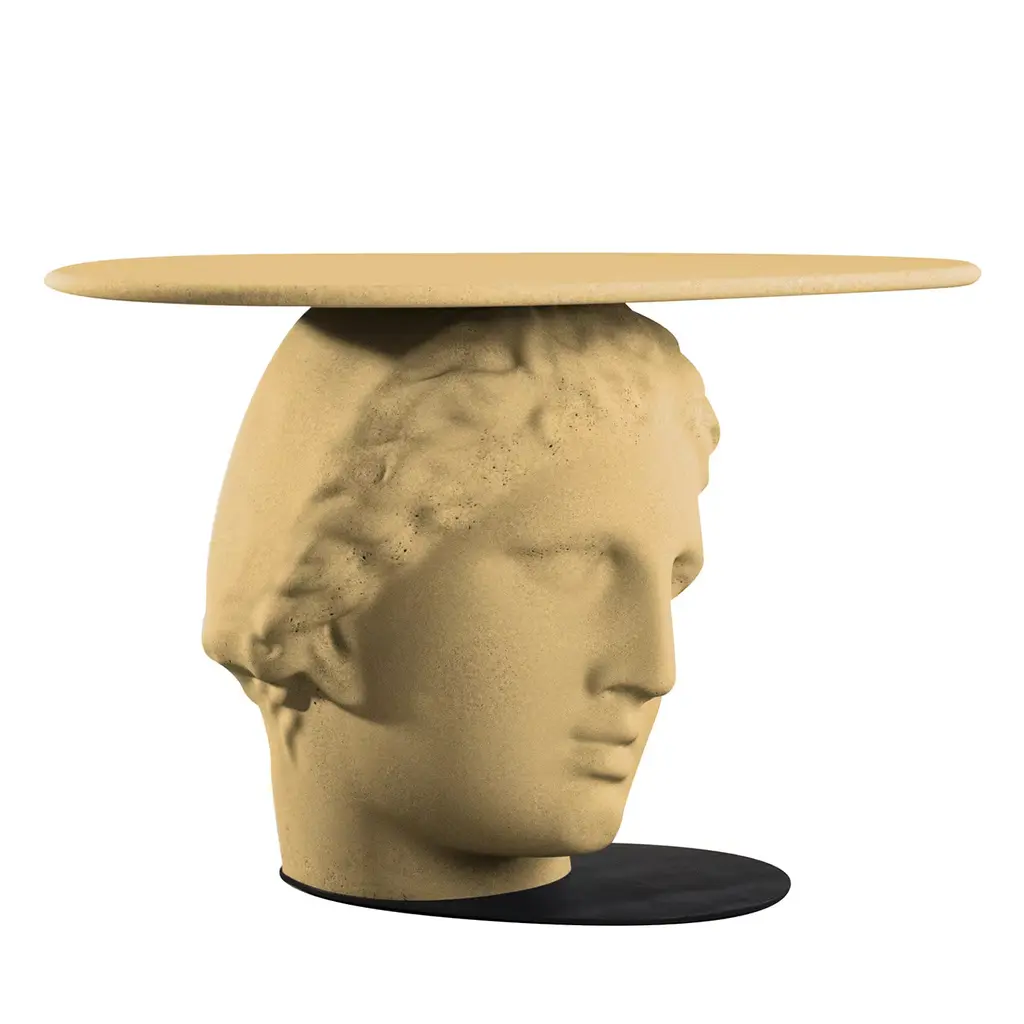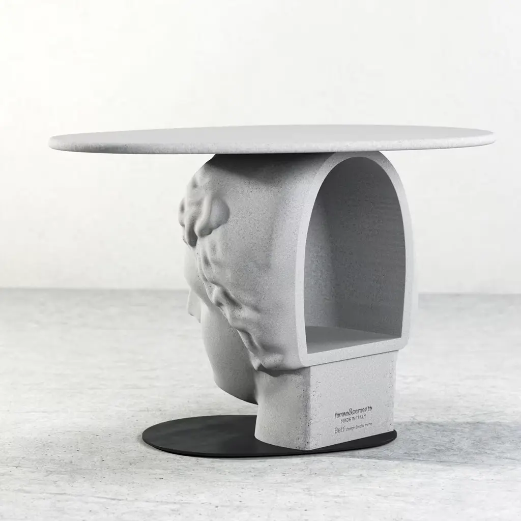 A striking combination of art and design, this coffee table belongs to a singular collection designed by architect Marialaura Rossiello Irvine. Boasting soft and classical lines, it features a female bust supporting a thin oval top. Inspired by French architect August Perret who once said that "Concrete is a stone that is born, and natural stone is a stone that died”, this piece is entirely fashioned of concrete, colored in a mesmerizing silver hue.