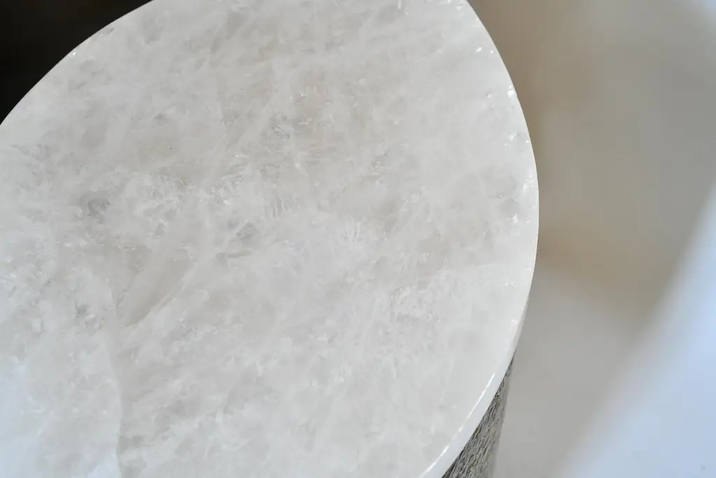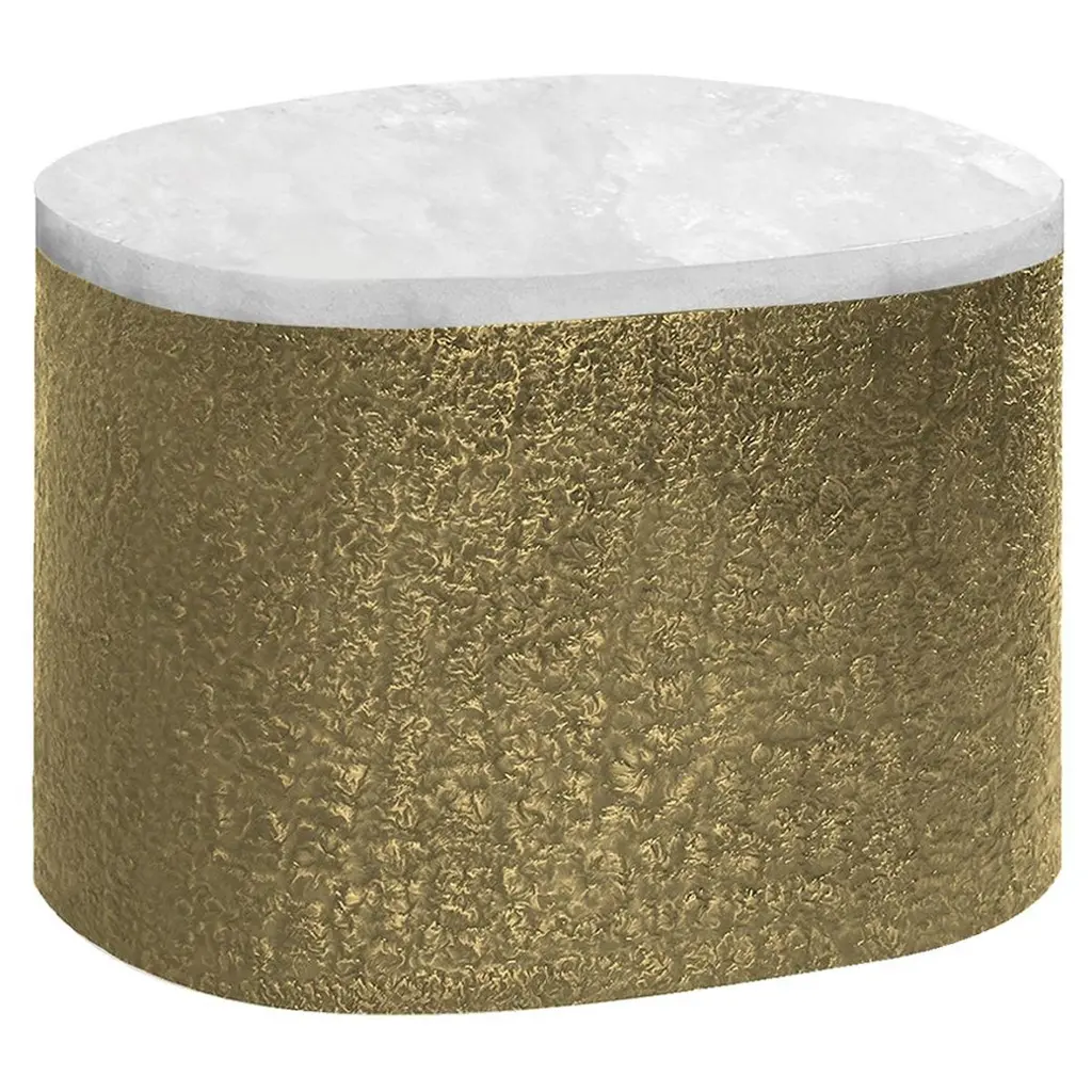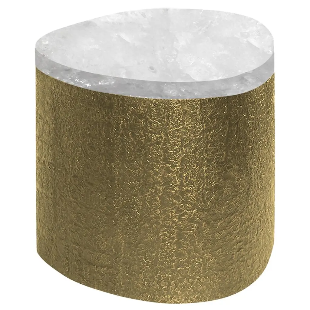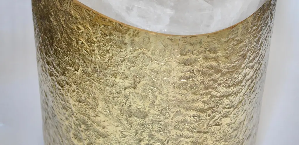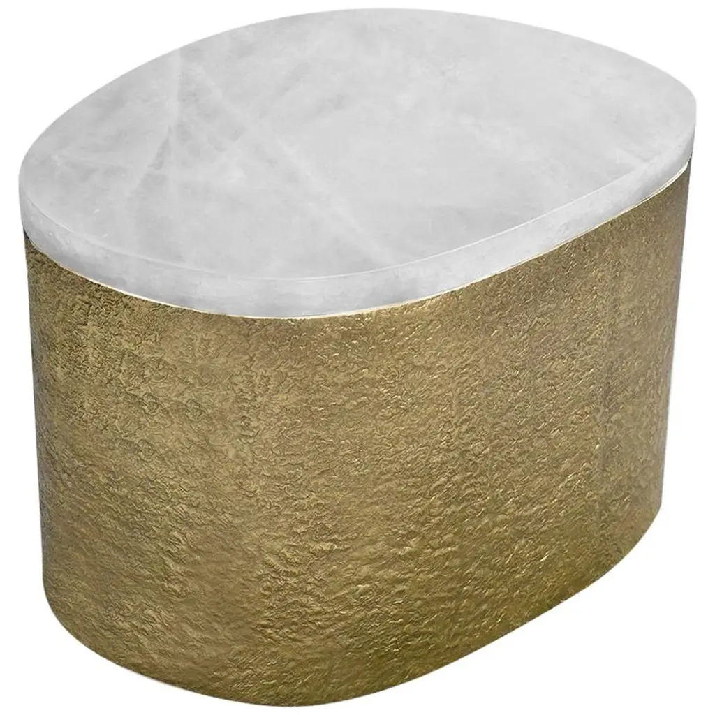 Pair of oval form rock crystal cocktail tables with the hammered brass bases. Created by Phoenix Gallery, NYC.