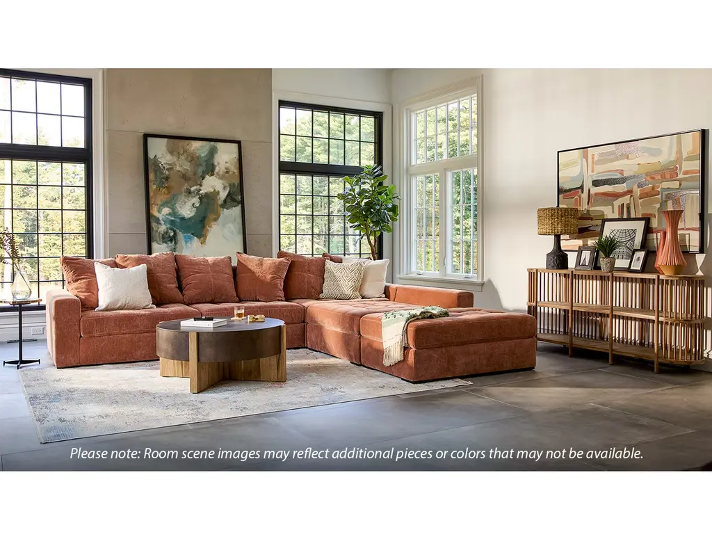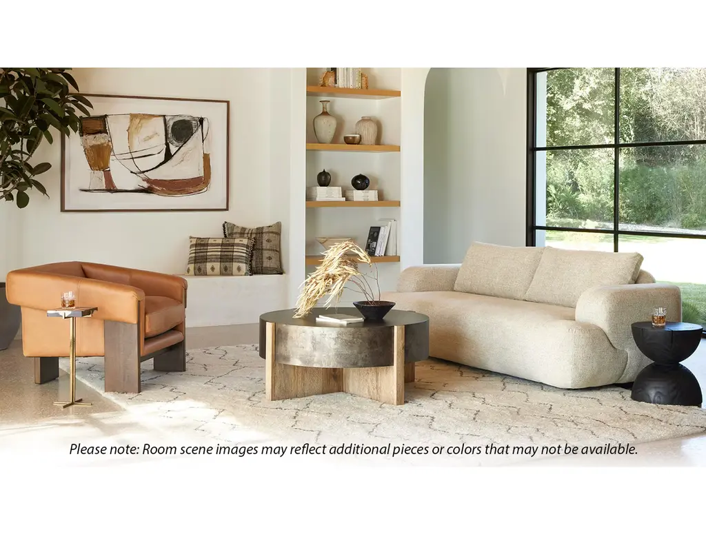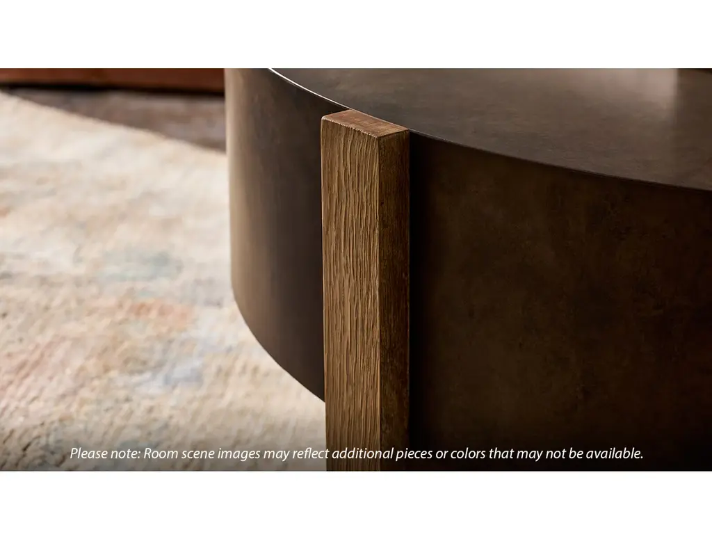 Think outside the rectangle and complete your living room with the Bingham Round Coffee Table from Four Hands Furniture. The thick round top in a distressed iron finish gives it an industrial chic look, and is complemented by a wooden base for an edgy twist.