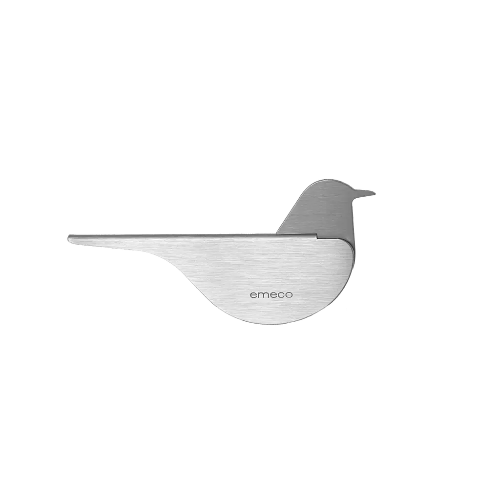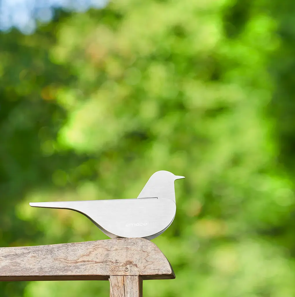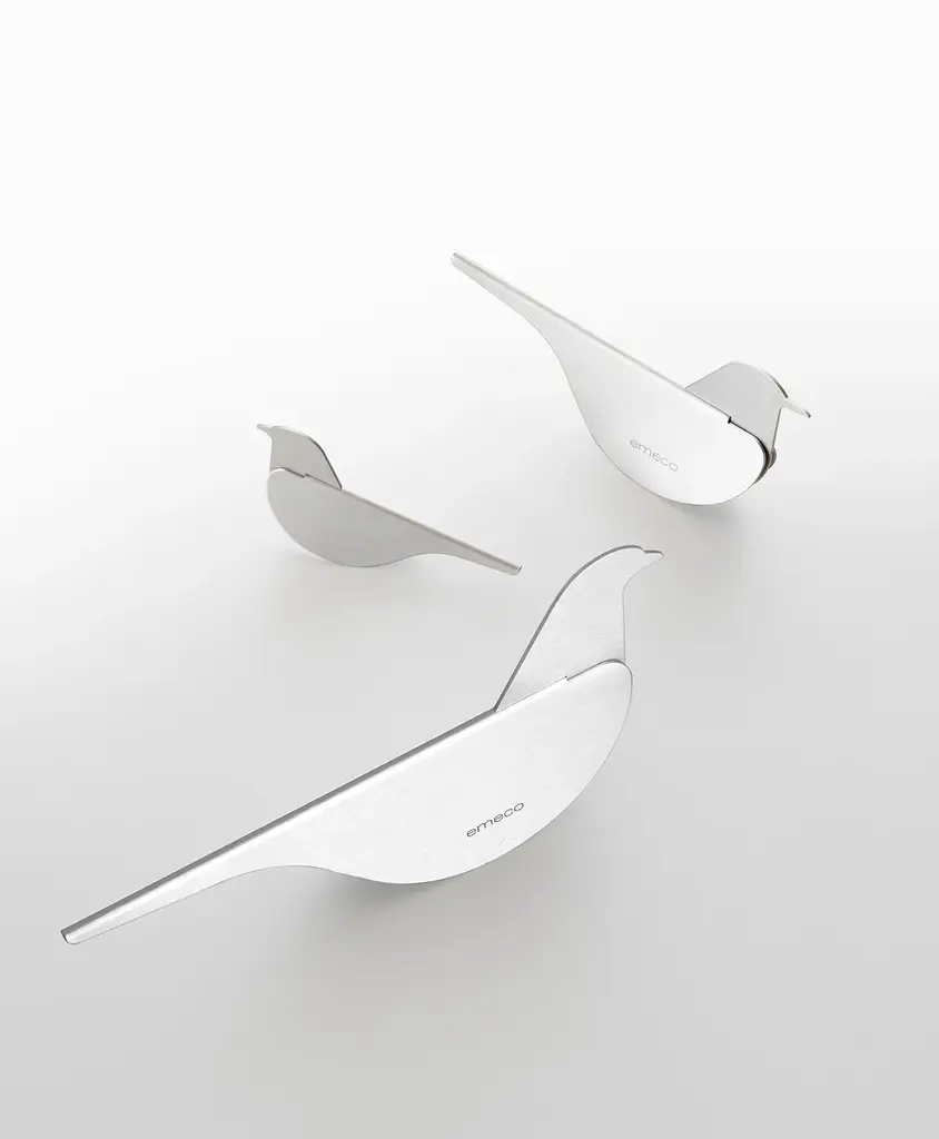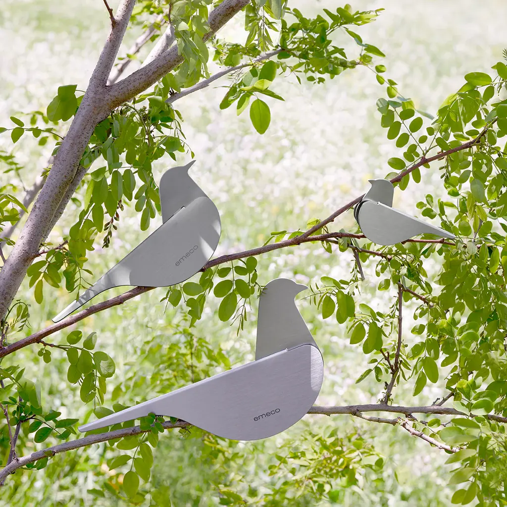 Birds by Yun Li, 2023 Designed by Yun Li, the Birds are made from sheet aluminum in an economic but precise process that expresses the formal quality of the birds with a minimum of elements. The family includes a sparrow, a blackbird and a pigeon, each with its own distinct character. The birds' simple, graceful silhouettes are a natural addition to any setting - on a desk, a shelf, a coffee table or a window ledge. When placed outdoors, the breeze will add a delicate rocking movement to the birds.