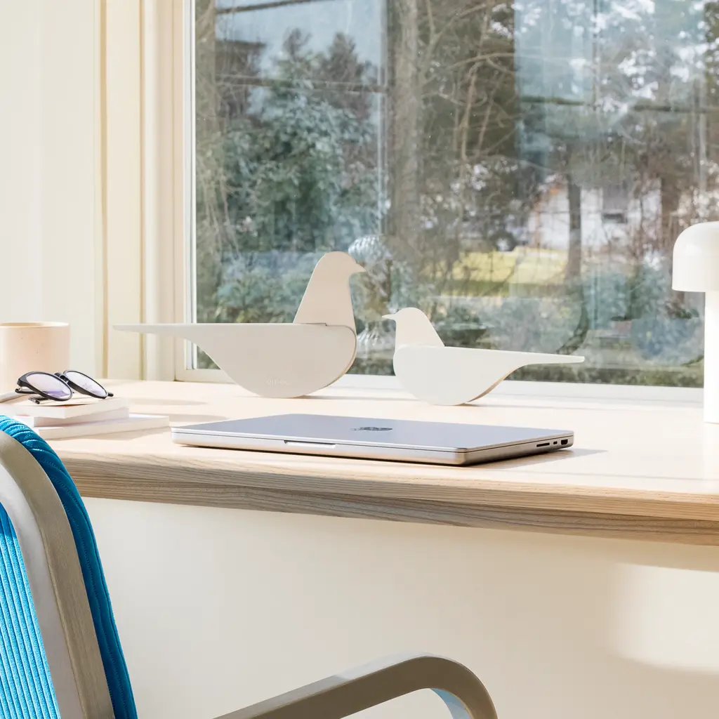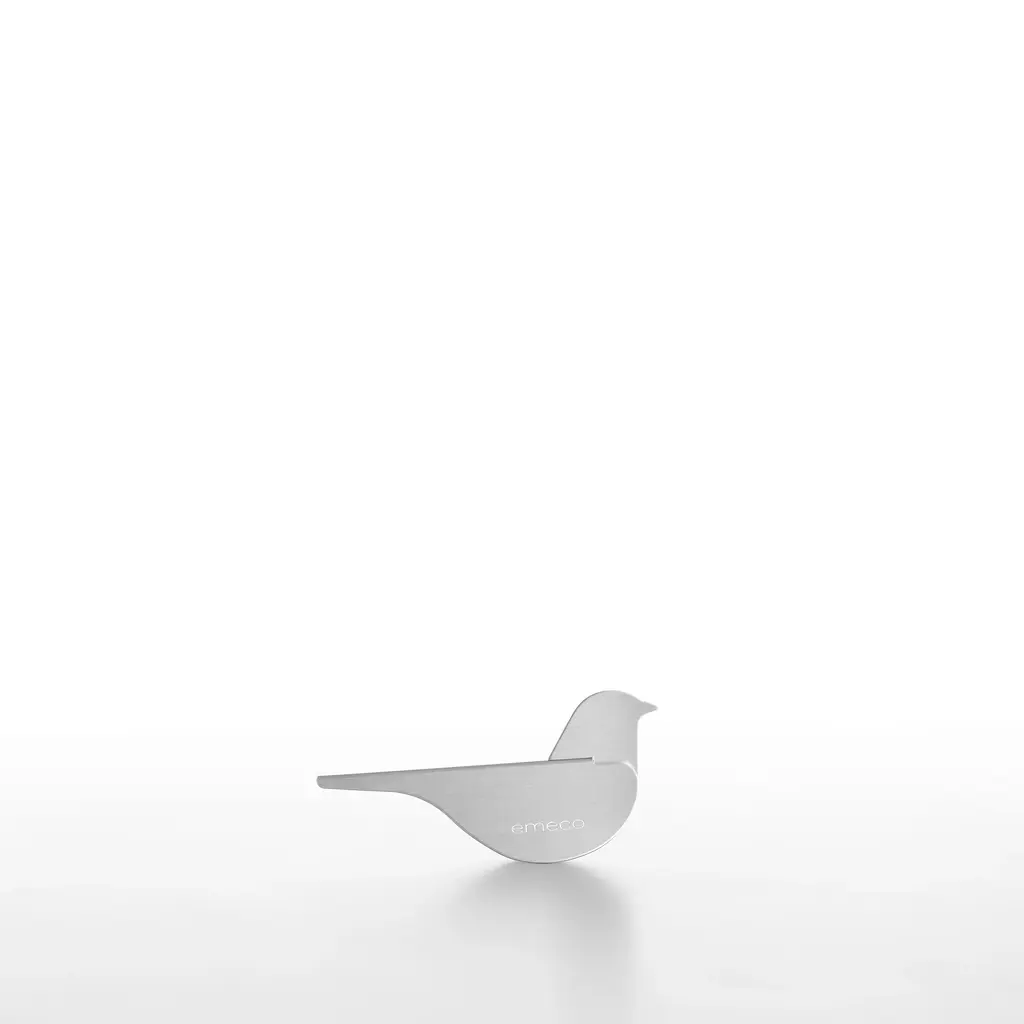 Birds by Yun Li, 2023 Designed by Yun Li, the Birds are made from sheet aluminum in an economic but precise process that expresses the formal quality of the birds with a minimum of elements. The family includes a sparrow, a blackbird and a pigeon, each with its own distinct character. The birds' simple, graceful silhouettes are a natural addition to any setting - on a desk, a shelf, a coffee table or a window ledge. When placed outdoors, the breeze will add a delicate rocking movement to the birds.