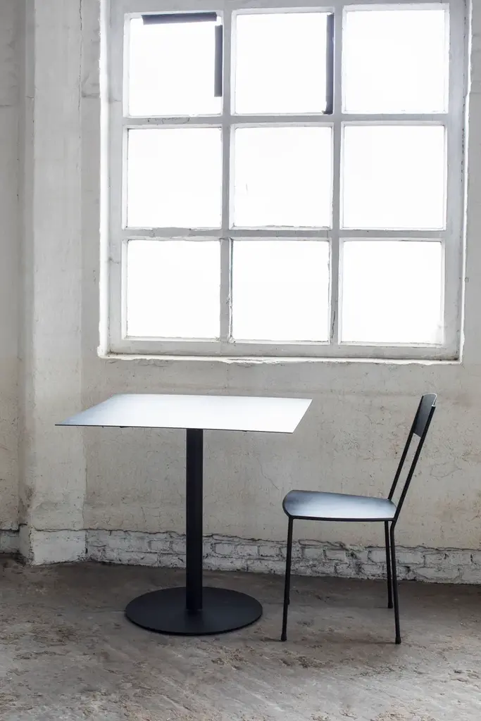 Bistro square table is a round low table made of steel.Her urge for (un)perfect beauty is Bea's greatest drive and forms the basis for a versatile line in interior design, with sober lounge sofas, bean bag chairs, bistro tables, side tables, concrete trays, black steel wall racks, and decorative mirrors and atmospheric lamps in three sizes.Bea Mombaers: "The idea to launch a line of lounge sofas grew very organically. I was looking for an utterly sober sofa with an invisible framework for the B&B. It had to look like a floating seat element with only cushions, in which the frame would completely disappear. Eventually, I ended up ordering a customised prototype for my size. The result was a low one-seater of 90 by 90 centimetres with a heavy metal frame and extra thick cushions in a weather-resistant material. I love taking indoor life outdoors and vice versa. The Bea Mombaers for Serax sofa collection includes a two-seater, a three-seater and a footstool in the same size as the one-seater. All models are produced in black aluminium for better manoeuvrability and equipped with soft, light fawn-coloured cushions for indoor and outdoor. By combining and configuring the various elements, you can create your own seating isle without restrictions."