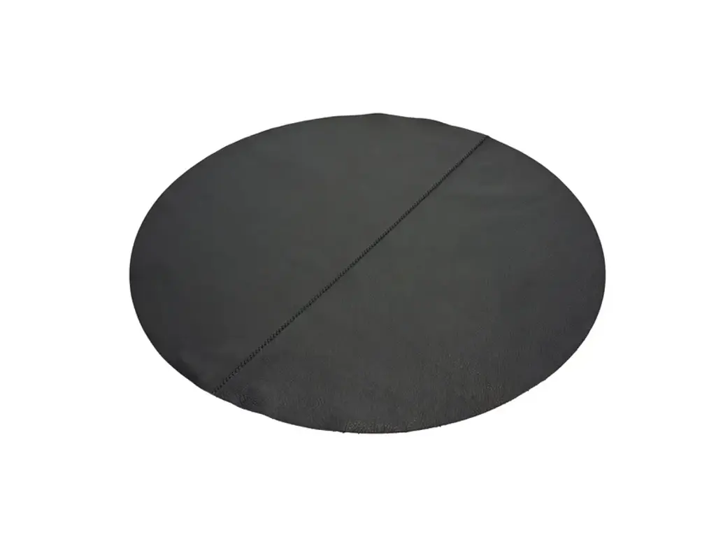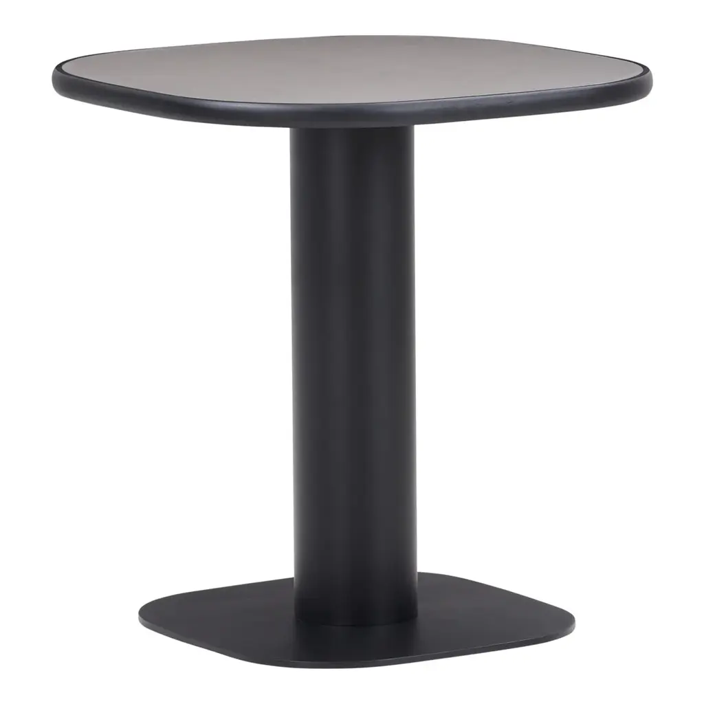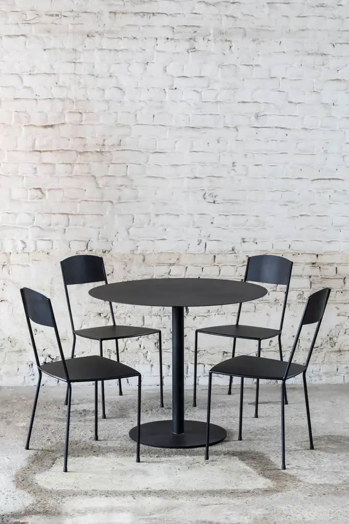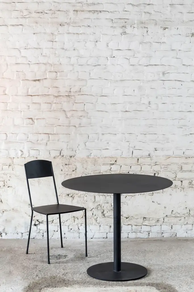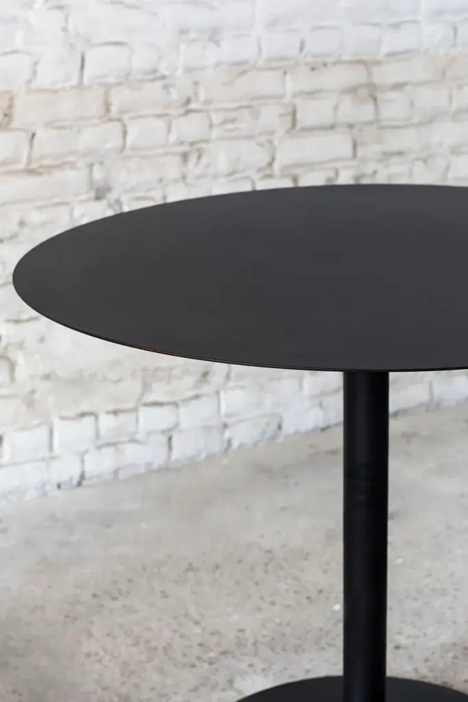 Bistro table is a round low table made of steel.Her urge for (un)perfect beauty is Bea's greatest drive and forms the basis for a versatile line in interior design, with sober lounge sofas, bean bag chairs, bistro tables, side tables, concrete trays, black steel wall racks, and decorative mirrors and atmospheric lamps in three sizes.For her steel table series, Bea Mombaers has designed a sturdy table mat in thick black leather that covers the entire tabletop.Bea Mombaers: "The idea to launch a line of lounge sofas grew very organically. I was looking for an utterly sober sofa with an invisible framework for the B&B. It had to look like a floating seat element with only cushions, in which the frame would completely disappear. Eventually, I ended up ordering a customised prototype for my size. The result was a low one-seater of 90 by 90 centimetres with a heavy metal frame and extra thick cushions in a weather-resistant material. I love taking indoor life outdoors and vice versa. The Bea Mombaers for Serax sofa collection includes a two-seater, a three-seater and a footstool in the same size as the one-seater. All models are produced in black aluminium for better manoeuvrability and equipped with soft, light fawn-coloured cushions for indoor and outdoor. By combining and configuring the various elements, you can create your own seating isle without restrictions."