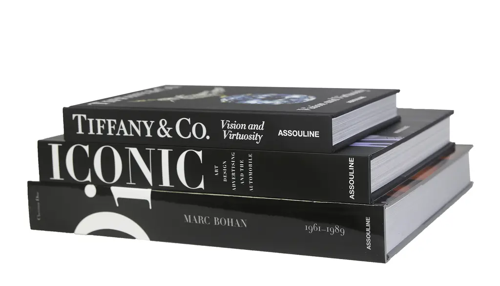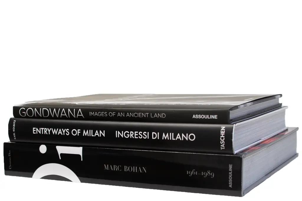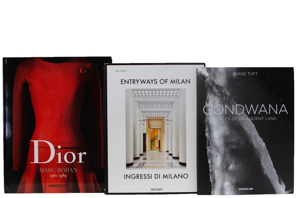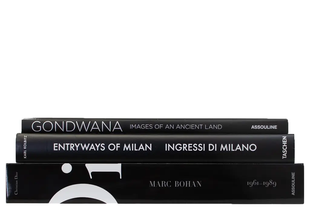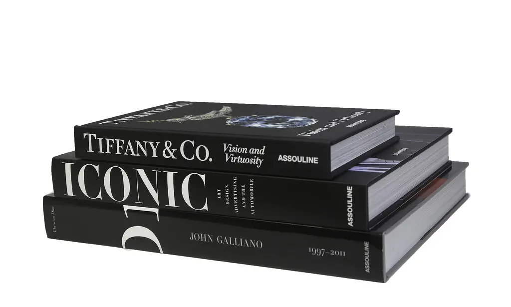 Assouline luxury coffee table stacks add a chic personalized touch to any room. A trio of luxurious coffee table books with unified bold black and white spines. Featuring a artistic close up of design, and Dior couture.