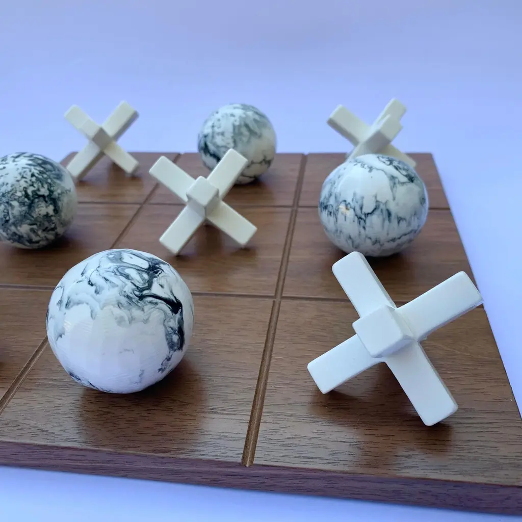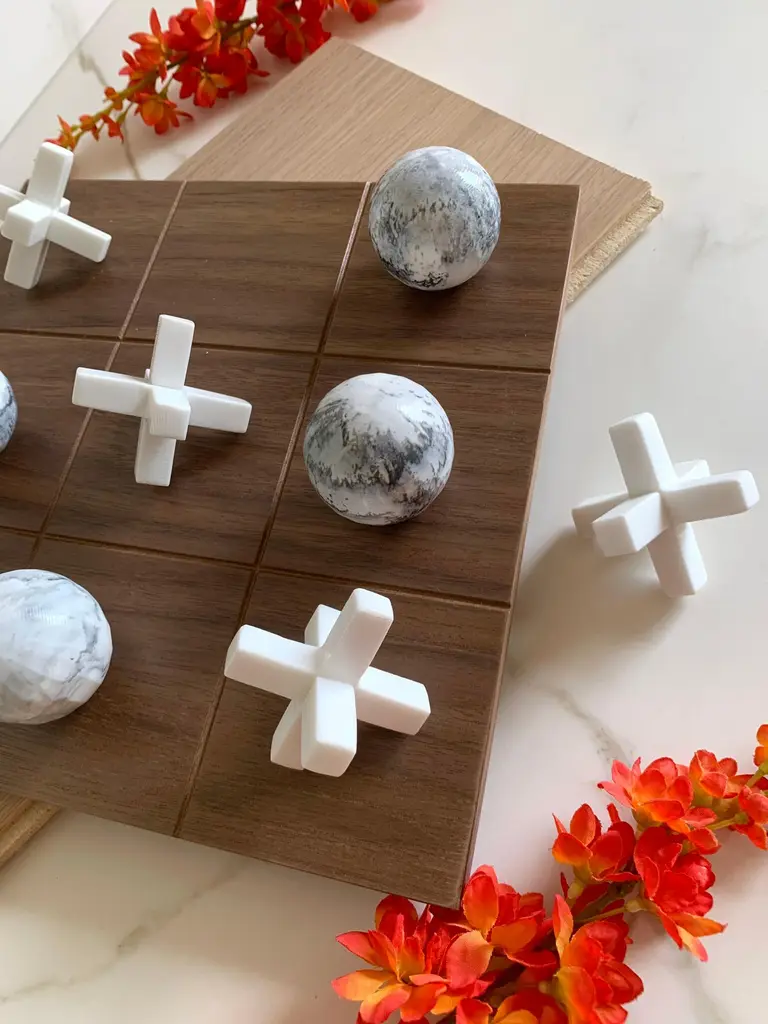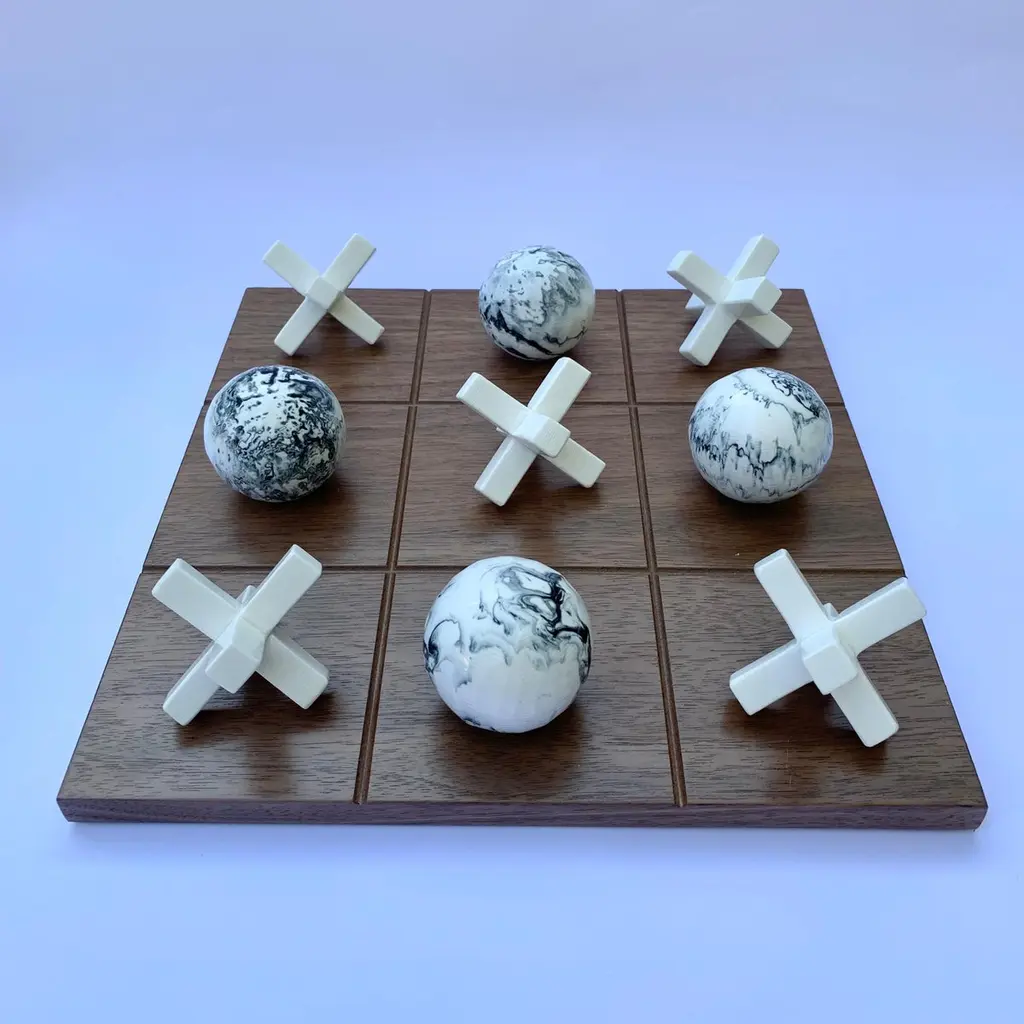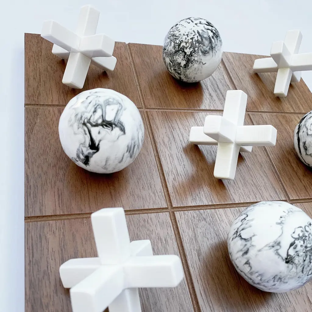 Our Tic Tac Toe is a beautiful, modern and fun take on the classic game. The three dimensional pieces are handmade in white resin with black marbled texture and the board is made of oak wood veneer. It will be the coolest statement piece on any coffee table.Materials: Resin and oak wood veneerIt contains 9 three dimensional pieces and 1 oak veneer board.Designed by Paola Valle and manufactured in Mexico City by extraordinary artisans. Our goal is to work hand by hand to create outstanding pieces that will represent our passion.Please avoid placing your resin pieces in direct sunlight to avoid discoloration. All resin items are strong and durable but should be treated with care as they can break if dropped or knocked against a hard surface. Colors may vary slightly to the item shown in previous photos, as everything is handmade.Due to the nature of the material every piece will be unique and aesthetically different.