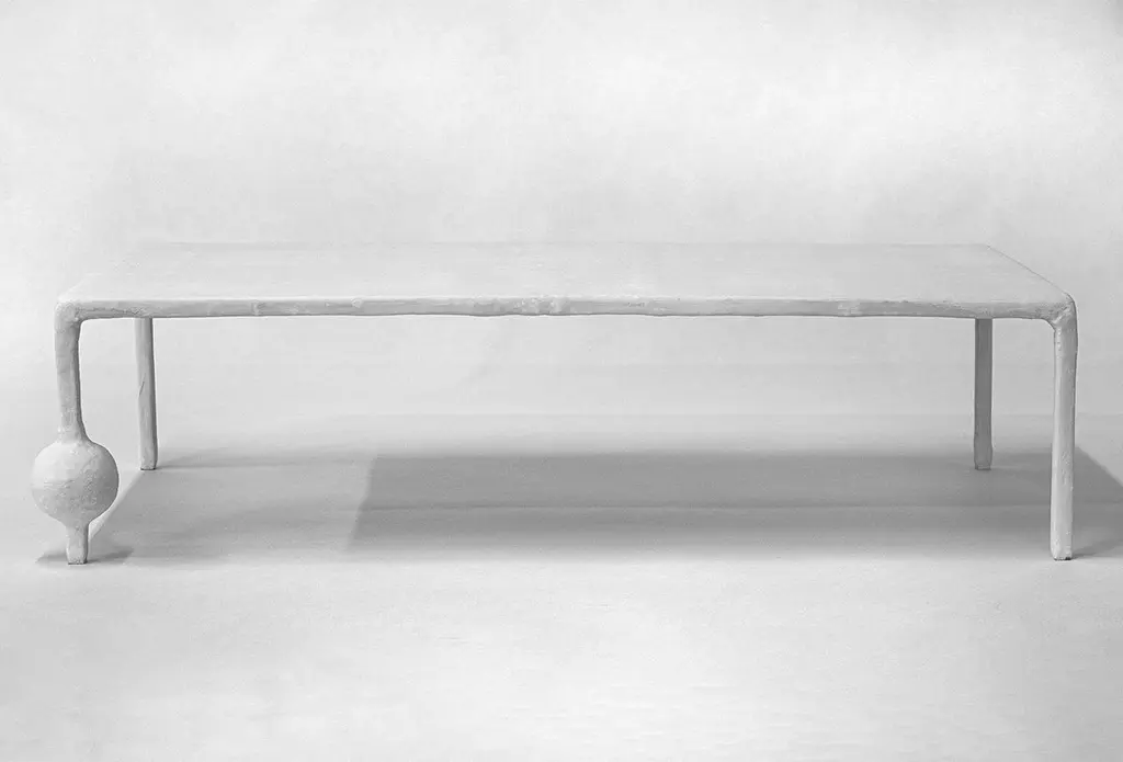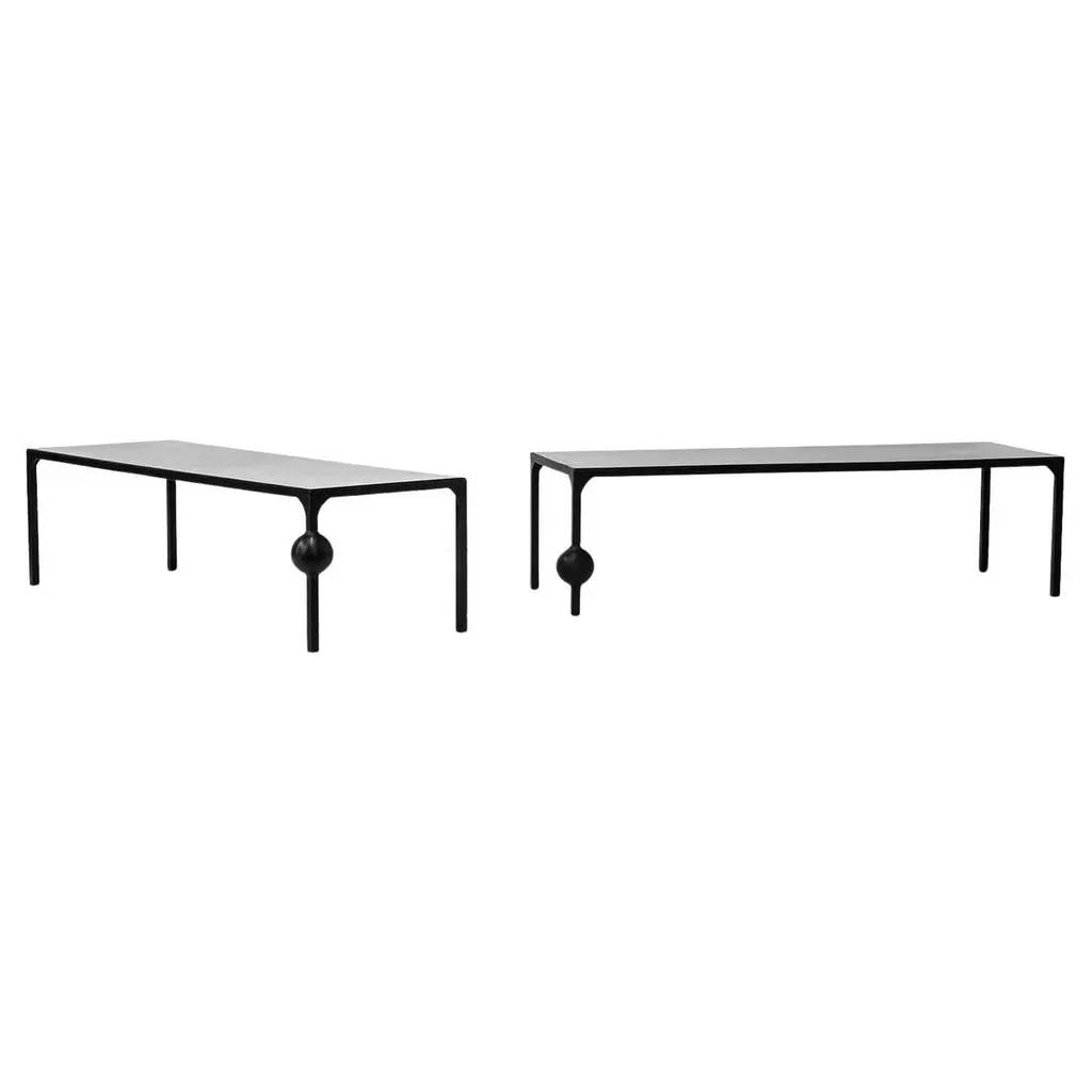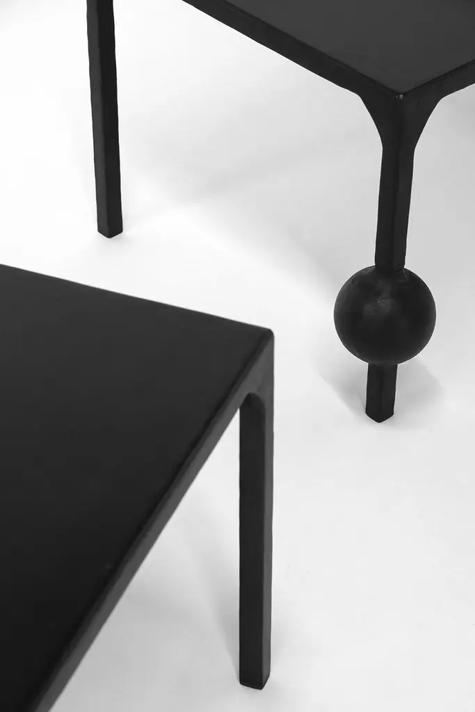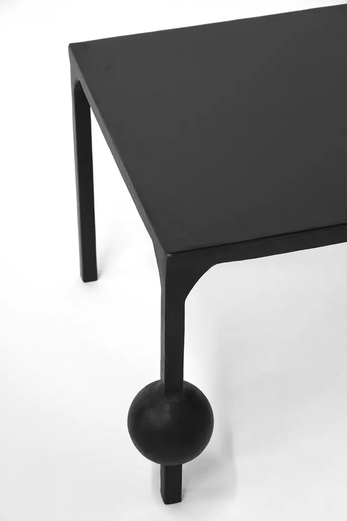 TABLE NO. 2 - COFFEEJ.M. Szymanskid. 2024This geometric, solid, steel structure is supported by a cast-sphere base. The refined simplicity of this design speaks volumes, and adds depth and elegance to any space. Custom sizes and plaster finish available. Made in the Bronx, New York, USA.Our products are fabricated and finished by hand, so variations in size, shape, and patina color are a natural result of this process. Tooling marks and surface scratches are part of the character of many finished pieces. All products are sealed with oil and wax, which, over time, are not impervious to moisture. Our blackened steel pieces installed outside or in areas exposed to moisture indoors, especially in marine environments, will rust. Condensation from hot and cold drinks will leave rings on blackened steel table tops. Coasters or placemats can protect the finish. Periodic maintenance of blackened steel items may be required.