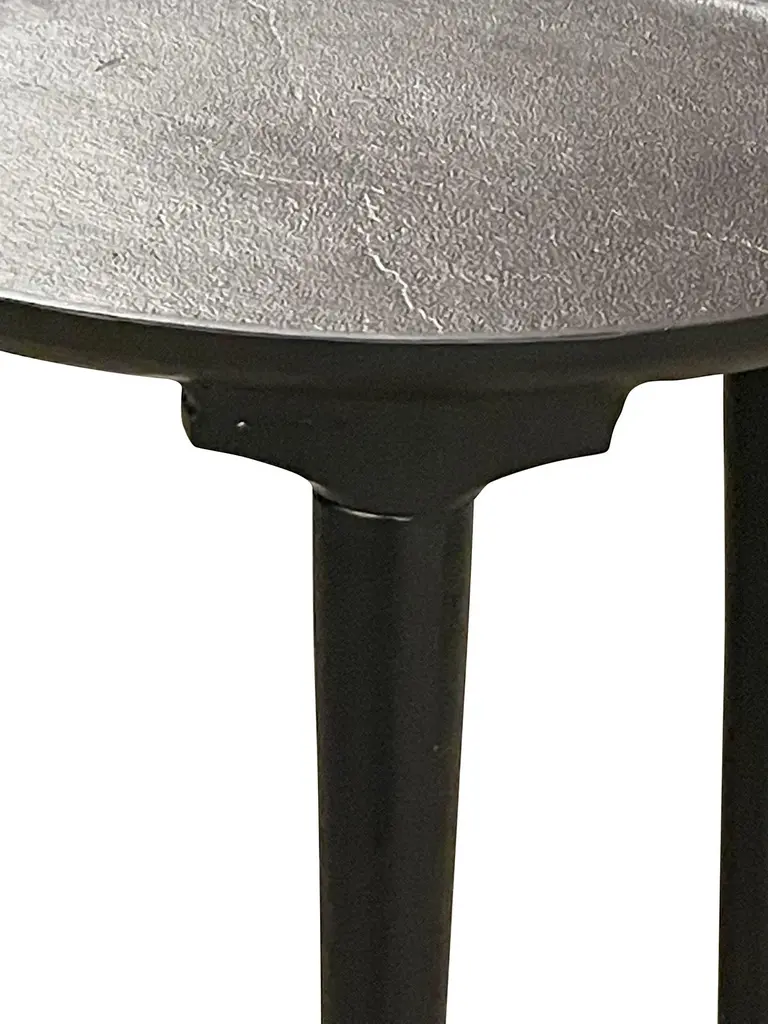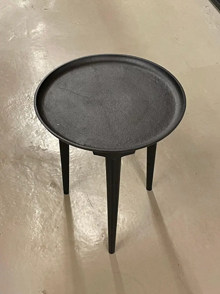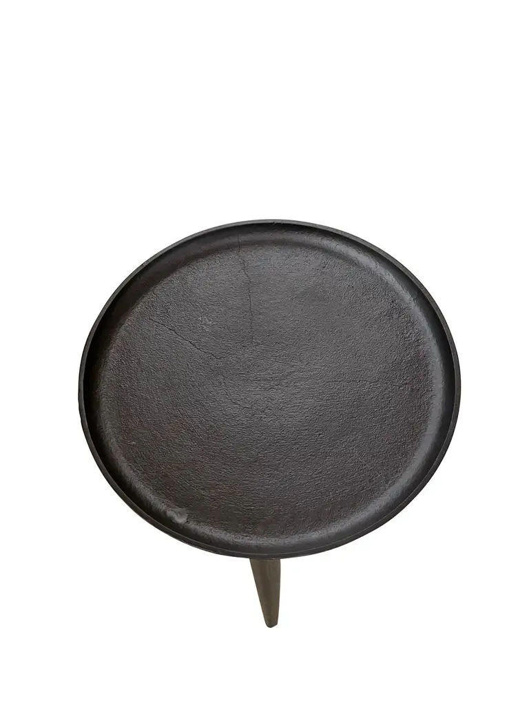 Contemporary Indian black iron round coffee table.Three tapered legs with T shape designed top.Slightly textured finish.Raised lip detail on top border.Also available as a coffee table (F2913)ARRIVAL APRIL