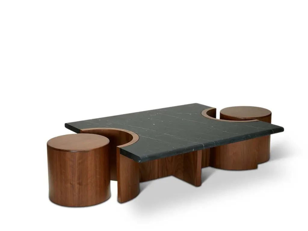 The prospect coffee table features a stone top that rests atop a sculpted American walnut or white oak base with two cutouts for drum tables on either end. The Lawson-Fenning Collection is designed and handmade in Los Angeles, California. Reach out to discover what options are currently in stock.Dimensions: 64" W x 40" D x 15" HDrums: 16" diameter x 15" height.