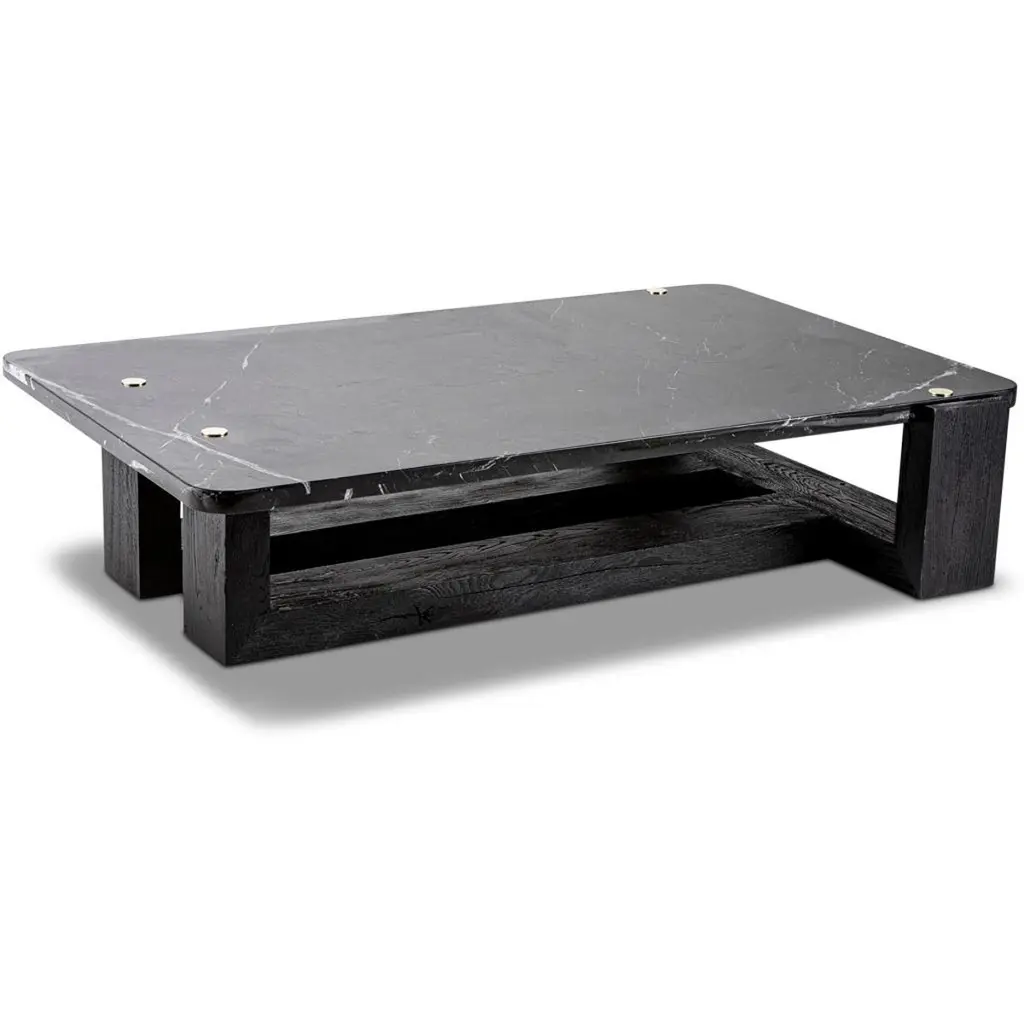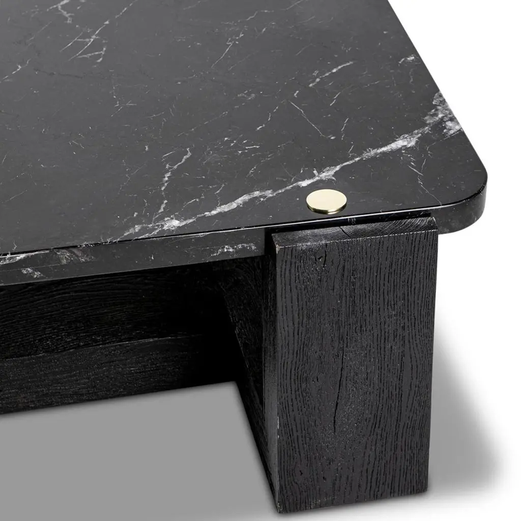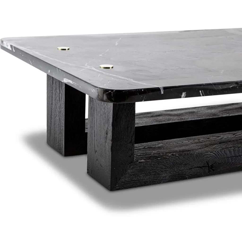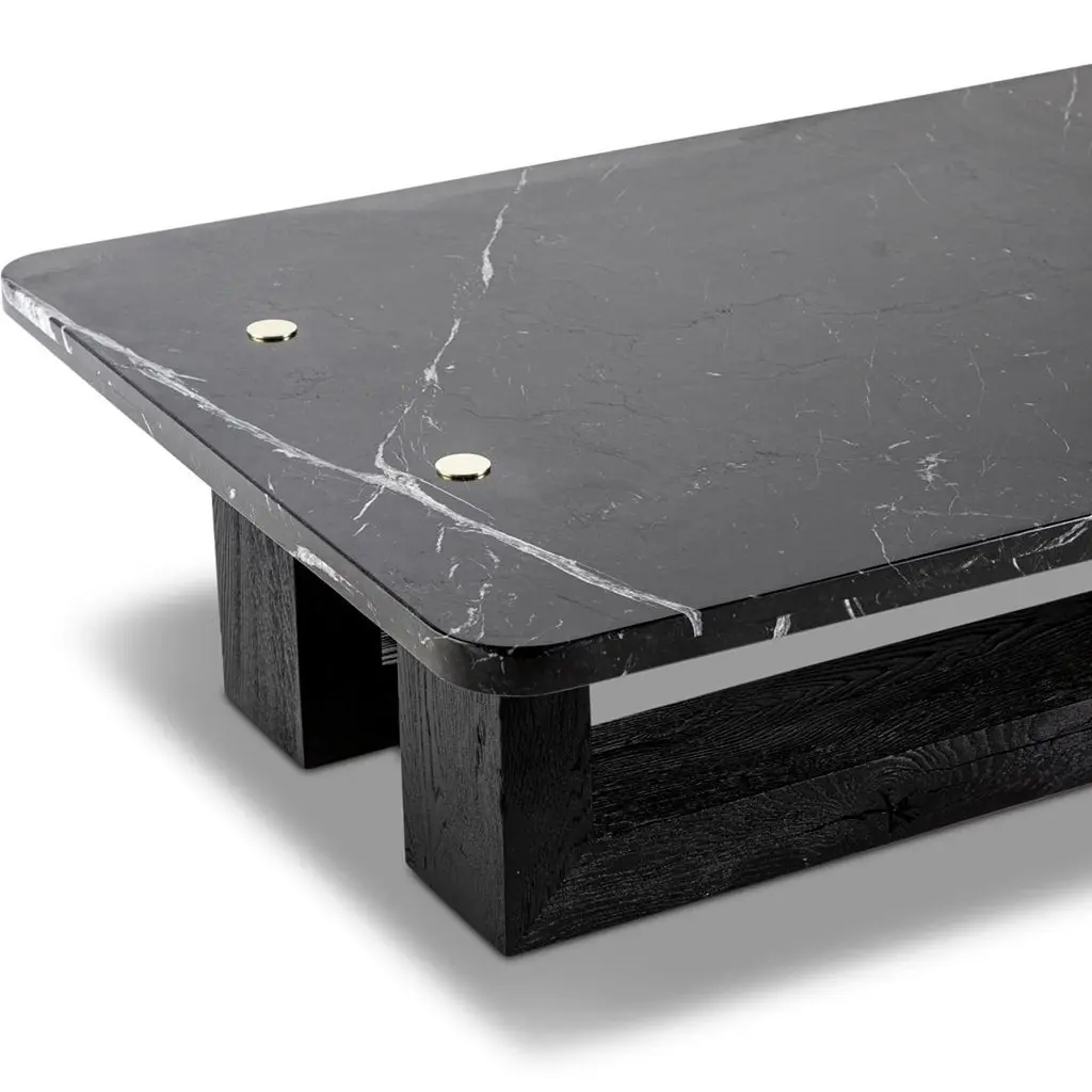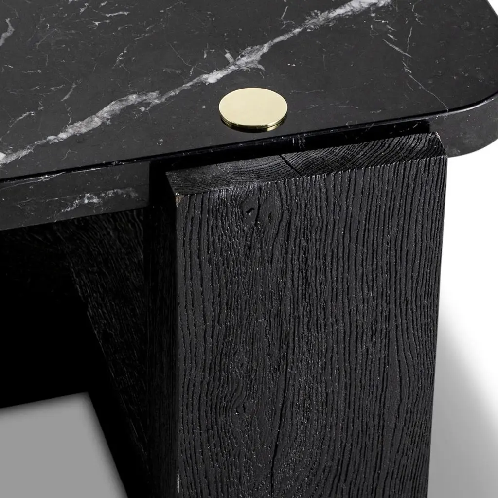 The modern jewel coffee table is designed by Egg Designs and manufactured in South Africa.This high end, contemporary and bespoke coffee table is evidence of Egg's unique and exploratory approach to materials.The tabletop is a black nero marquena marble, which is placed on a Brutalist base, crafted from solid French oak cants. The oak is ebonized to create a rich black surface. The black marble top and the ebonized Oak base are held together with custom designed, solid brass screw fixings.The visual simplicity of this coffee table ensures that it fits equally well in a modern, minimalist or mid-century modern home. There are many customizable opportunities, you can change the size as well as selecting alternative timbers and/or marbles.