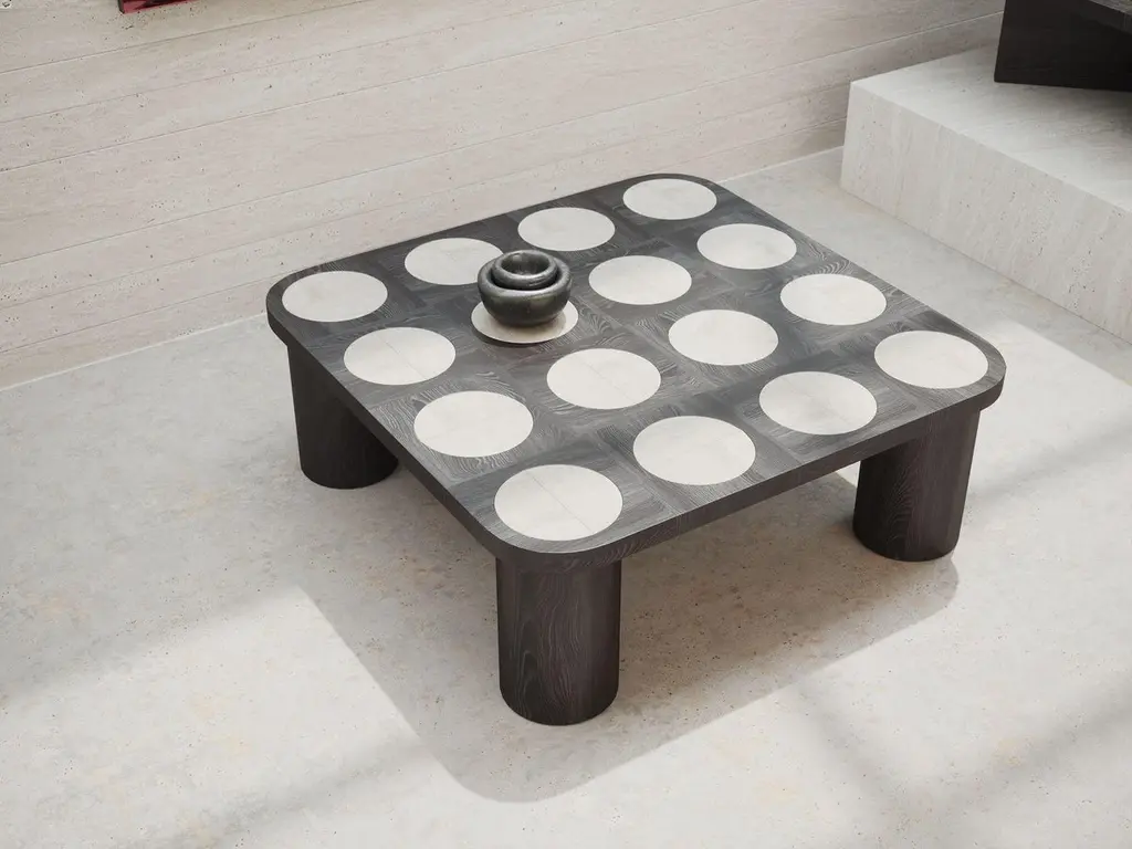 Dama Ocassional Table in Black Oak with Travertine Inserts by UltramobiliDimensions: W 104 x D 104 x H 38 cmMaterials: Black Oak structure with natural travertine inserts.Circle and square, black and white – let’s play! Coffee table DAMA is a game of shapes and textures. Black Oak structure with natural travertine inserts.Ultramobili:Tactile materials and exclusive finishes, advanced functionality and uncompromising quality define the character and soul of each creation, the best business card with which ULTRAMOBILI furnishings present themselves to the world. ULTRAMOBILI collaborates with a group of highly selected craftsmen, closely connected to their home territory, Pesaro. It is from their manufacturing skills that all the brand's furnishings take shape, in a continuous exchange of skills that focuses on design ability and the intelligence of the hands. ULTRAMOBILI employs an international team of designers who every day imagine, design and create - with talent and passion, dedication and visionary spirit - all the brand's furniture: architectural sculptures that become iconic objects and furnishings for living. ULTRAMOBILI's credo is quality without compromise. An uncompromising vision that expresses itself every day in the choice of excellent materials and finishes, in the obsessive care for every single detail, in the constant search for advanced functionality and in the incessant striving for cutting-edge, unique and unmistakable design. ULTRAMOBILI also produces tailor-made projects, ad hoc creations capable of meeting the most intimate and profound needs of those who enter the brand's universe. Bespoke furnishings that are born in close connection with the architectural envelope that houses them, and that dialogue with the surrounding environment in the volumetric relationships of their components, in the materiality and colour nuances of the materials, in the chiaroscuro effects of the volumes and in the visual communicativeness that distinguishes them.