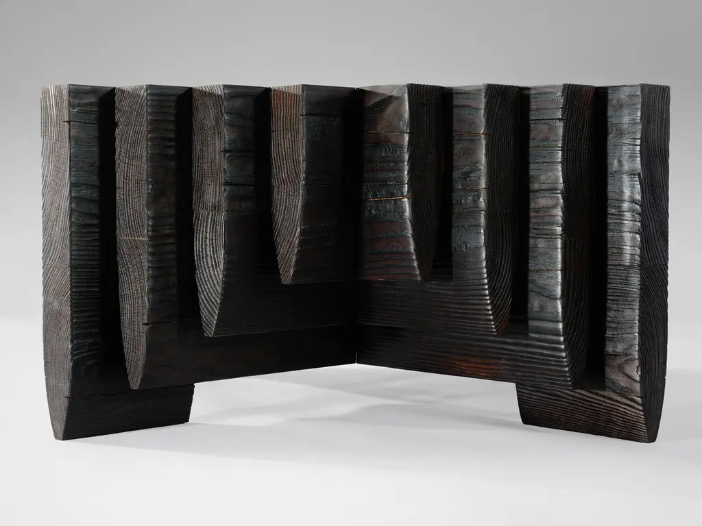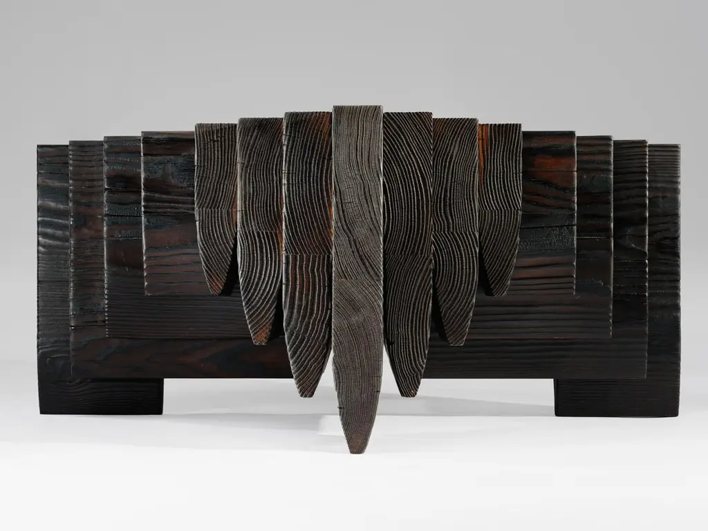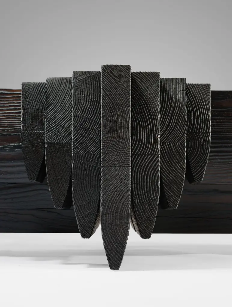 This sculpture is obtained through extensive research into the properties of Yellow Pine. It consists of ellipses, which are sawn against the grain so that the characteristic wood grain of Yellow Pine is made visible. This specific wood texture is created by the play between the flaming plain sawn wood and striped quarter sawn wood. Then the age-old technique of ‘Shou Sugi Ban’ is applied to the furniture. A technique in which the wood is burned and thus charred. Again, Yellow Pine forces a unique result, because the difference in softness between its spring and summer wood is so intense. This creates a deep structure and a subtle hue in brown, black and even gold. This furniture is interesting to behold and experience from every point of view. Each side reflects a different feeling and a different composition.Tim Vranken is a Belgian furniture designer who focuses on solid, handmade furniture. Throughout his designs the use of pure materials and honest natural processes are paramount. The result is an unconcealed interplay of lines and shapes, without the slightest frills. To make sure the furniture meets up to all of his ideas, Tim builds every piece himself.