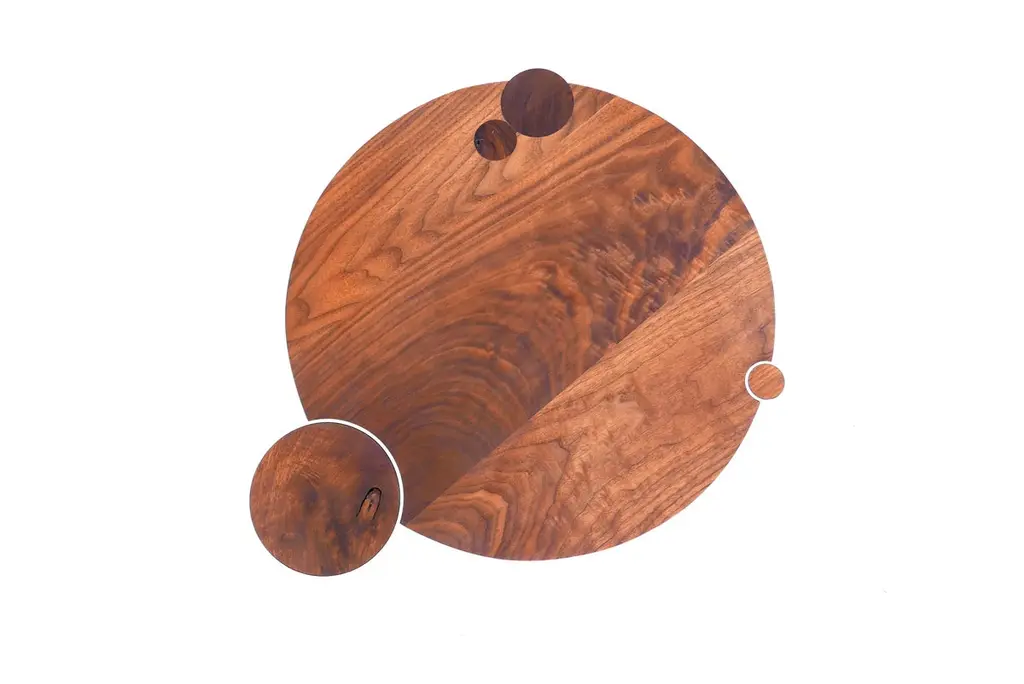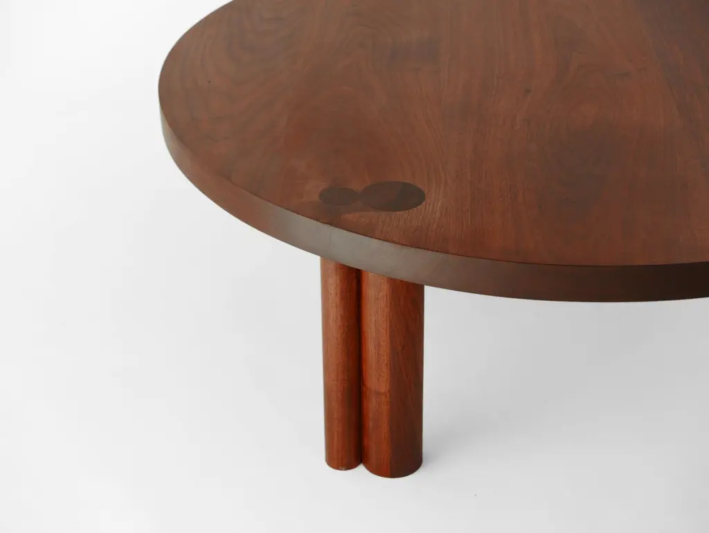 This 48" solid American black walnut coffee table with feature copper plated steel leg is inspired by the sun’s apparent orbit around the earth, the table legs exposed on the top surface create a celestial composition. The table top is made out of solid American black walnut and features a 6" and 3" copper plated steel legs alongside 2 additional solid wood legs. Hinterland Design's "Ecliptic Table" is also available in whitewashed Canadian white ash, and a smaller 36" round coffee table and a 24" round side table, all of which are 14" high. The legs are customizable be either blackened, brass or powder coated steel or hand glazed ceramic leg (+$1150). See Hinterland's other 1stdibs listings for more information or contact Hinterland Design to discuss customization options. Hinterland designs and manufactures each of their pieces in its Vancouver, Canada workshop.