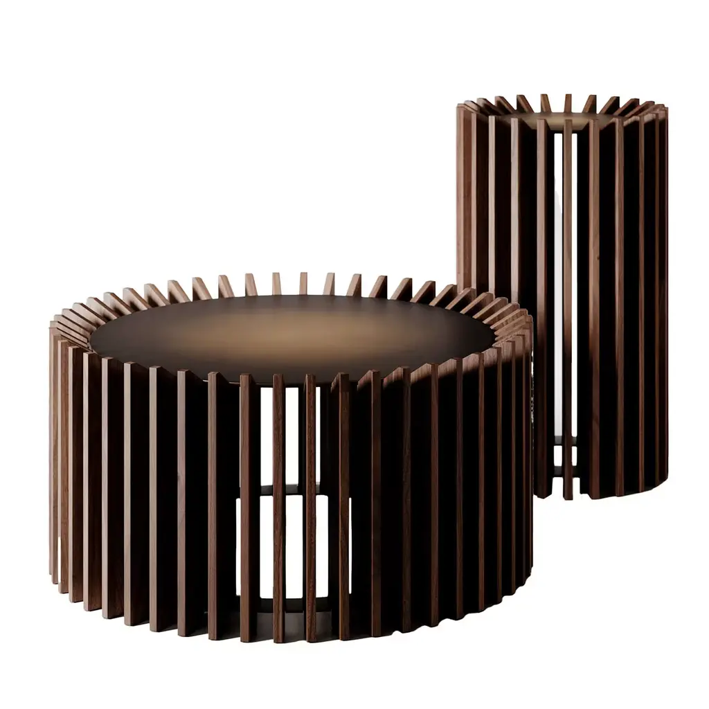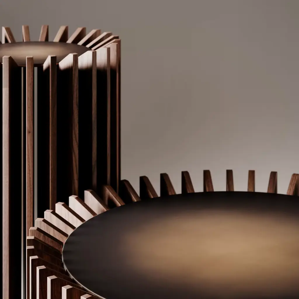Light filters through the openings of the Blade Coffee Table, casting playful shadows on nearby surfaces. Radially arranged Canaletto wood slats provide support and frame the elegant burnished metal top. Blade can function as a standalone piece or as part of a larger system.